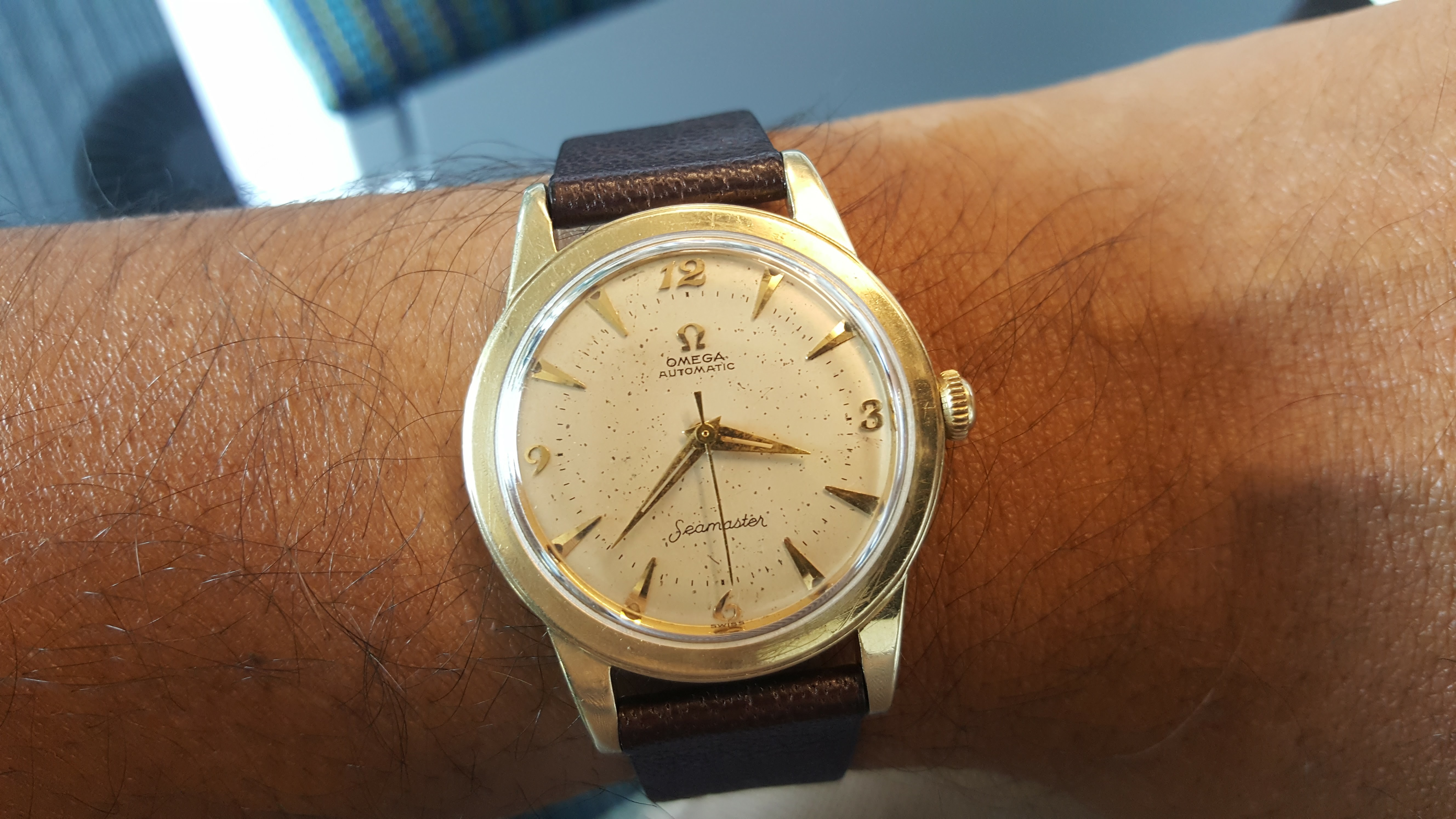 Posts 202 Likes 1,836 wannabeWC ·Oct 26, 2016 1950s Seamaster with a Caliber 500 in a 14k contract case... This was a loving restoration, the watch had sat without a crystal and a seconds hand for no-one-knows how many years. Untouch dial, new crystal.