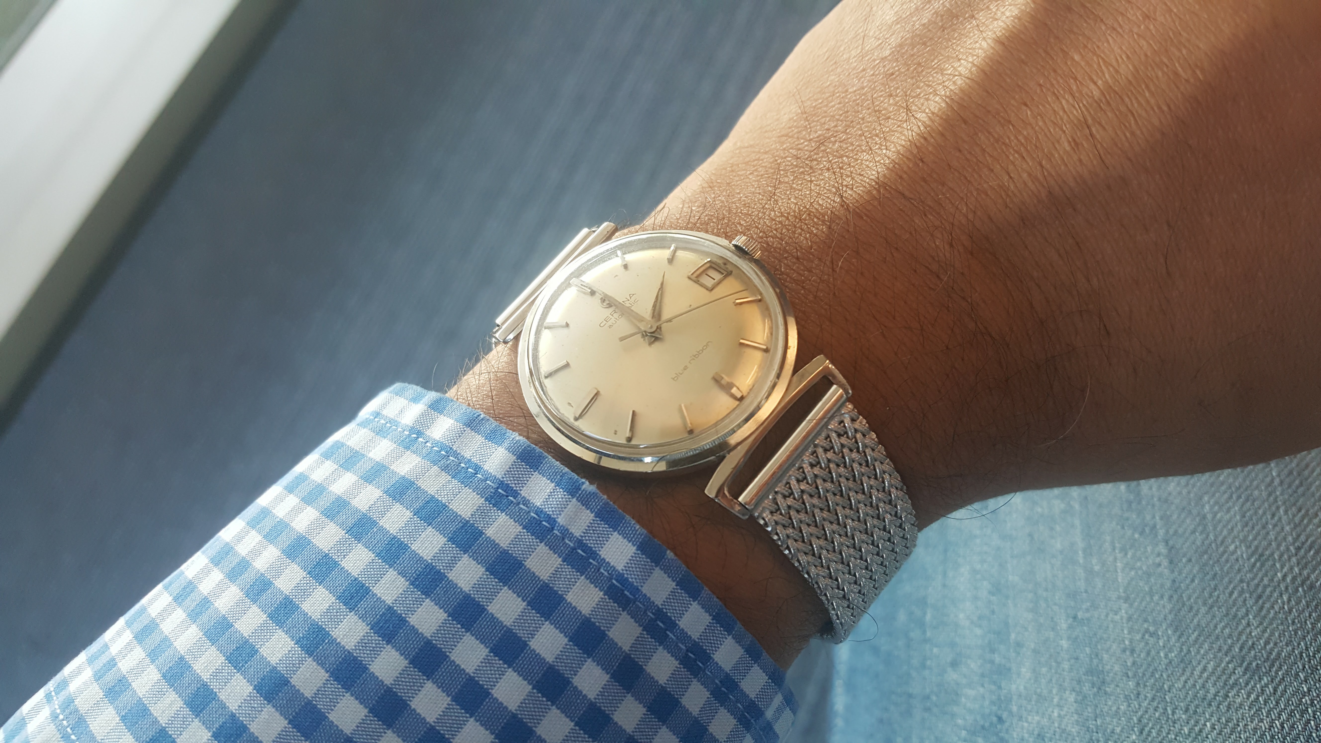Posts 202 Likes 1,836 wannabeWC ·Dec 1, 2016 Certina Blue Ribbon with the thin automatic 25-651 movement in 18k white gold with matching custom bracelet. A rather special watch to me, I've never come across another one like this on the internet or in the metal.