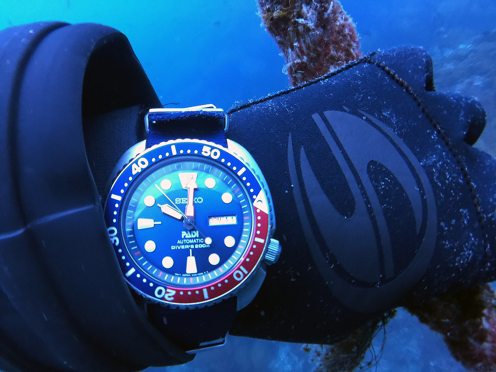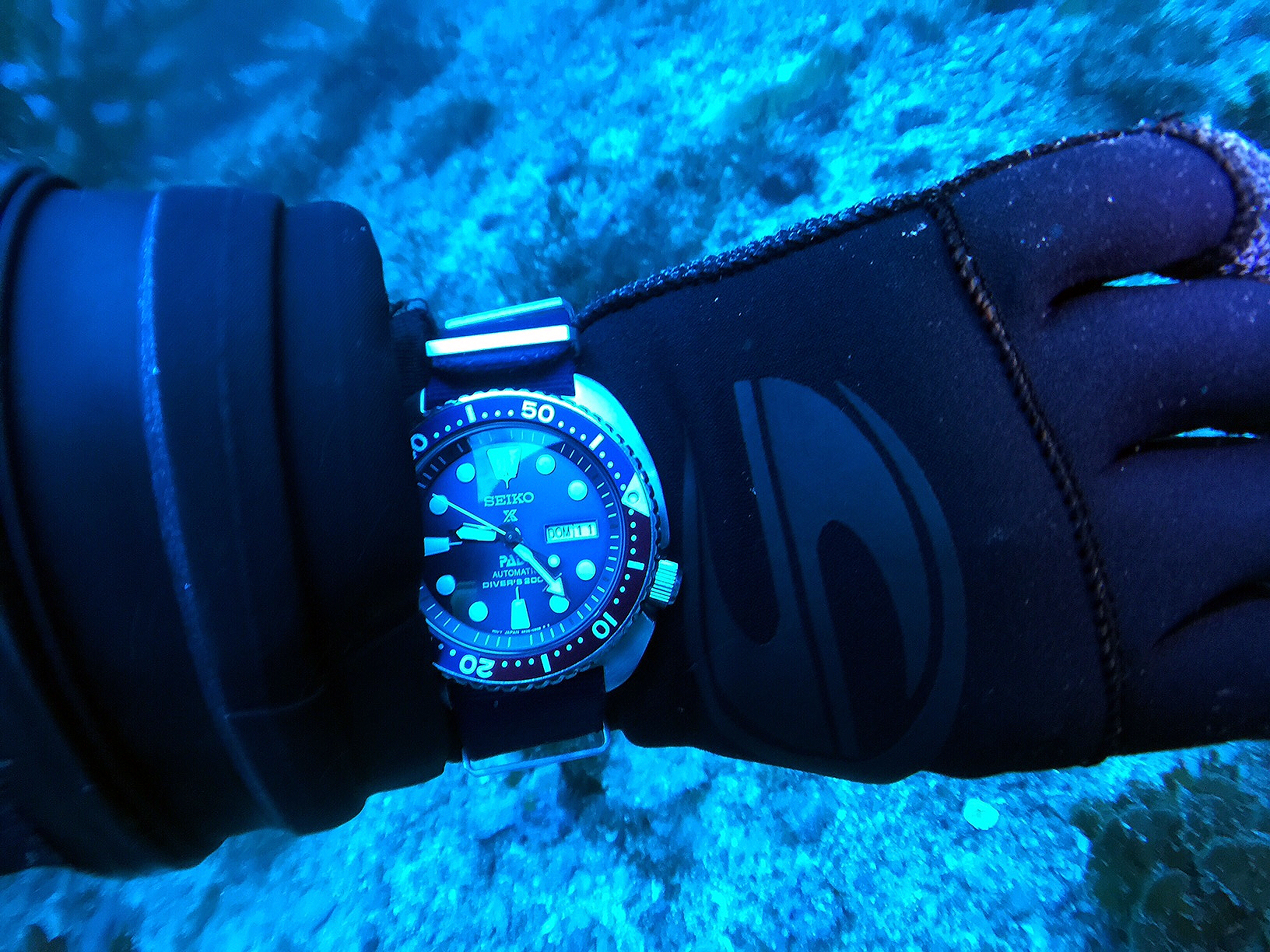 I'd been wanting to wear this one in the ocean from the day it arrived in the mail. It's essentially a SRP777 with a special paint job. The photo was taken at a depth of 20m (65ft) so the jazzy colours of the bezel and dial had all homogenized to a ghostly blue.