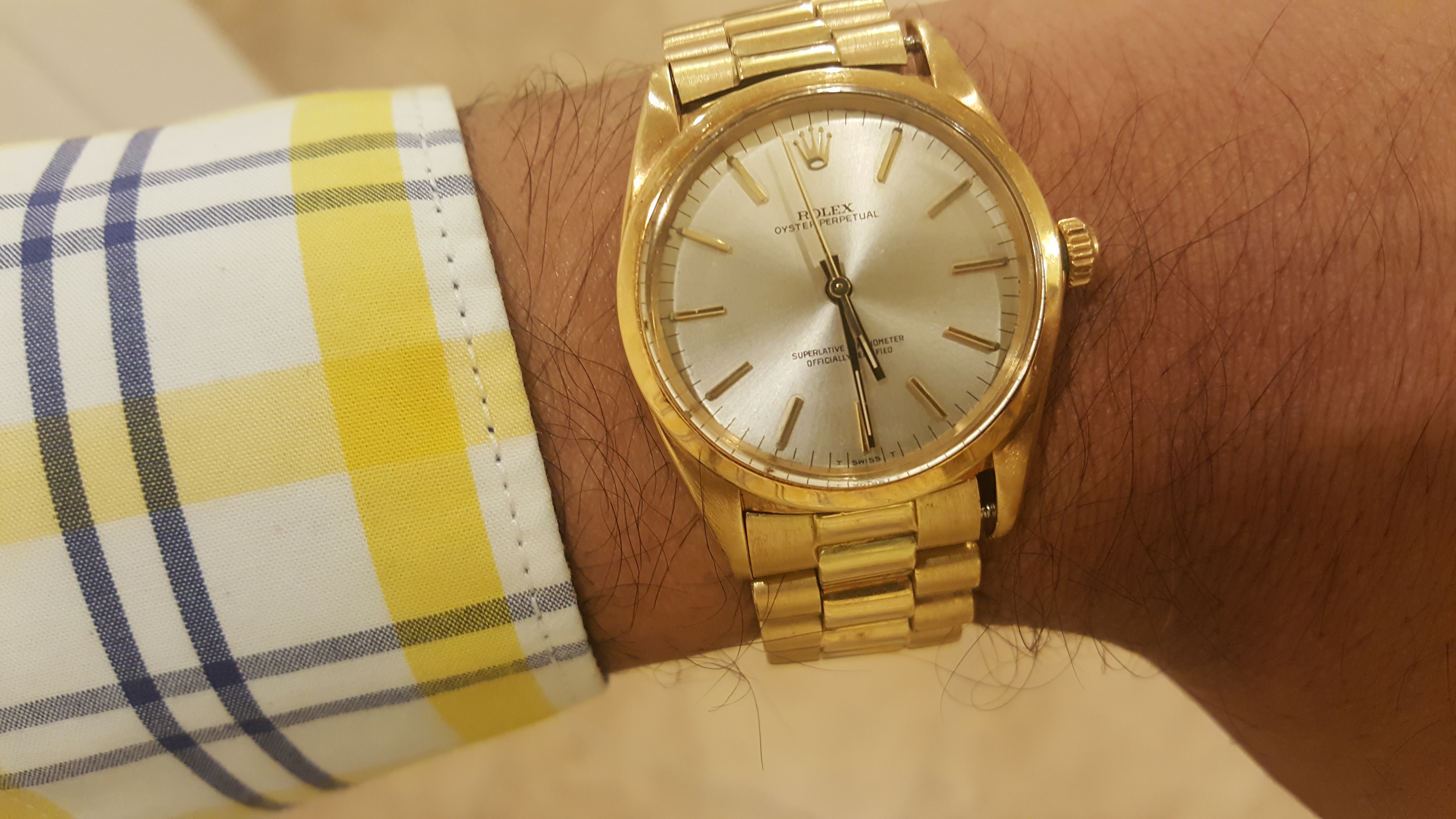 An uncommon (36mm, smooth bezel) no -date Oyster Perpetual in 18k on a refurbished/tightened president bracelet. The bracelet had an incredible tightening job, but someone went nuts on the endlinks and reduced it by a full mm. Still, it's an awesome feeling, wearing a nice tight presidential bracelet.