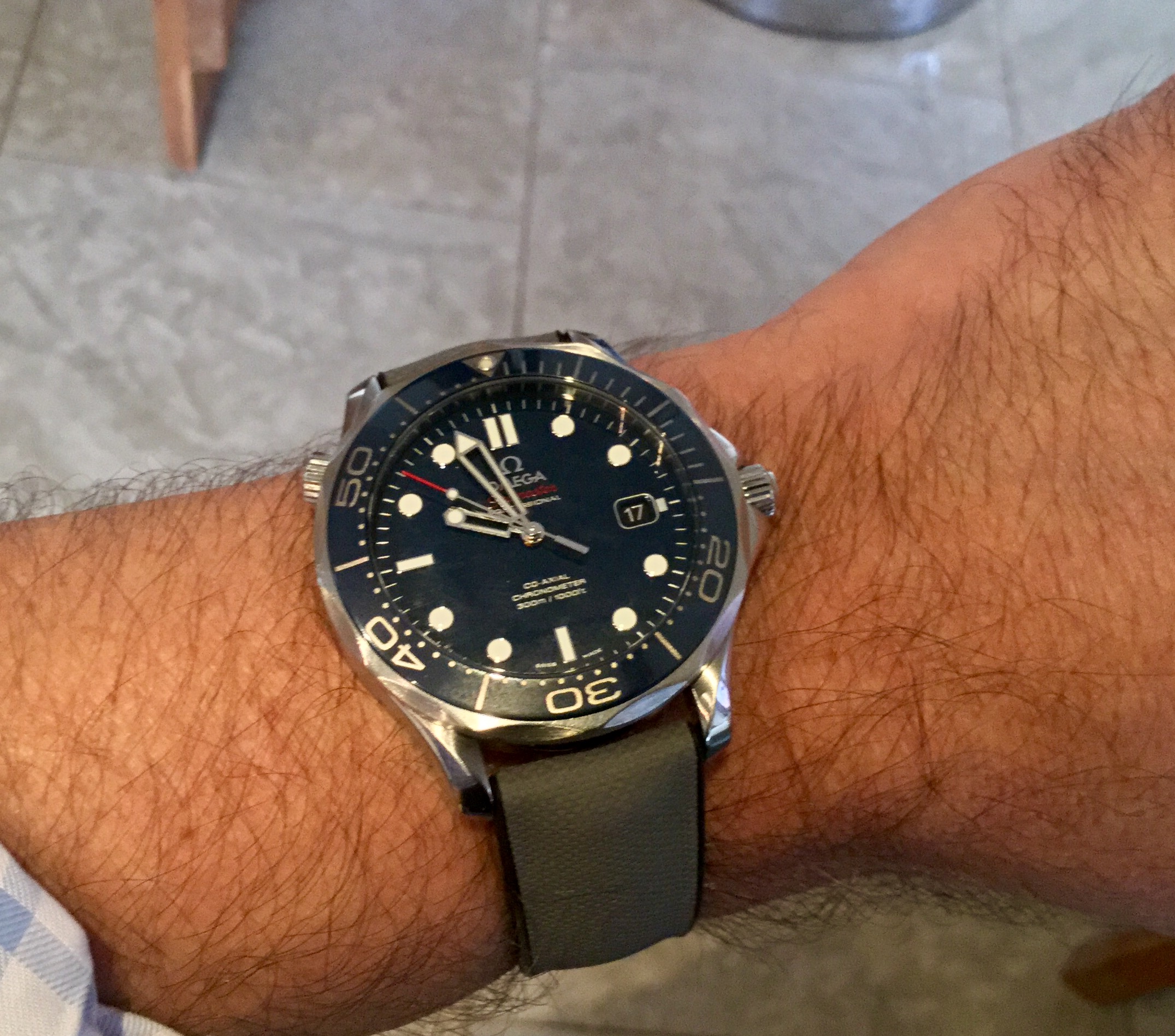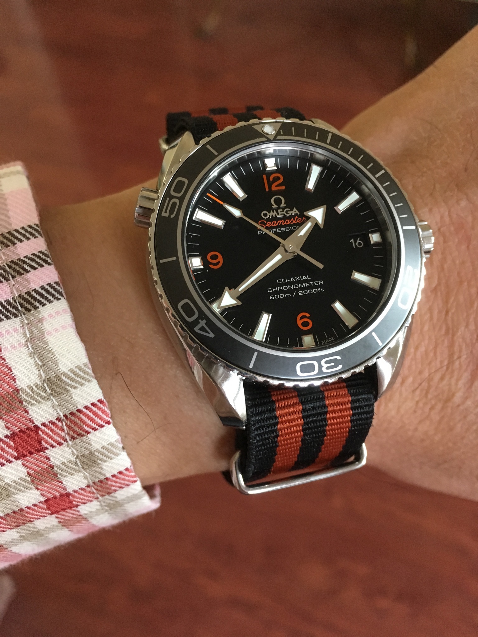 She was right. Neither the original SS bracelet or the black rubber strap looked well to go with the shirt. But this particular NATO is not that bad after all....
