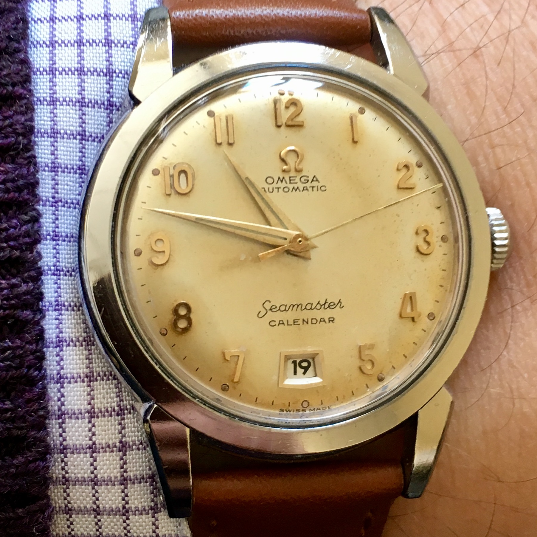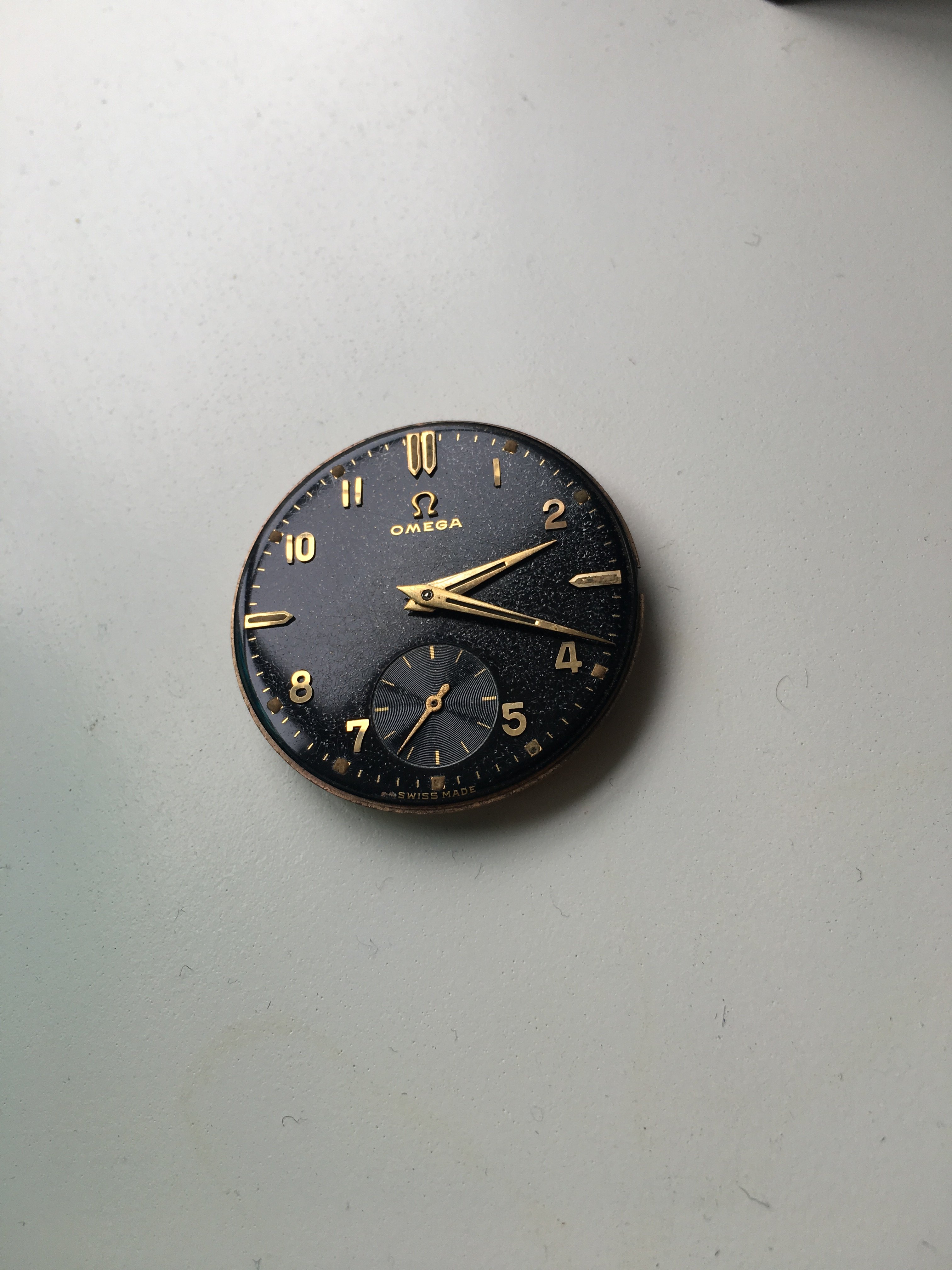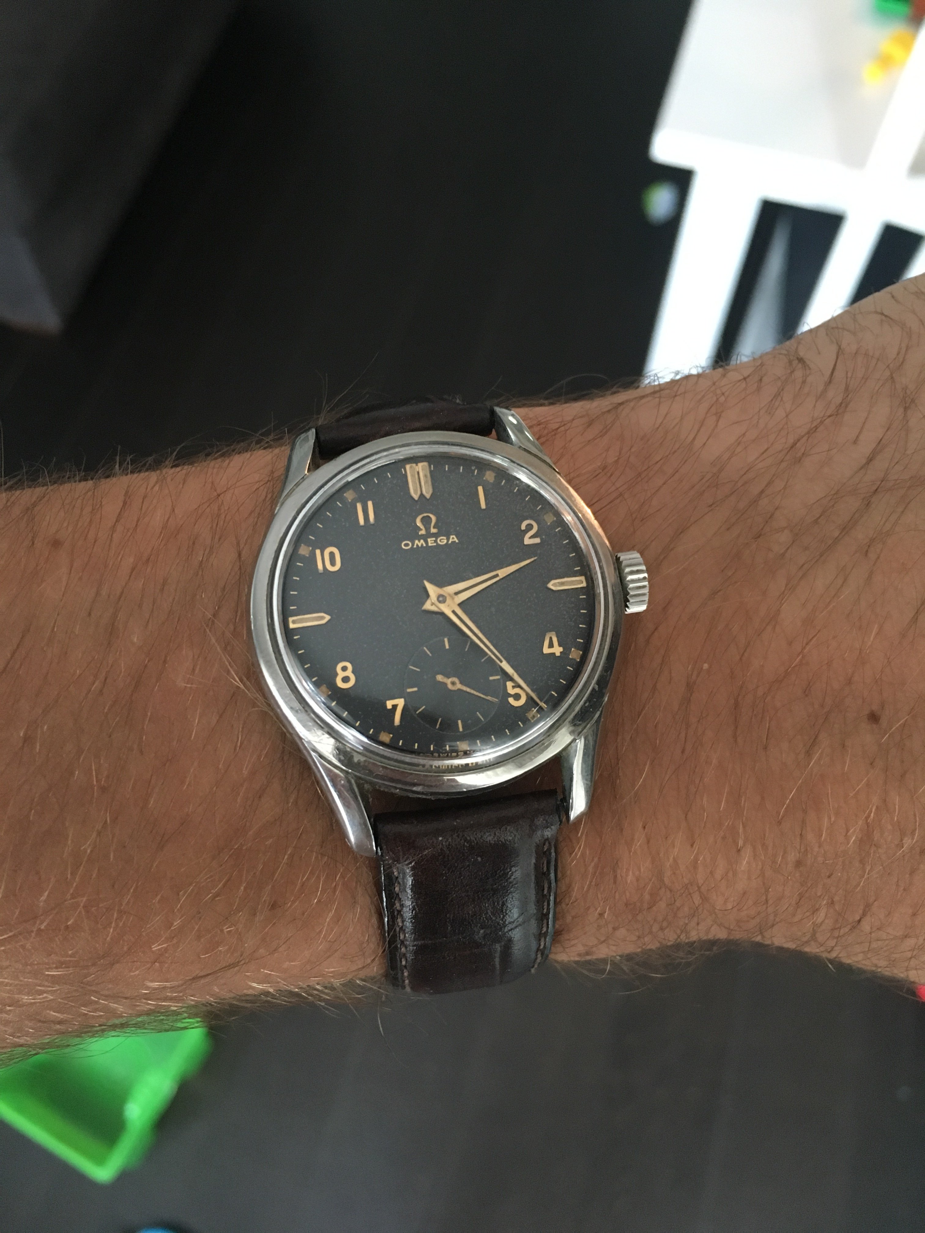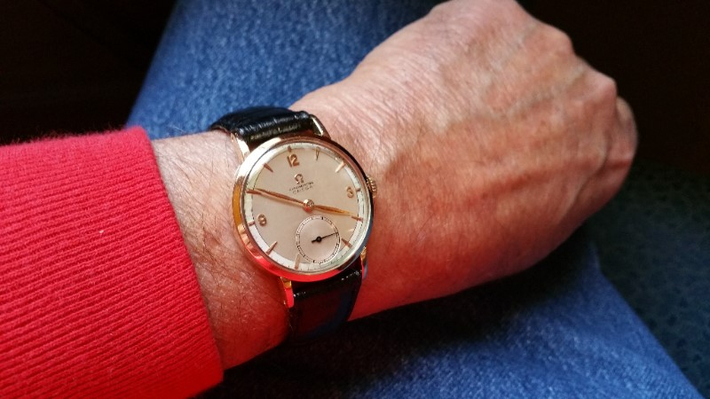 Mine says Hi! I recently replaced the mainsprings in my two recently conditioned Omega bumper automatics, including this one. I have been running these two on a watch winder as a test for duration of run. I find that 8 hours on the winder gives me ~ 40 hours of stationary run. I'll be wearing this one more often now, owing to the fact I don't have to re-set the calendar each time I put it on. Eight hours on the winder, and 40 hours off the winder will do these no harm. This one I'll wear until after the New Year.