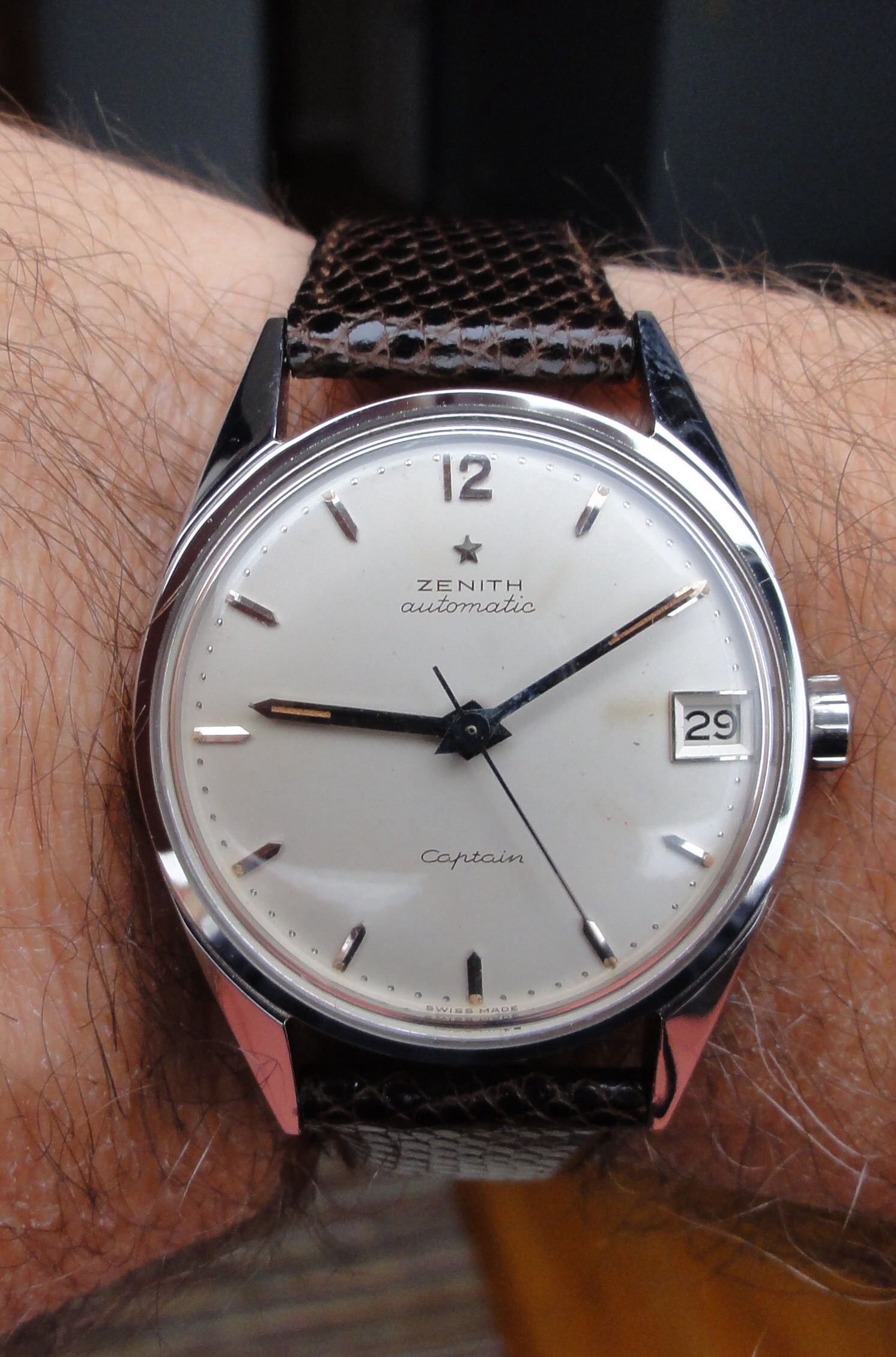 This little diver's watch, a Bettix branded Squale Medium, is cheap but so rich: asymmetric case in order to protect the big crown, brown/olive dial with sunburst finish, massive markers with red stripes, square lume dots, bold hands, lollipop seconds hand, date loupe on the inner side of the doomed crystal, rotating glass bezel, …