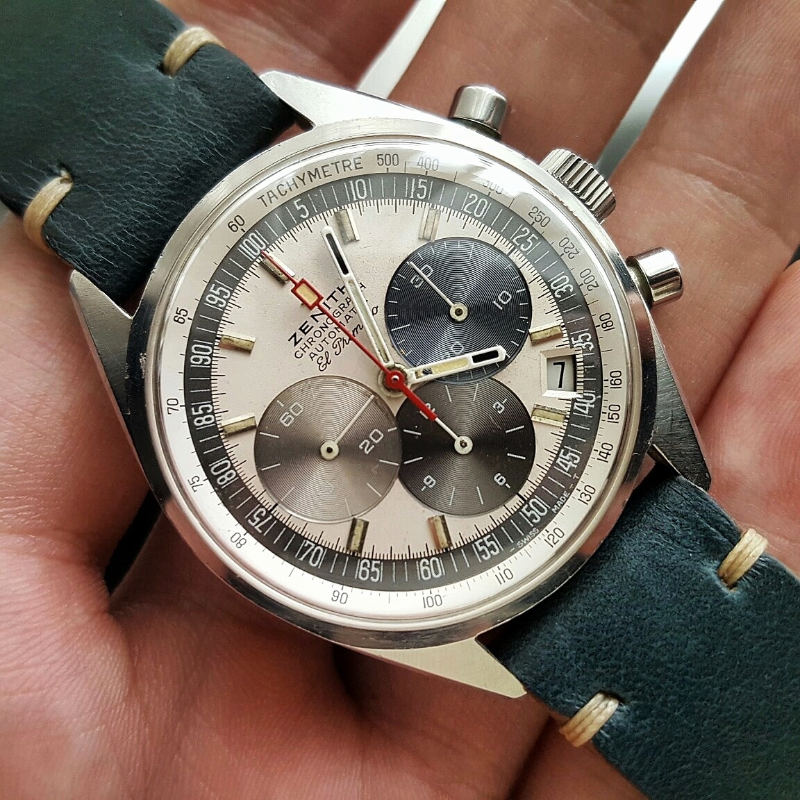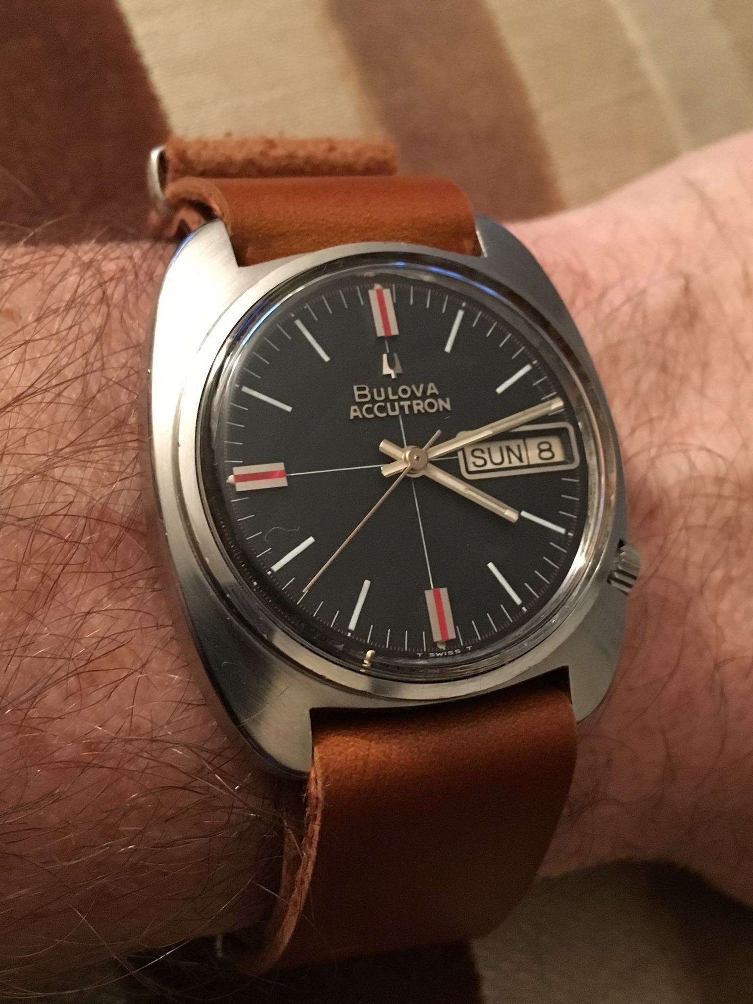 Posts 392 Likes 3,946 Mick Tock 路Jan 8, 2017 This is a Bulova Chronograph "F", a Heuer cal. 12 movement (Bulova cal. 14EFAD) packed into a huge seventies style case, 45 mm wide. Note the tachymeter scale reaching the slower speed of 50 compared to usually 60. I love the colourful face, the combination of the metallic blue color with the various shades from beige to orange. Enjoy, Mick