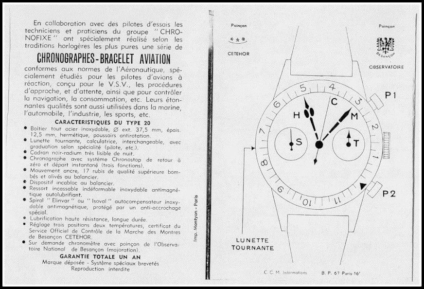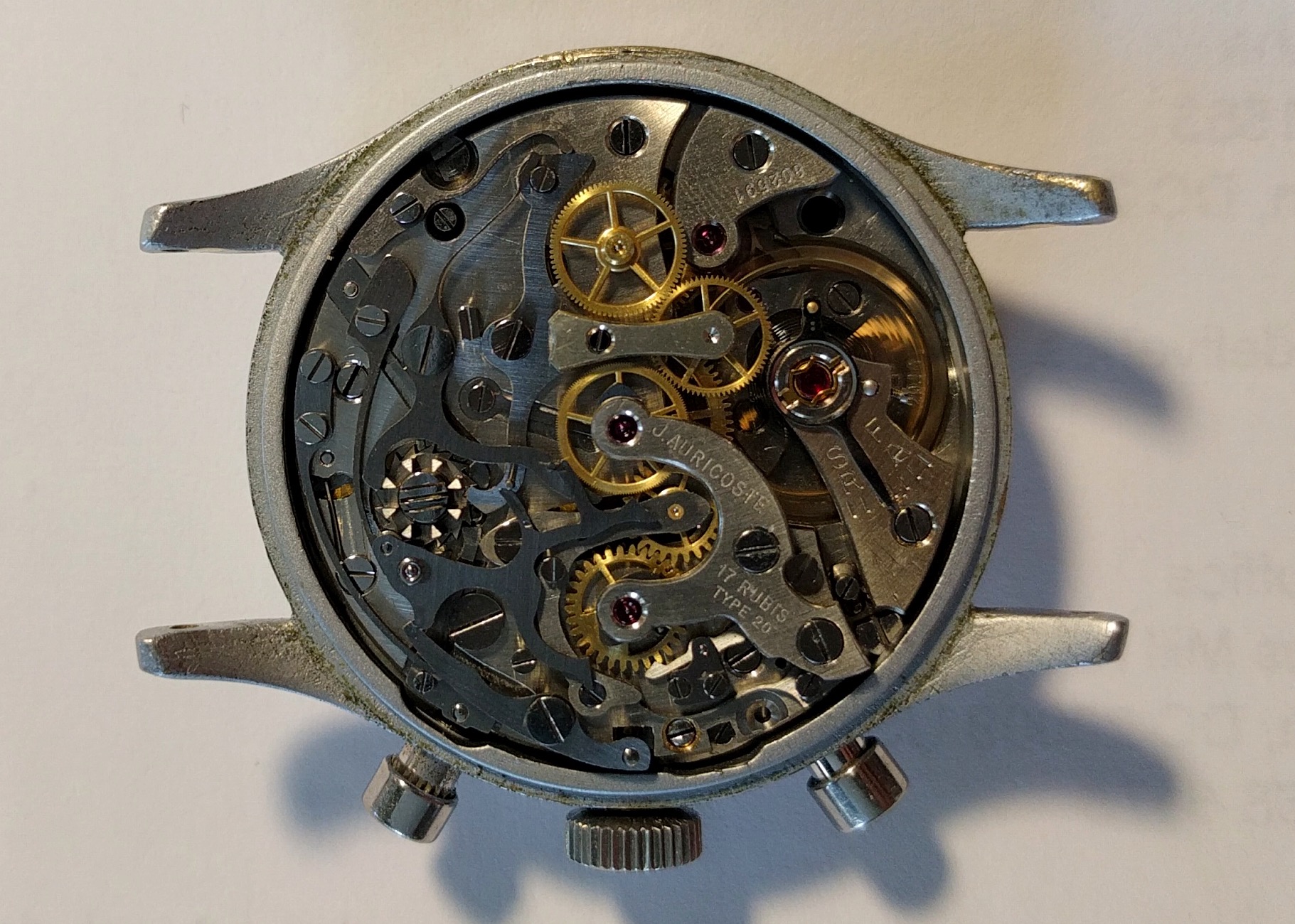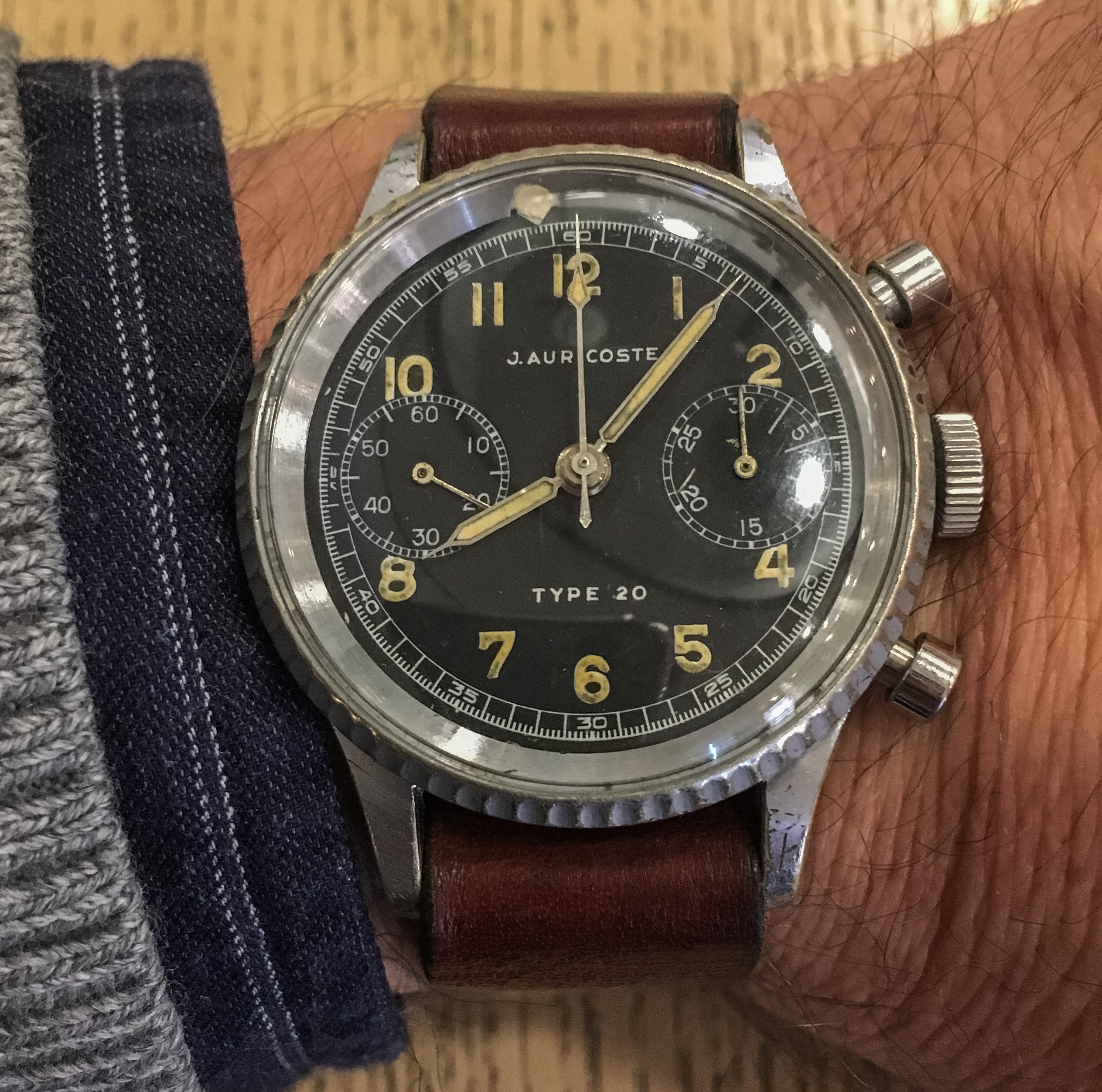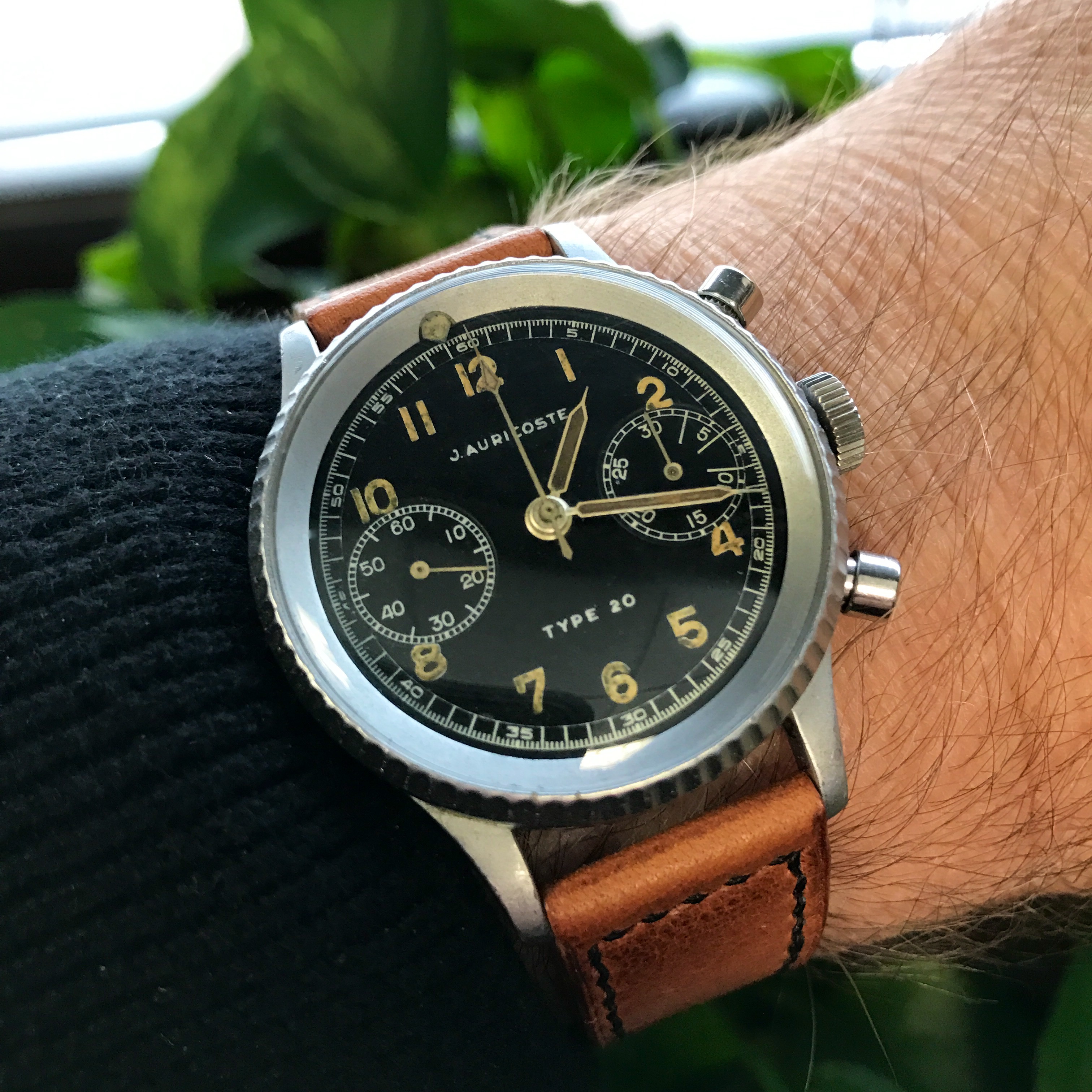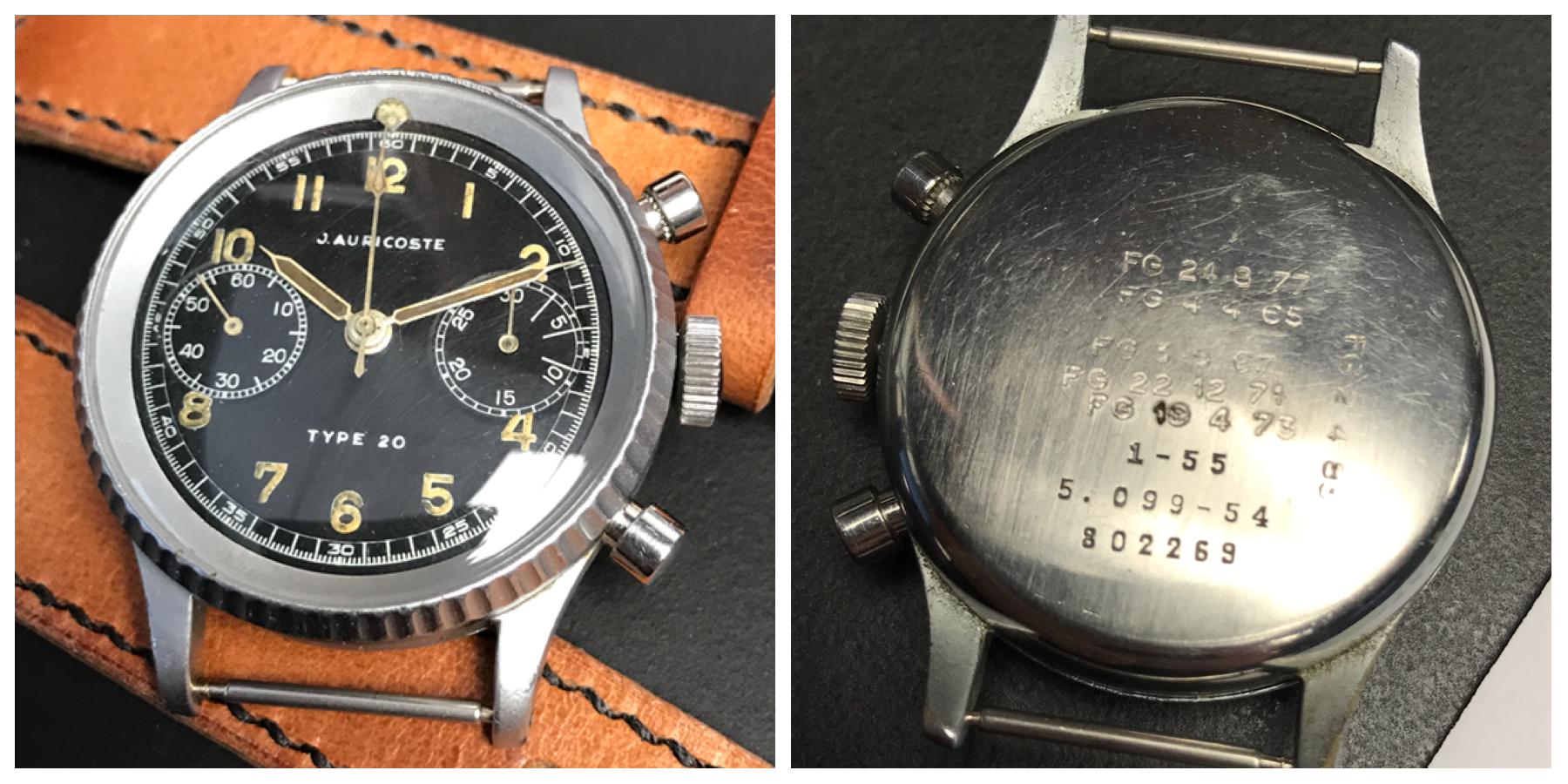 These Auricoste have probably the best movements of all the Type 20/21s, the caliber 2040 flyback, based, I believe, on the Lemania 16TL.