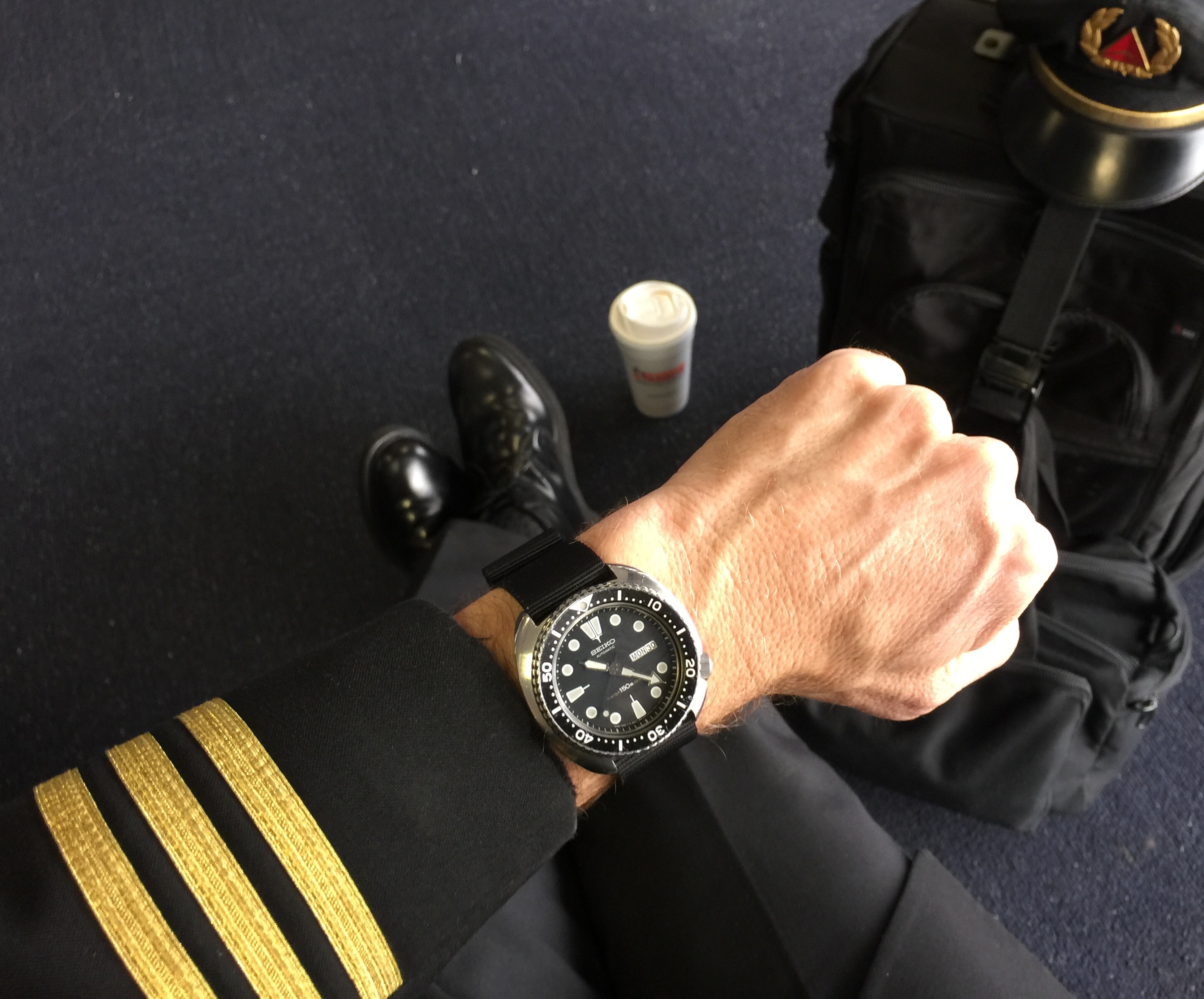 This just in...for the record...the flight attendants were digging my Seiko 6309-7049 on the Raine Inc. protective watch band with locking device today...good times! 馃憤