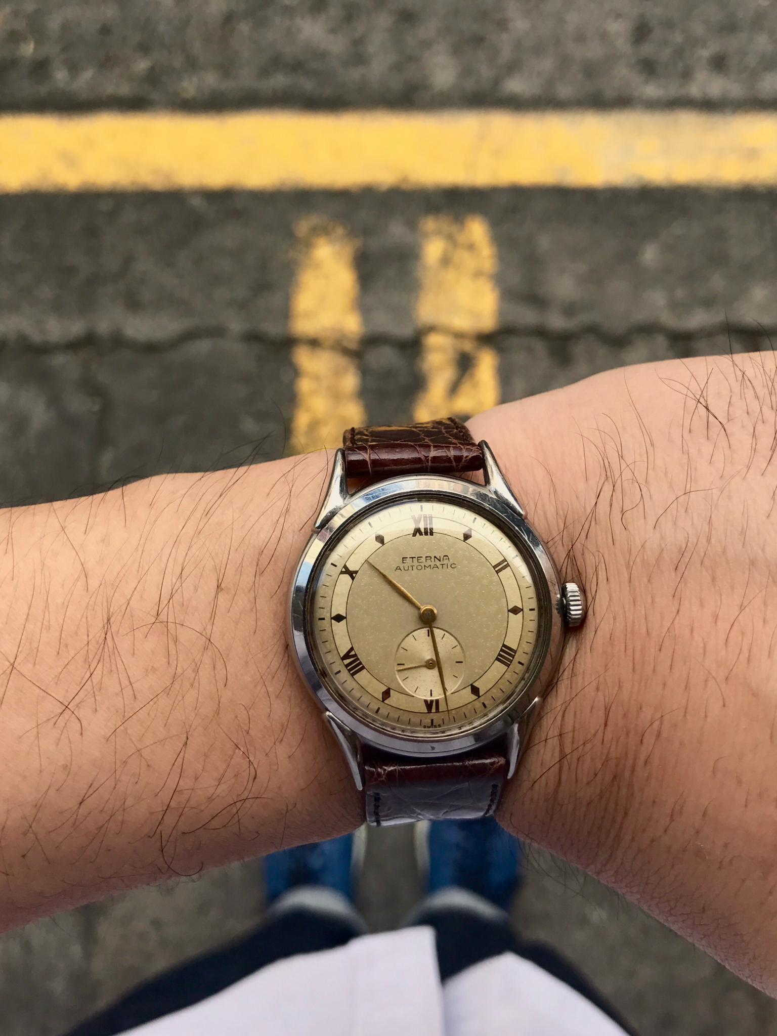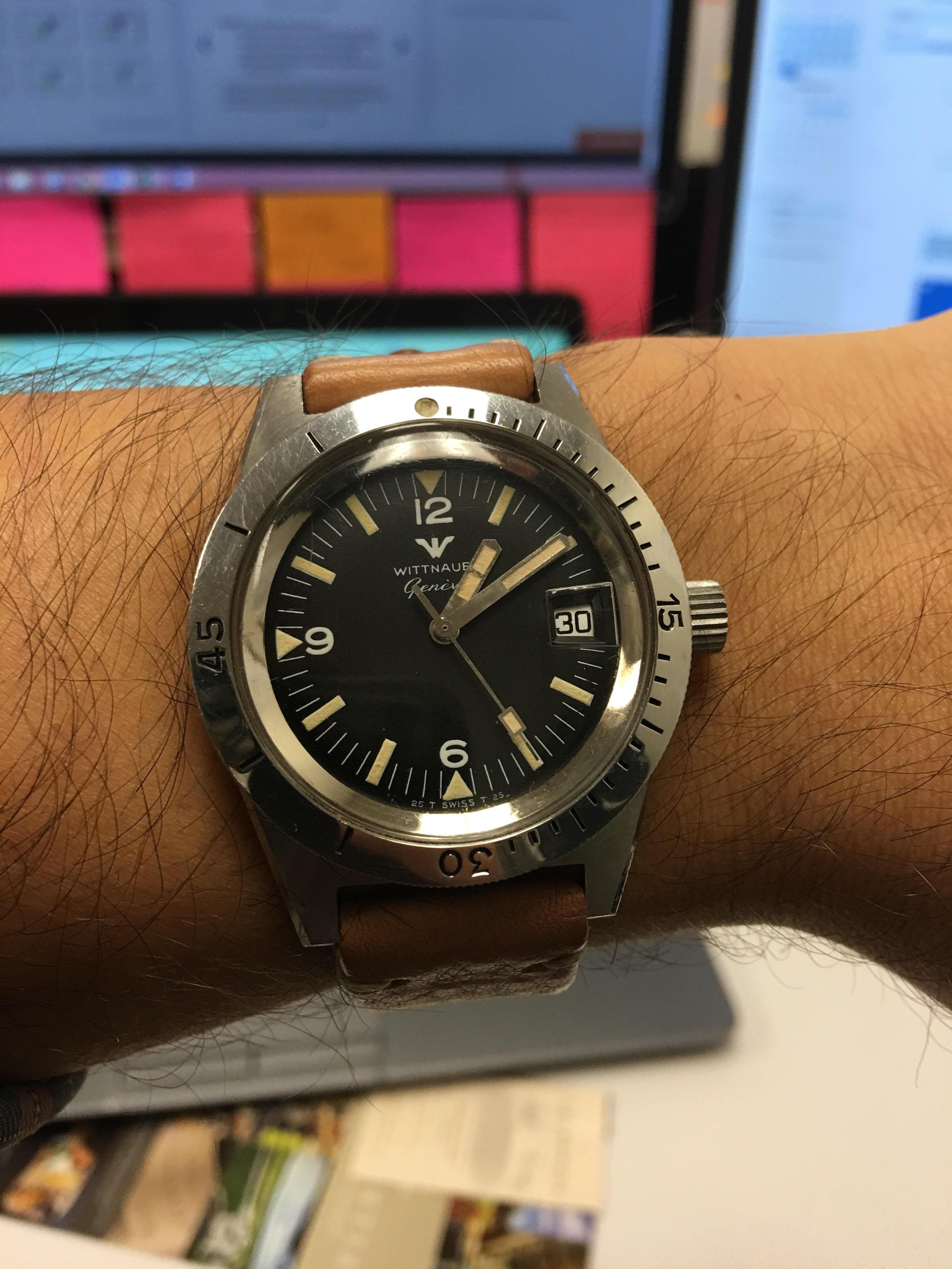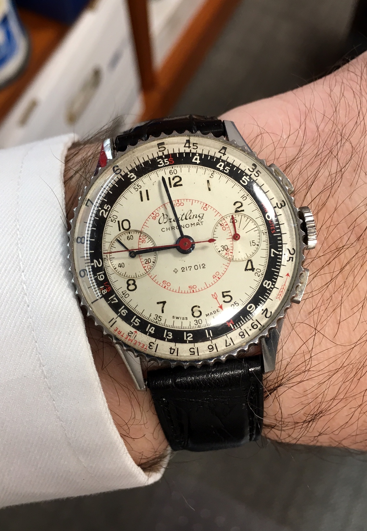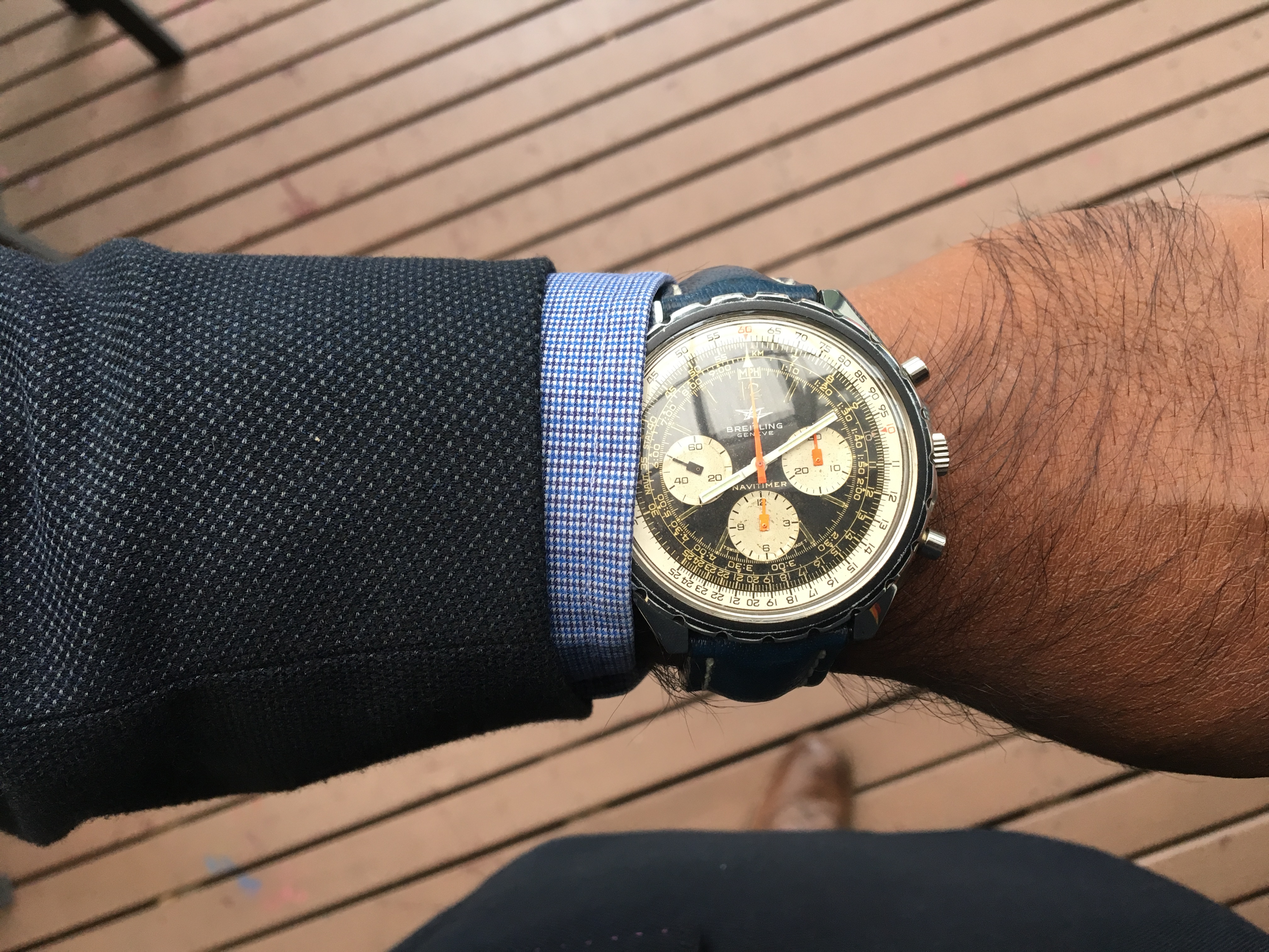 Posts 138 Likes 796 Morrisdog ·Jan 30, 2017 Off to work with my massive 48mm Navitimer on my smallish wrist . The short lugs are a blessing !! Looks much bigger in that photo !