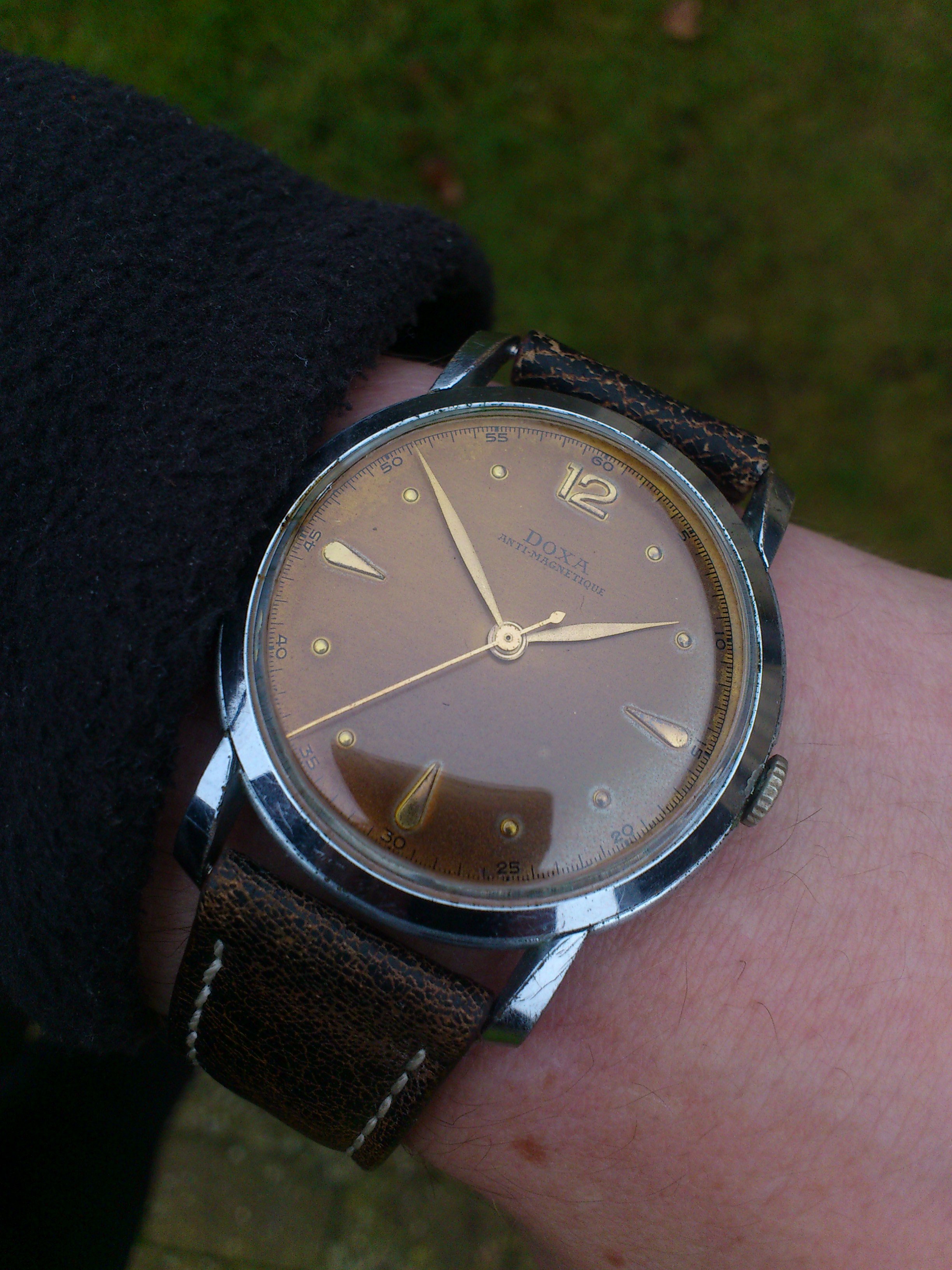 Posts 406 Likes 4,190 Schmedsc ·Jan 31, 2017 ConElPueblo Latest arrival for today - jumbo Doxa with heavy patina is the newest member of my antimagnetic brigade 😀 Really like this one much that I'd have thought. That is some beautiful patina. The dial and strap are a great combo!