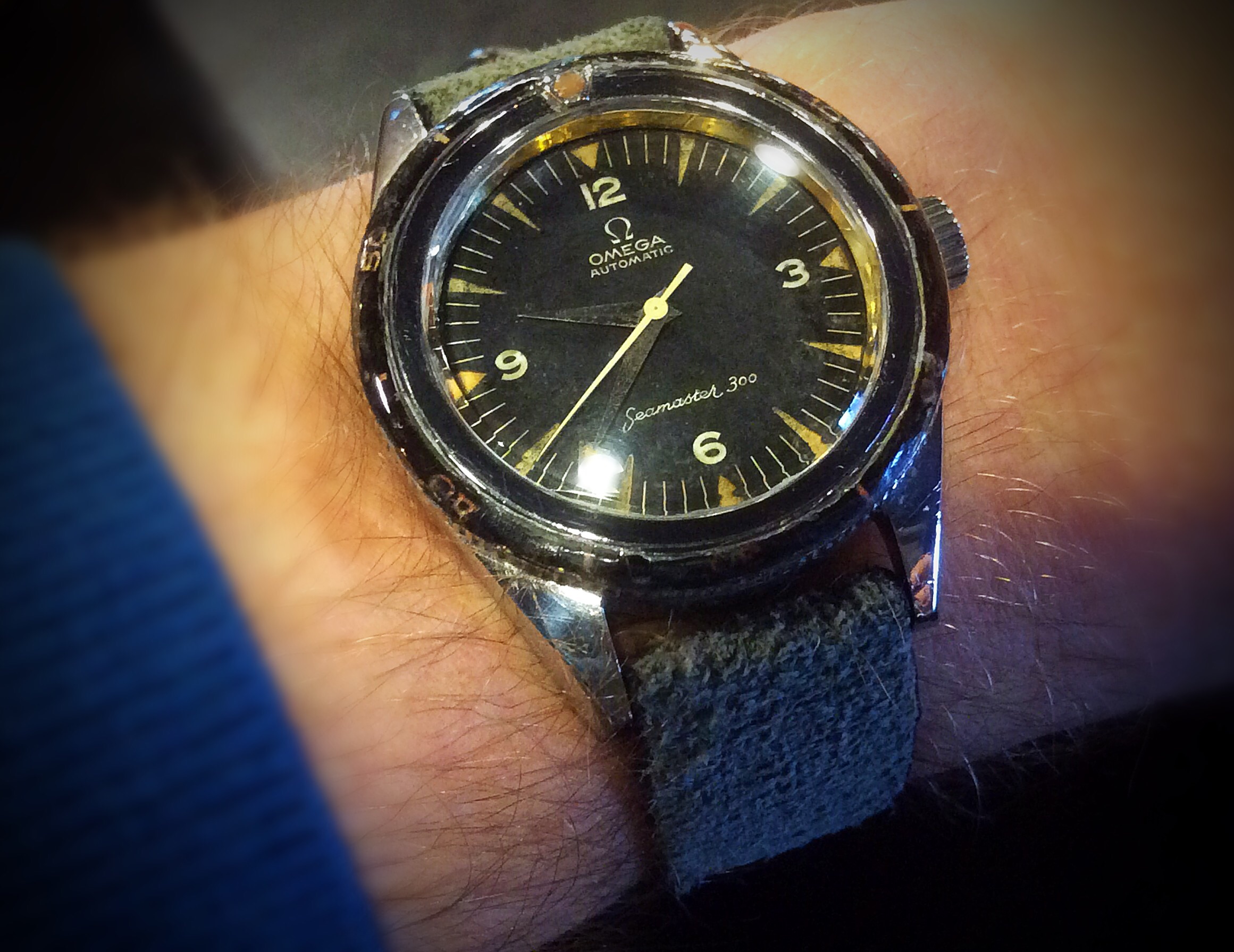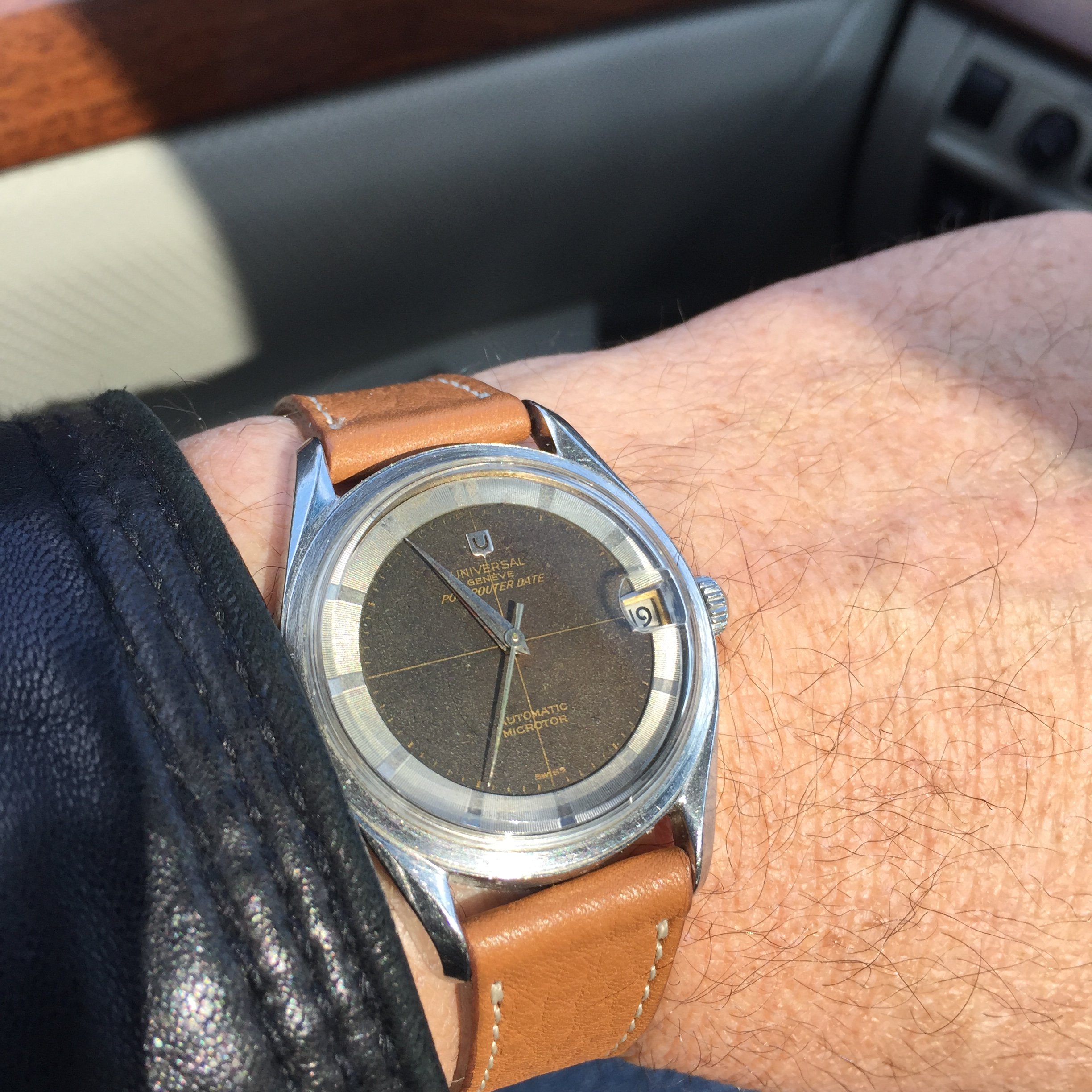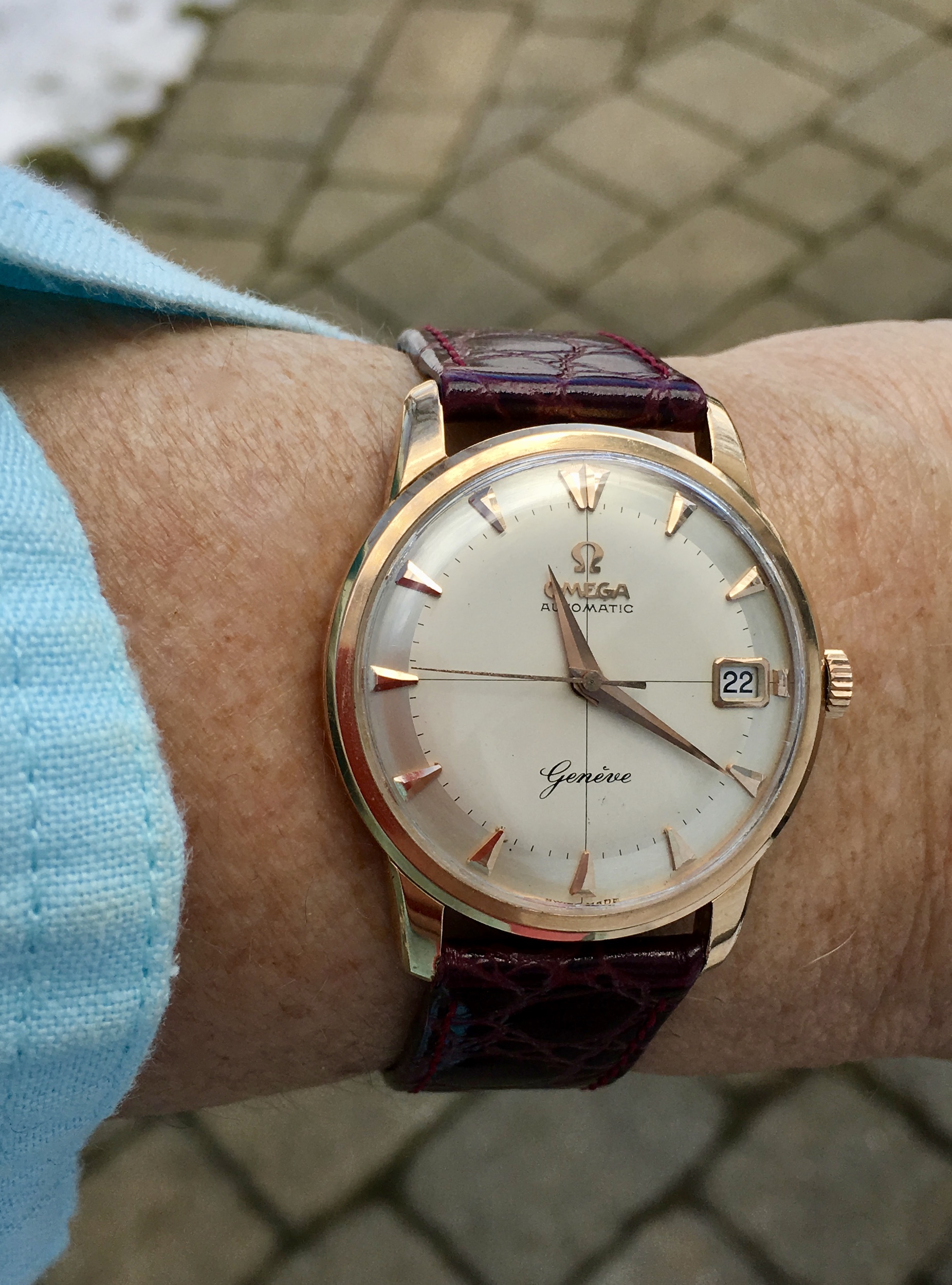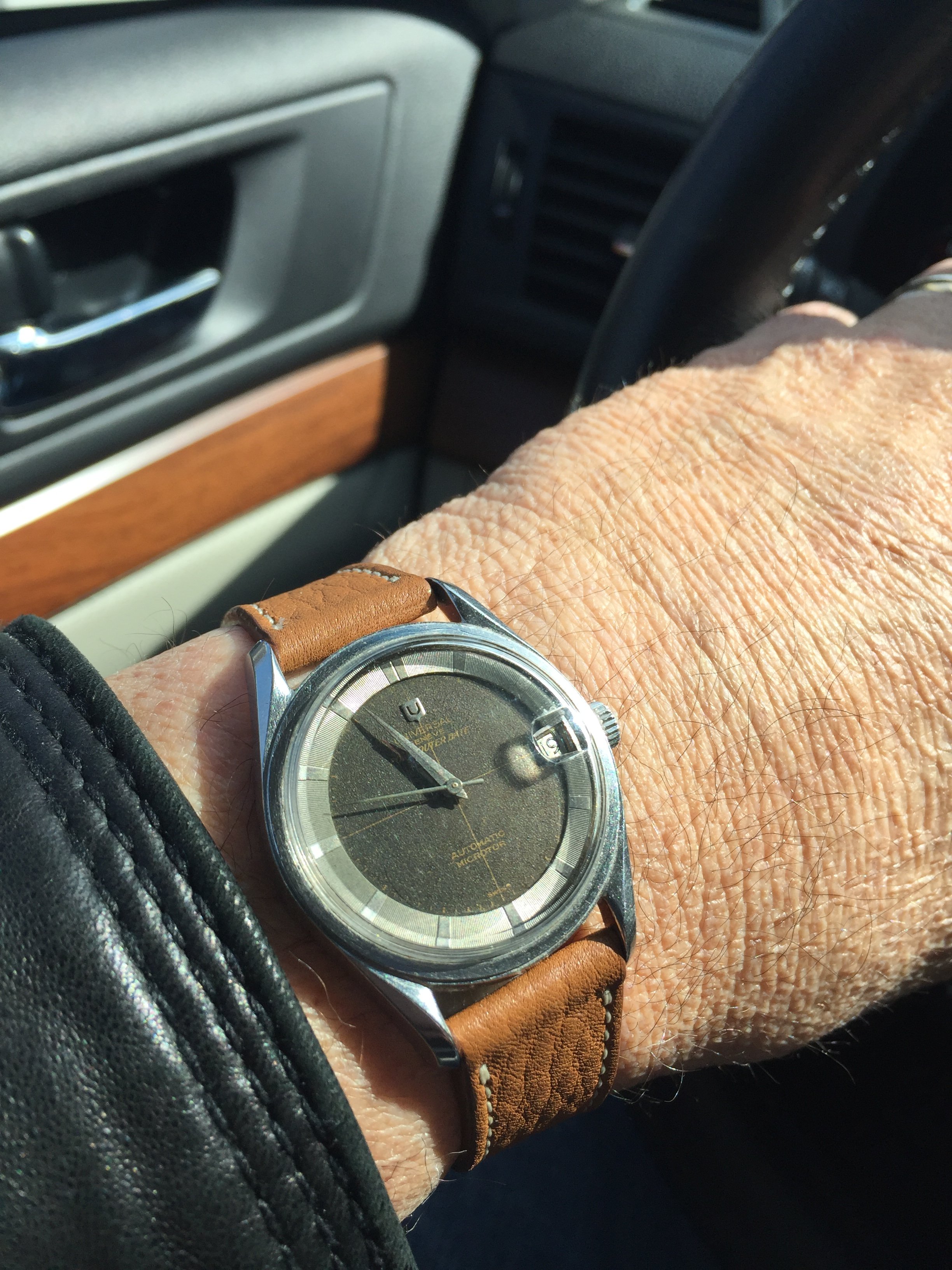 Again today. Survived a three hour fiddle gig, on my bowing arm, last night. Early to mid 1950s, caliber 355, Date at 6:00. Dial is original and unrestored. Watch survived in pieces for well over 40 years, in a tin can of watch parts. A joy to own and wear.