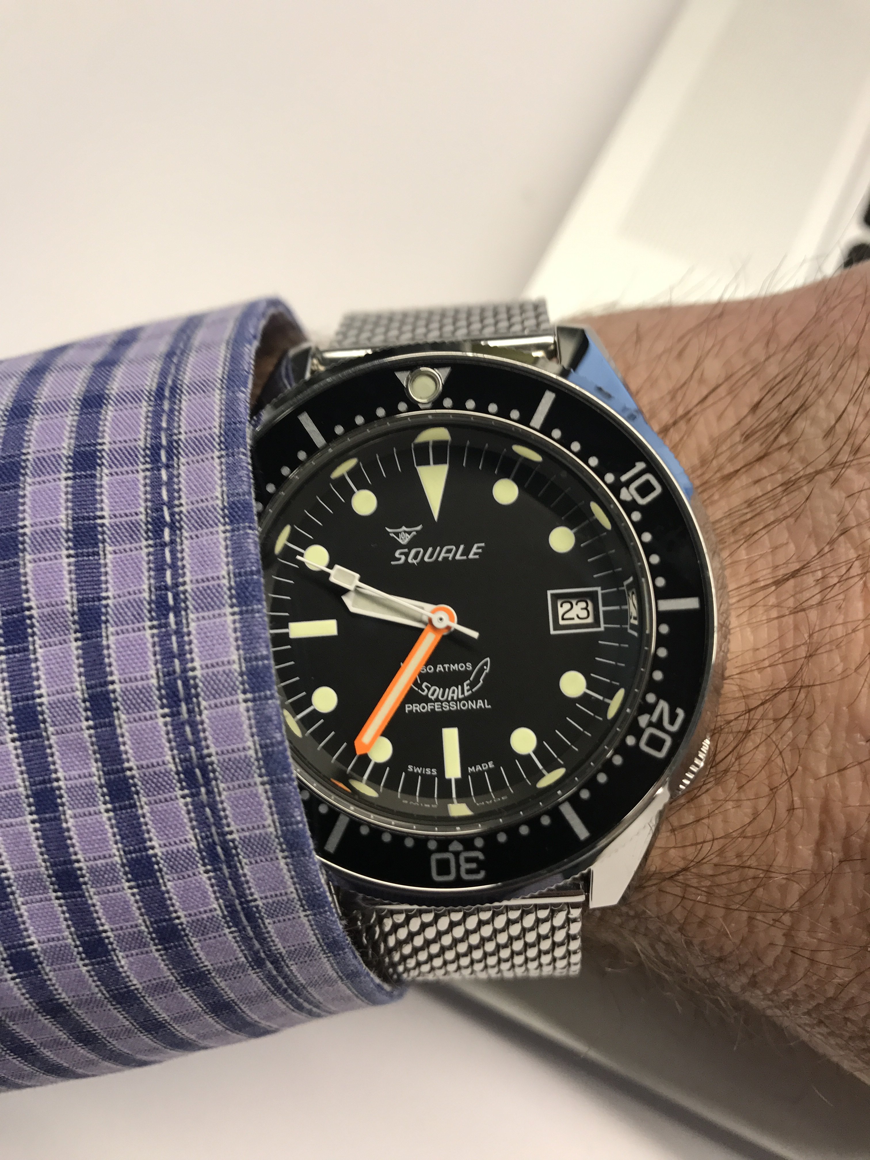 Posts 838 Likes 3,275 KstateSkier 路Mar 23, 2017 Purple shirt with a hint of orange from the minute hand on this lovely Squale 50 atmos. May not take this off until my 60th SM300 arrives!