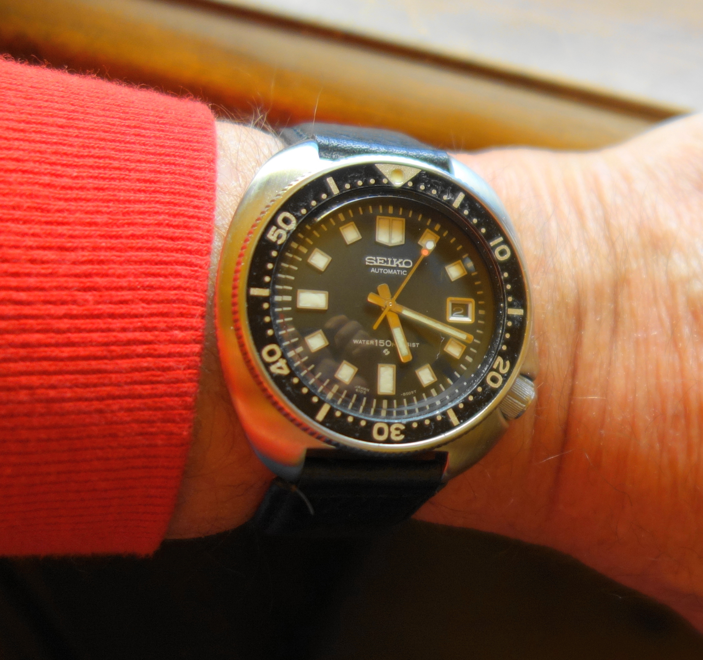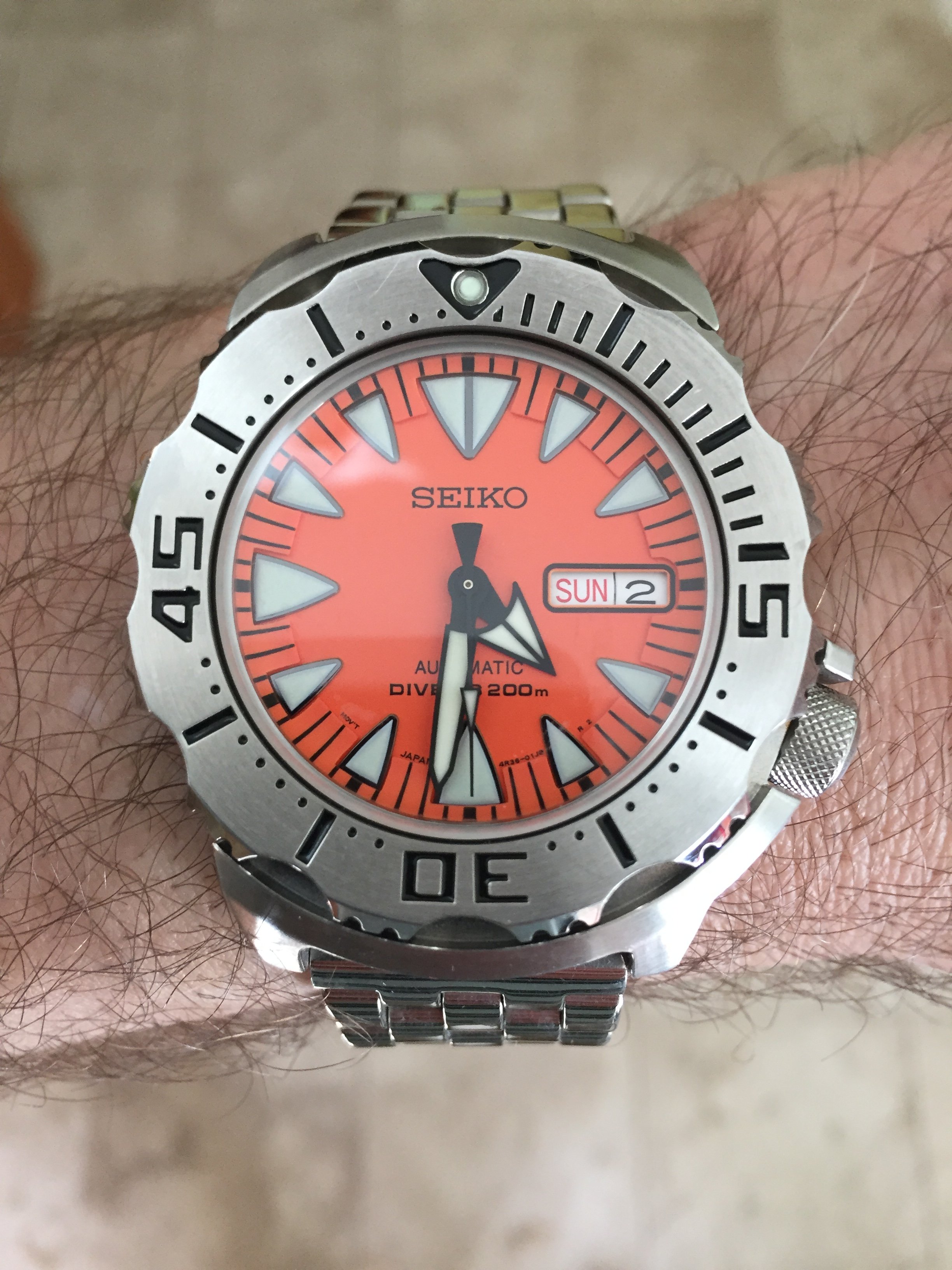 Posts 455 Likes 1,349 argonbeam ·Apr 2, 2017 Haven't worn in ages. Been wearing 31-35 mm thin manual for the most part. Getting wrist prepared for incoming Scurfa Bell Diver. Seiko lume great.