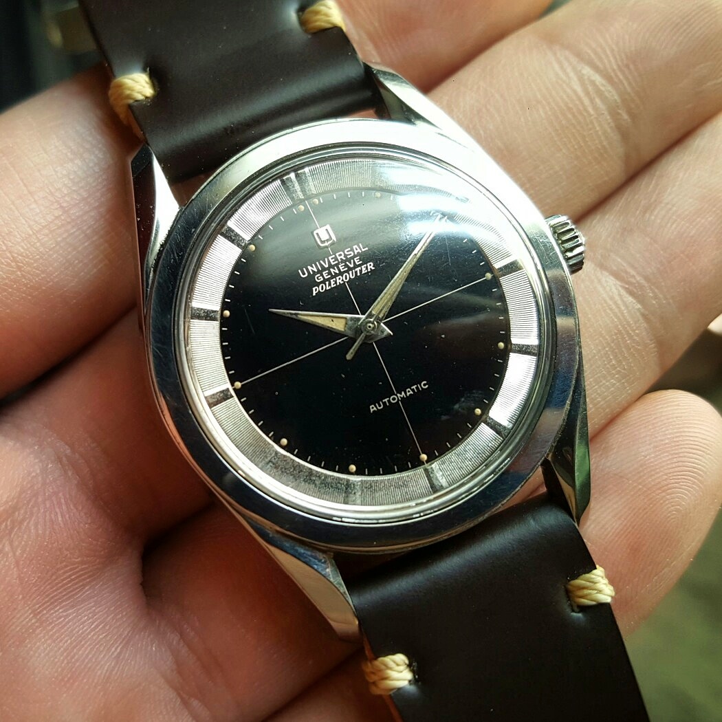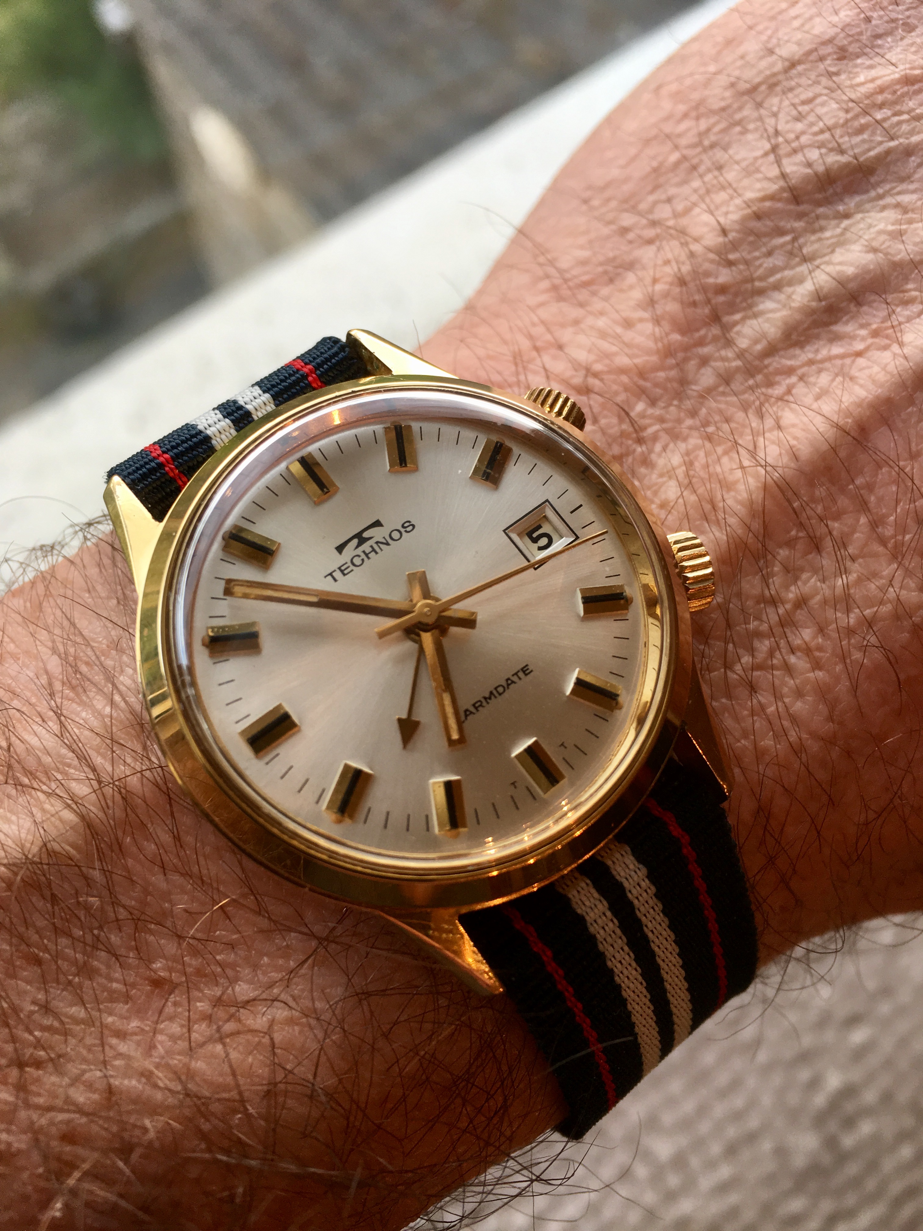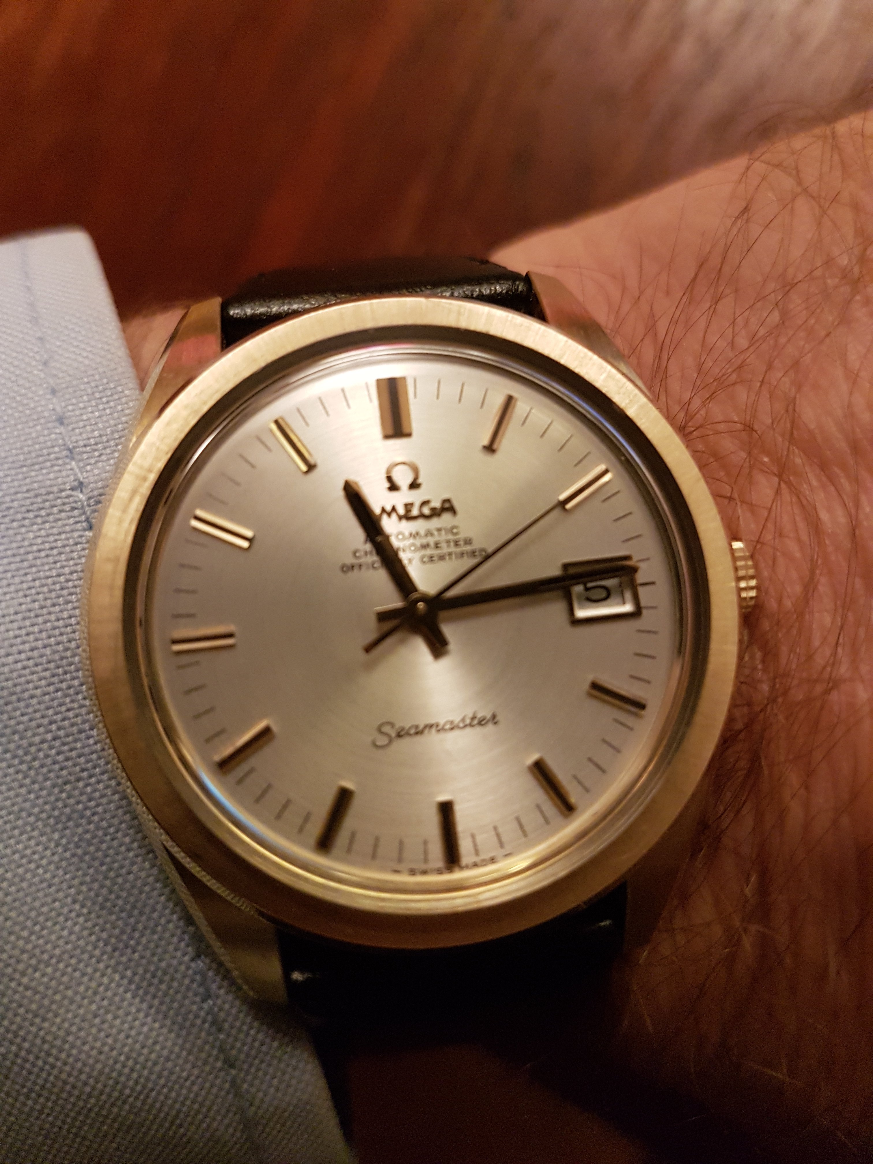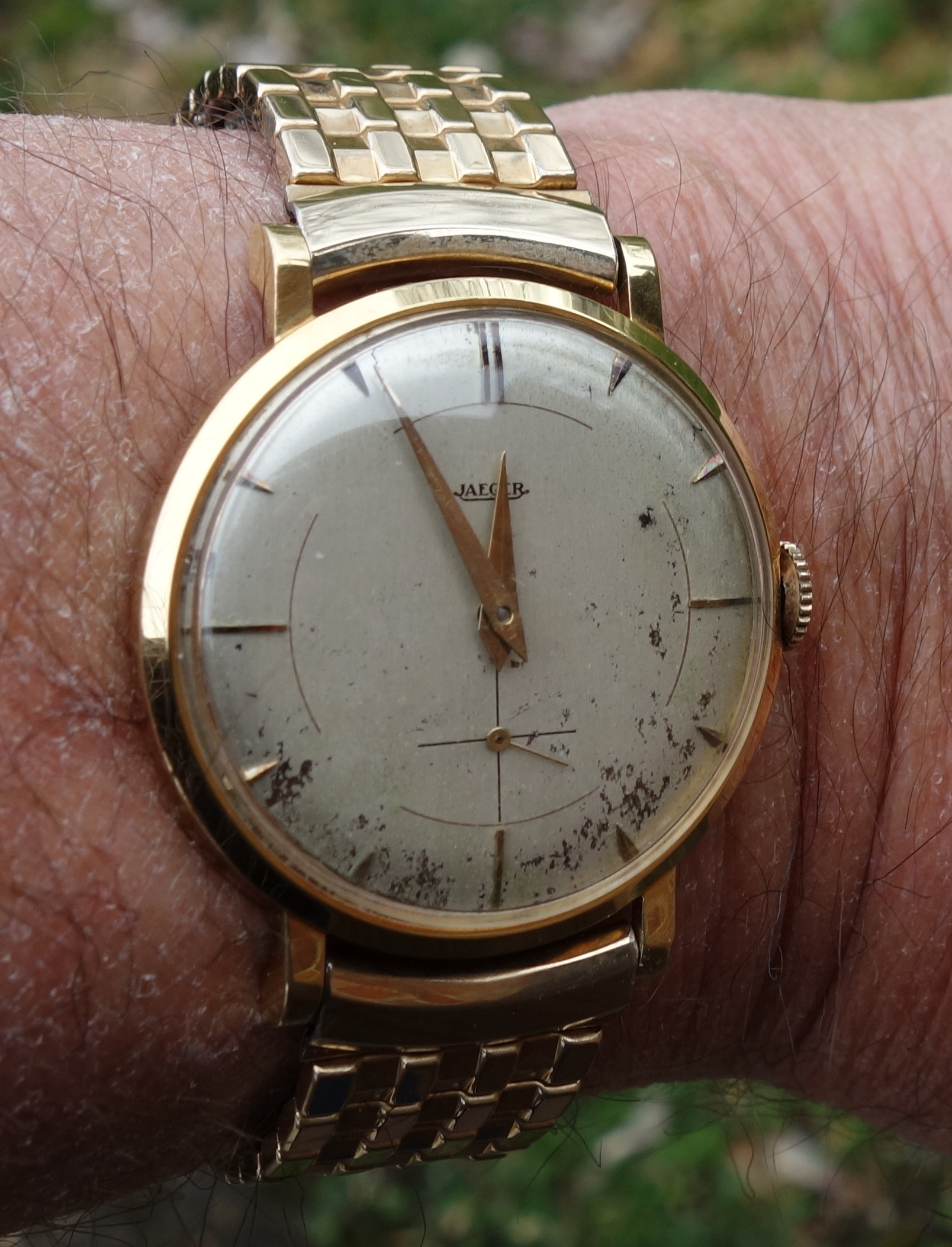 The first picture as purchased. I had to get rid of the stretch band. That would have tore into the 18k gold case. These type stretch bands can do a lot of damage to the inside of the lugs. The stretch band that was on this one did no damage to the inside of the lugs So far so good. I just brought the Jaeger home today