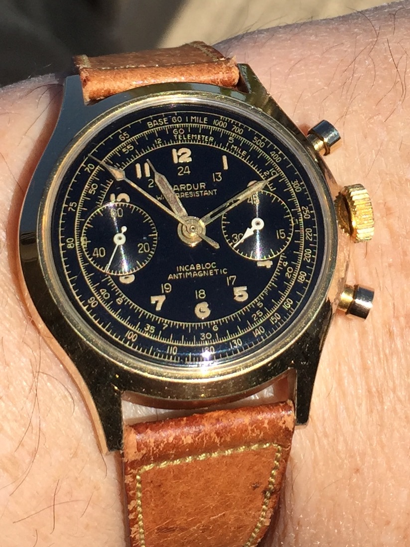 Posts 8,497 Likes 60,669 TexOmega ·Apr 6, 2017 A JarDur cal 850 in a sharp gold filled case and period leather strap. 38mm 19mm lug Edited: Apr 6, 2017