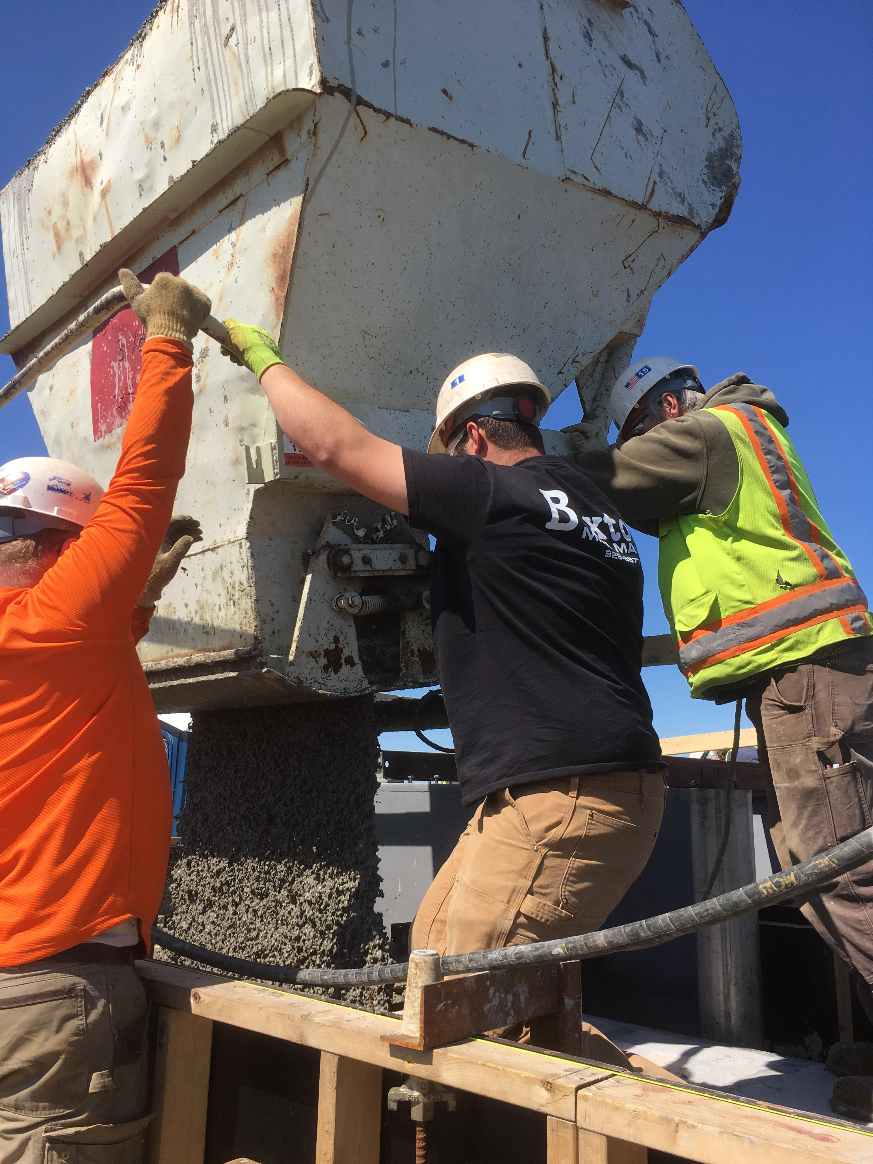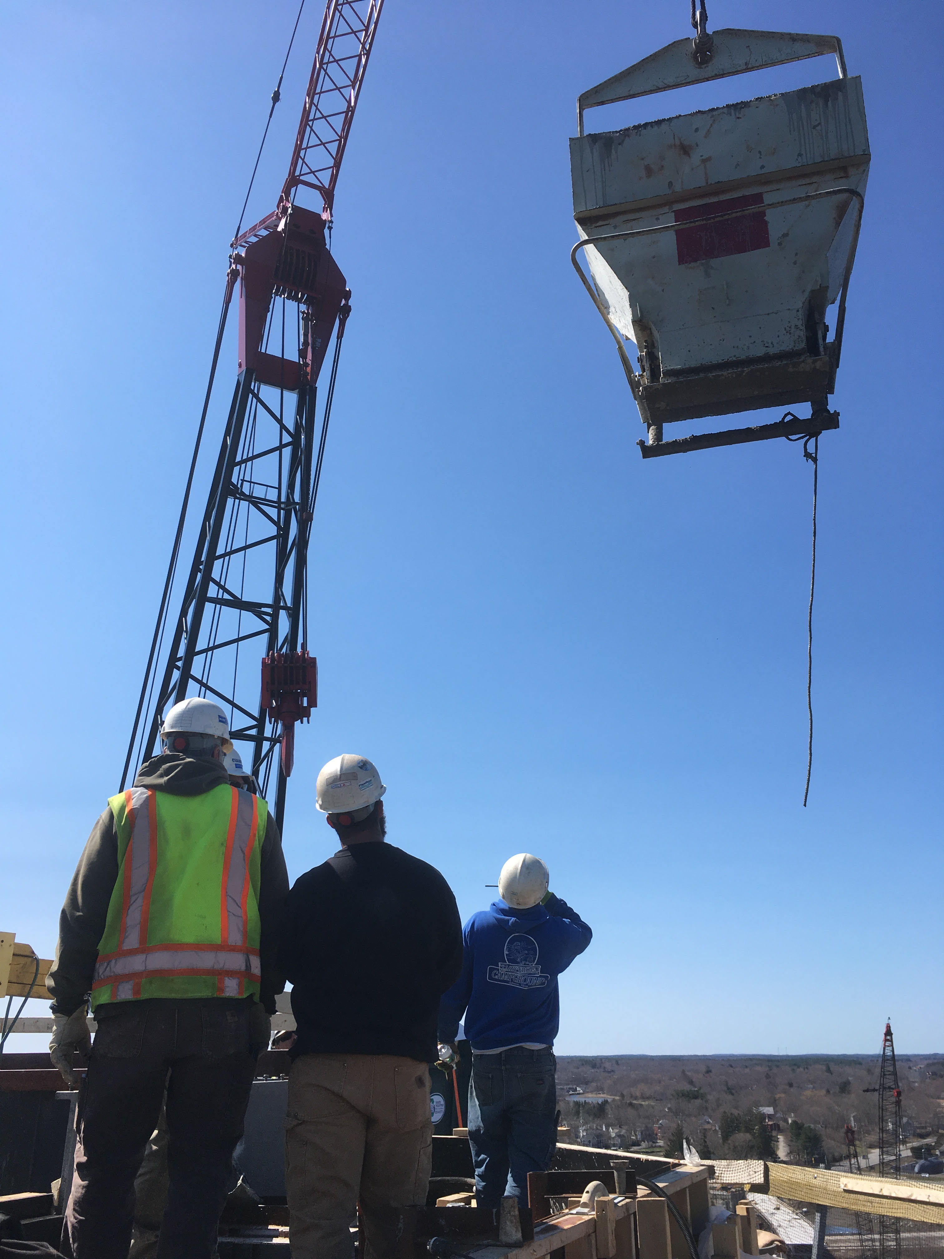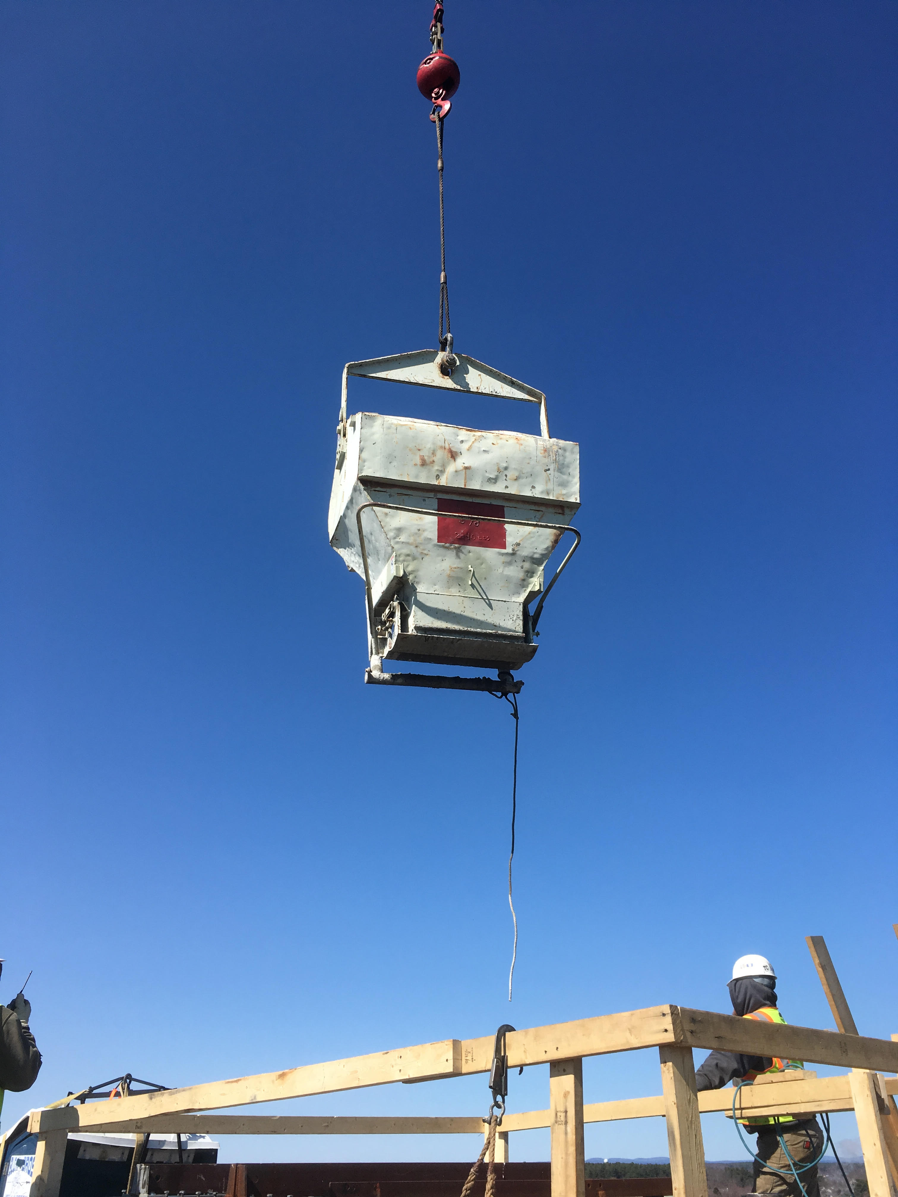 The concrete trucks stop just off the temporary bridge (trestle) for testing. If you blow the shot up you can just make out the DOT inspector, our 3rd party QC tester and our QC Manager standing there waiting for the next truck. The truck proceeds to the end of the trestle and offloads concrete into a 3 yard bucket which is lifted to the top of the tower and placed by the crew. It's quite a sight to watch the supervisor direct the crane operator on where to position the bucket so the crew can place the concrete efficiently and without making a mess. This one was about 30 or so yards, which took 10 buckets (or so).