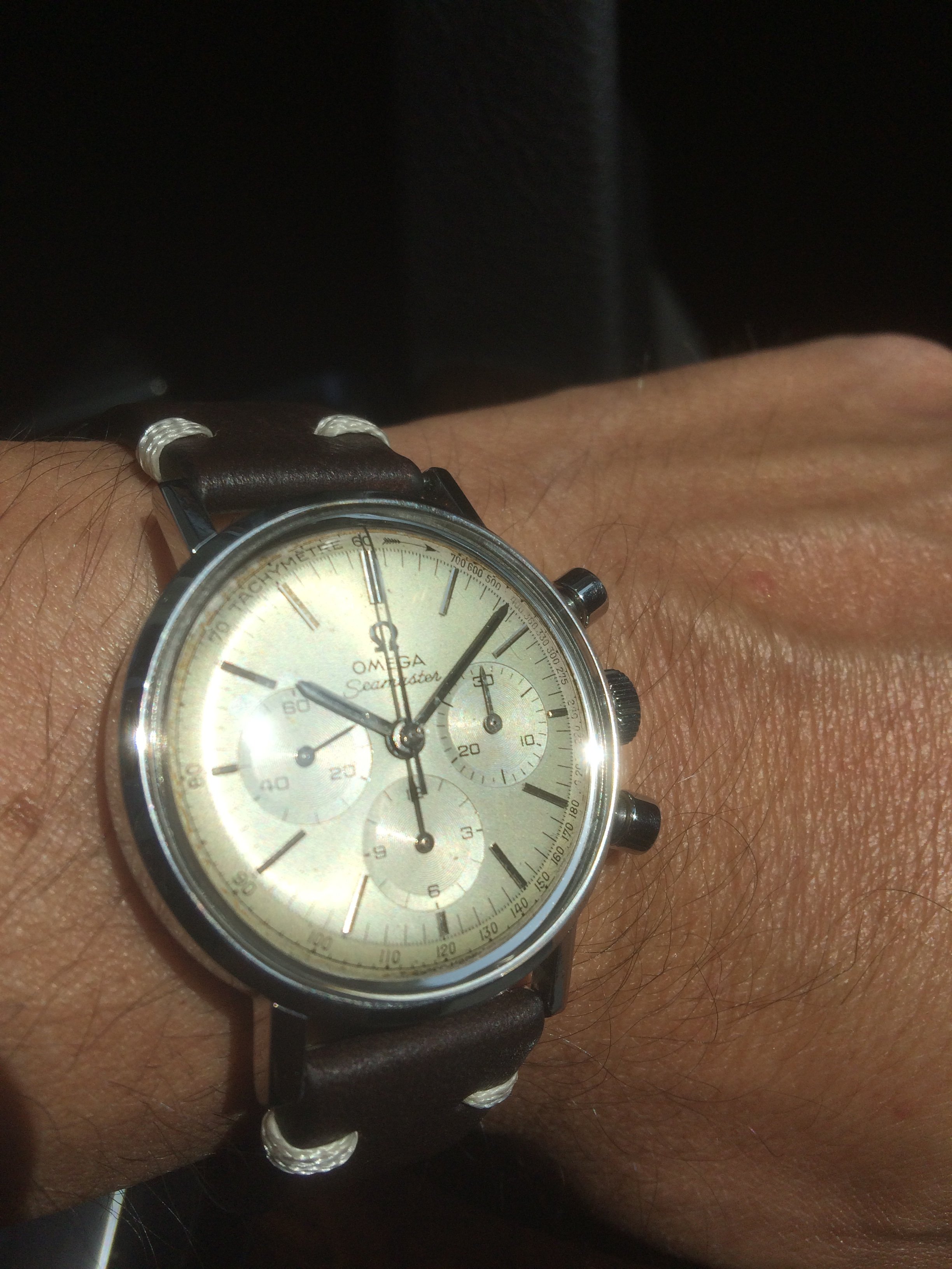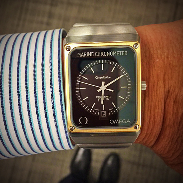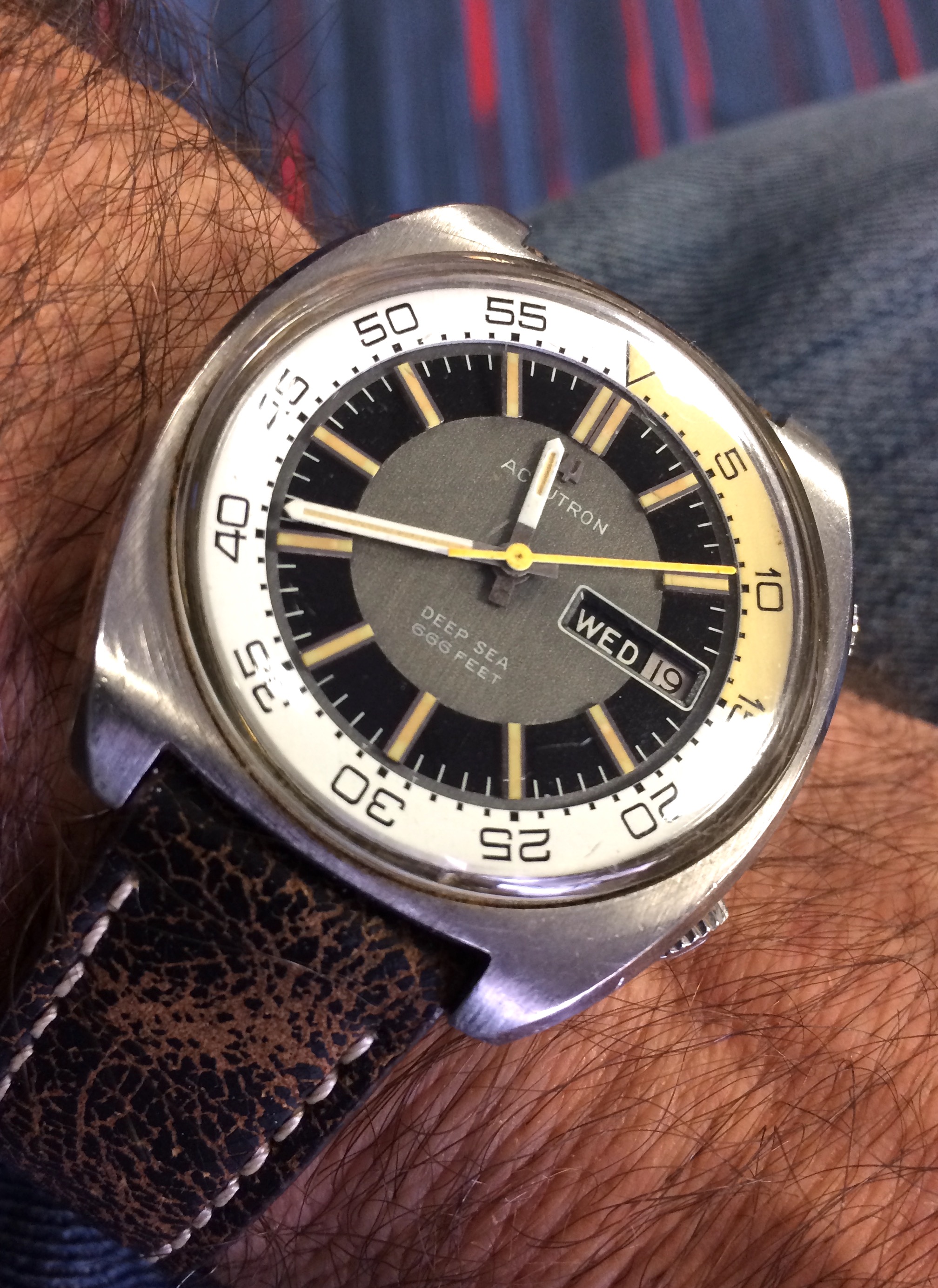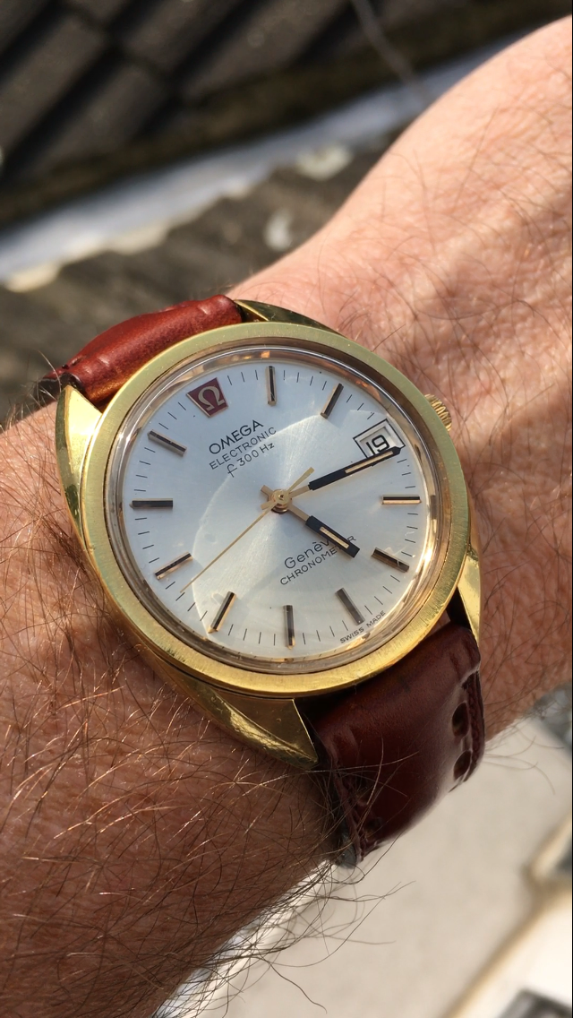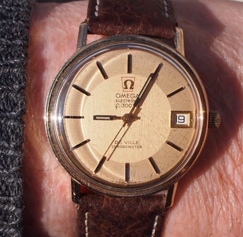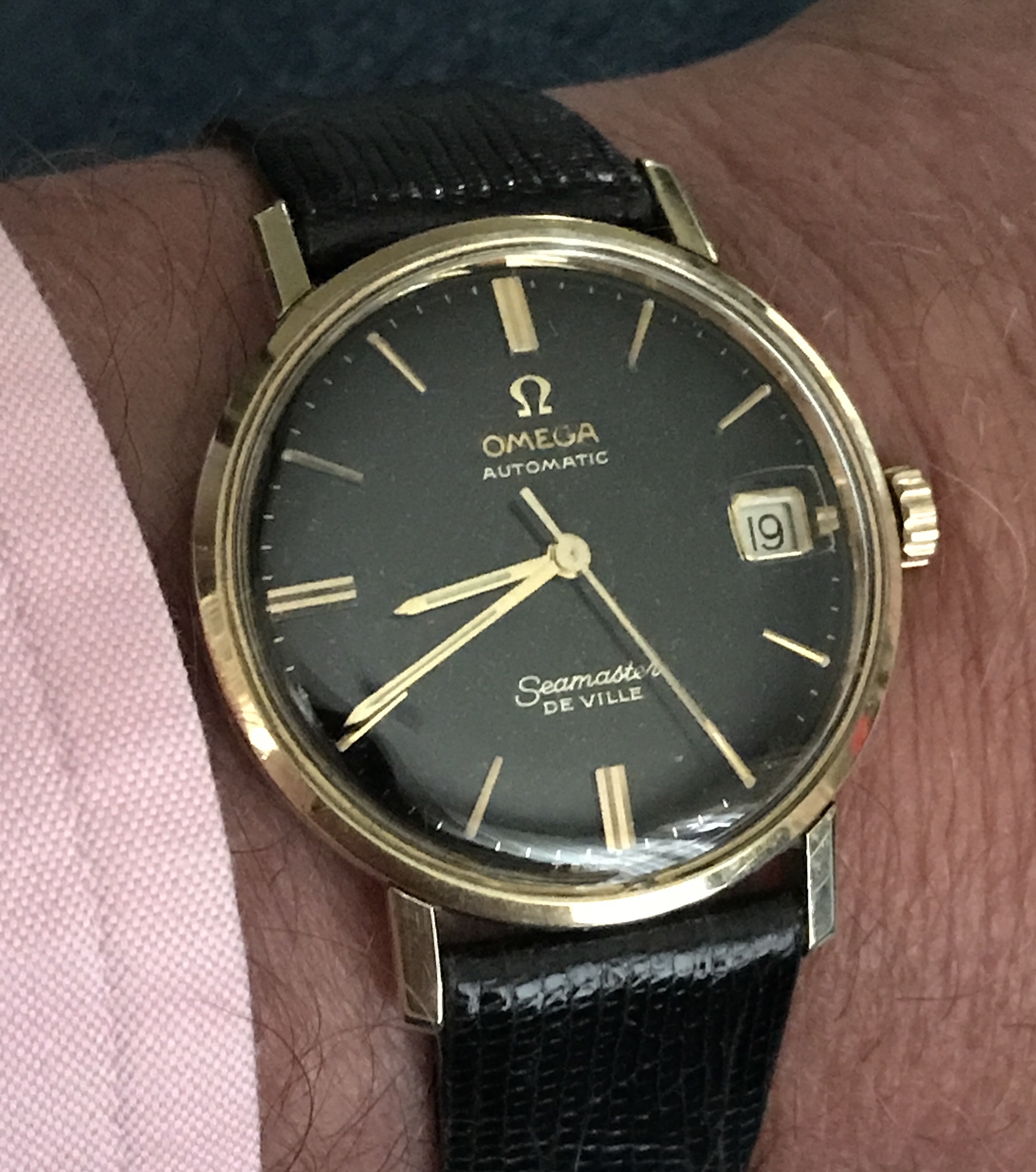 I've had this one for several years, but haven't worn it. It has always run well, but the date wasn't operating. Plastic date ring. Common problem with the Omega 1250 (ESA 9162) tuning fork models. I had made a few attempts in the past to find a replacement ring, to have repeatedly met with the same result! Not available. Recently, I was surfing eBay, and lo and behold, a dealer in a Mannheim, Germany, was listing a NOS date ring for sale. I bought it, and this is the result. The watch is on a buffalo hide strap. So today I will wear this one, and my long term tester, my1989 Rolex Date-Just which I serviced in November, 2016. As of today, it is 19 seconds fast since November. It dropped back 3 seconds at the change to MDT in March.