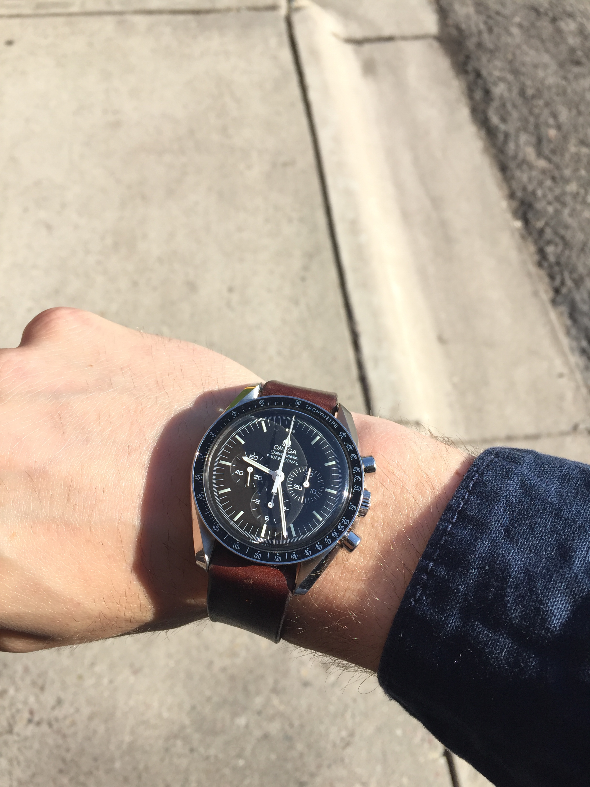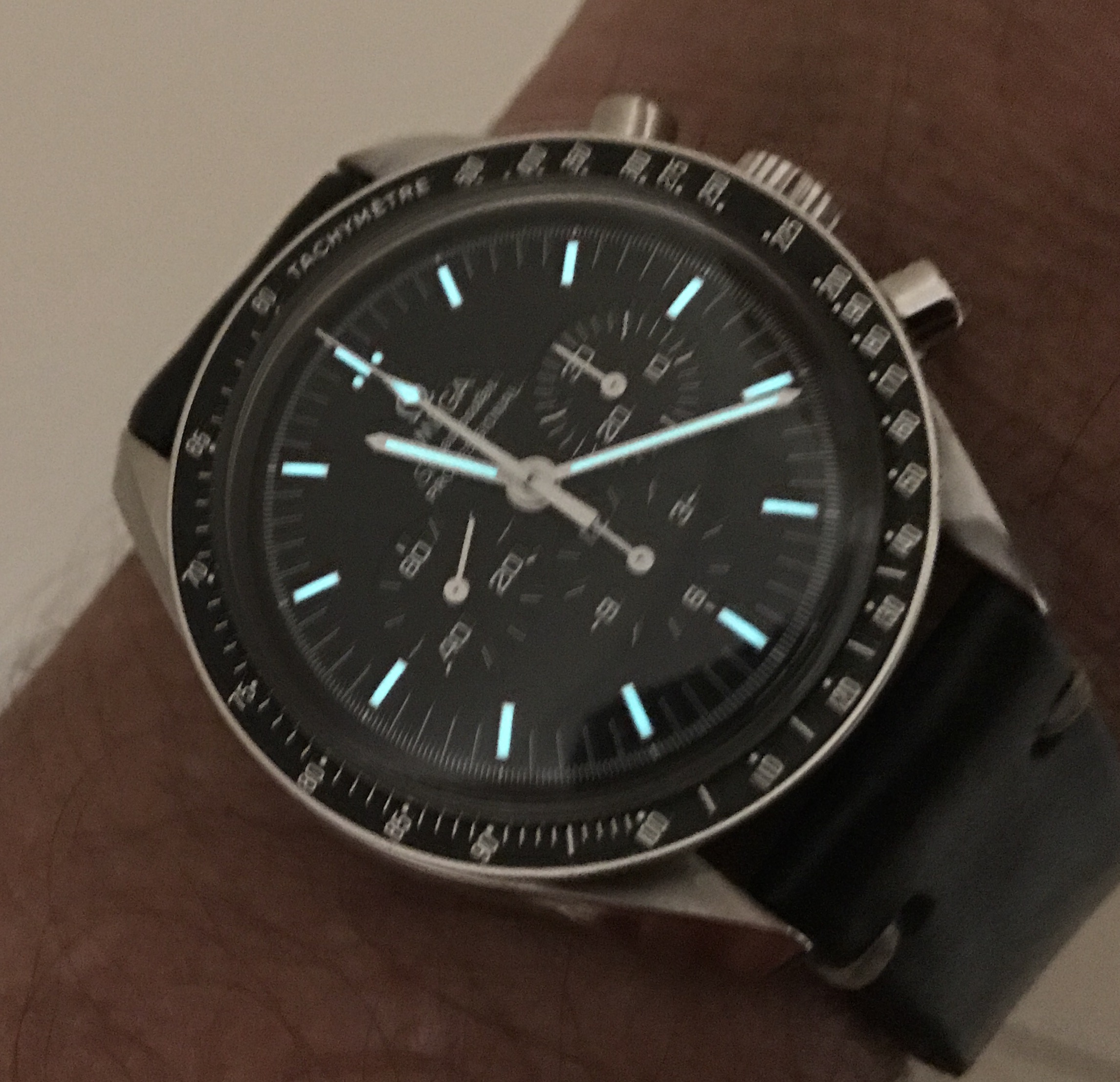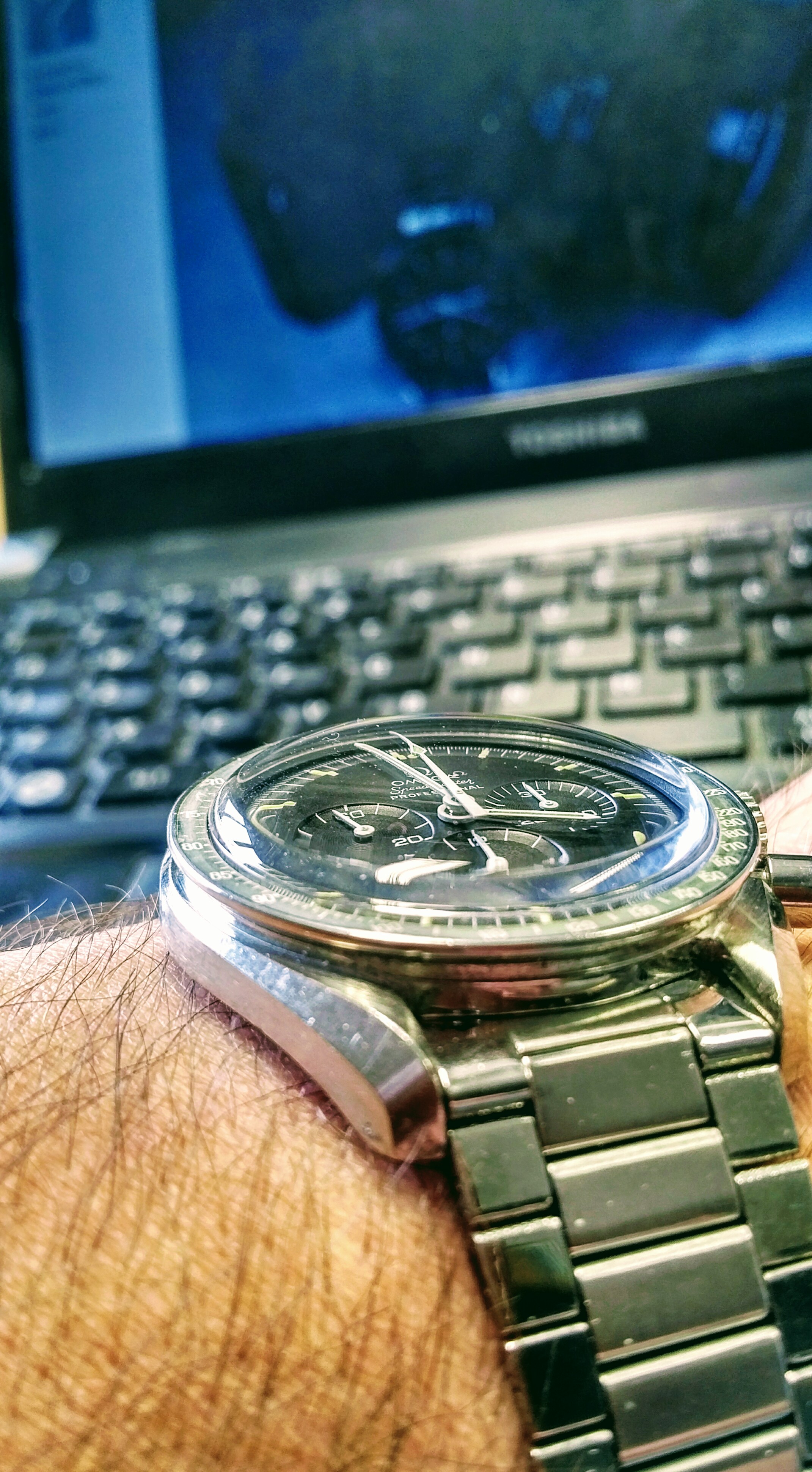 I've had this one for several years, but haven't worn it. It has always run well, but the date wasn't operating. Plastic date ring. Common problem with the Omega 1250 (ESA 9162) tuning fork models. I had made a few attempts in the past to find a replacement ring, to have repeatedly met with the same result! Not available. Recently, I was surfing eBay, and lo and behold, a dealer in a Mannheim, Germany, was listing a NOS date ring for sale. I bought it, and this is the result. The watch is on a buffalo hide strap. So today I will wear this one, and my long term tester, my1989 Rolex Date-Just which I serviced in November, 2016. As of today, it is 19 seconds fast since November. It dropped back 3 seconds at the change to MDT in March.