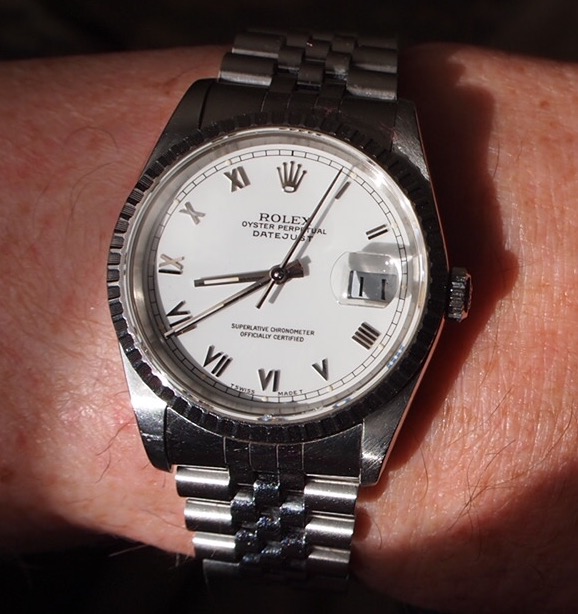 My 28-year old Rolex Date-Just. Six months on the wrist since conditioning, November 2016. Seldom does a watch of mine remain in service for that long. Last week, I had to rebuild a fence, so I took the Rolex off. Must have been off the wrist longer than I remember, because it ran down. I had to re-set it. Currently running within 15-seconds (fast) in six months!