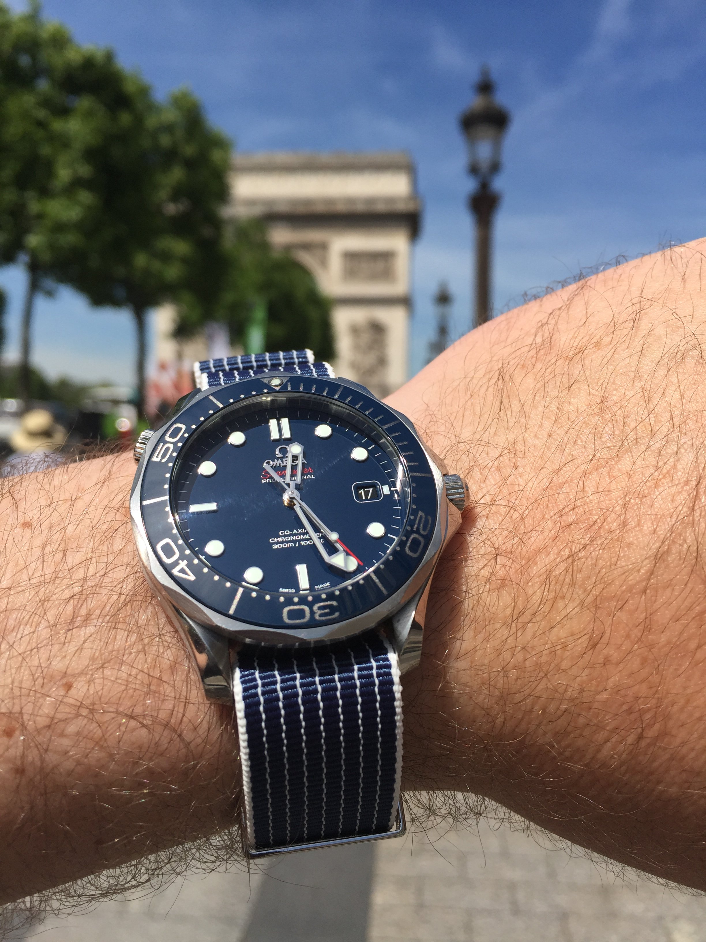 Last day in Paris. Stopped at the Omega boutique, picked up this NATO. Too much $$ I know, I know. But I'm ok with it. Finally, a NATO I like on this watch.