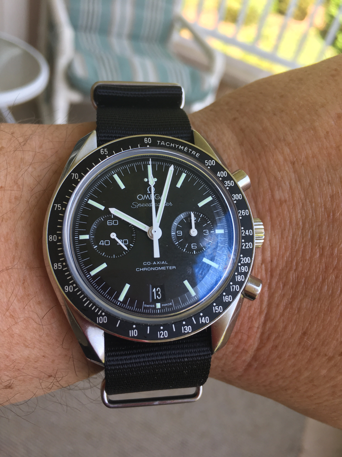 Posts 1,802 Likes 10,155 ras47 路Jun 13, 2017 I'm trying hard to like the NATO straps. Giving it a fair run on my Co-Ax Speedmaster and getting used to it. Very comfortable in this NJ heat and humidity. The buckle sits on the side of my wrist but it's ok there. Basic NATO in 1mm black nylon from WatchGecko.