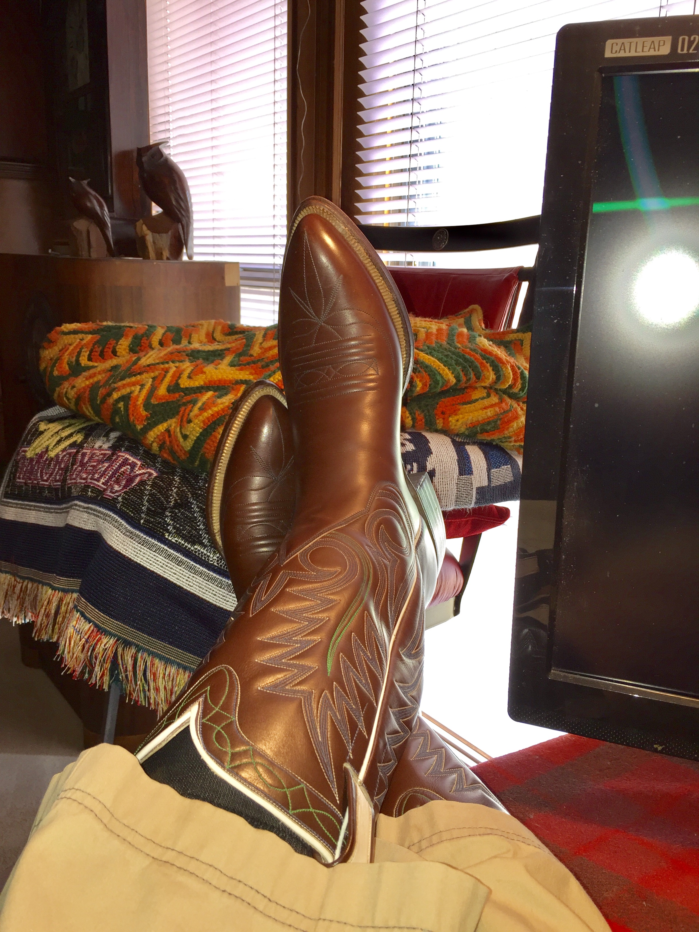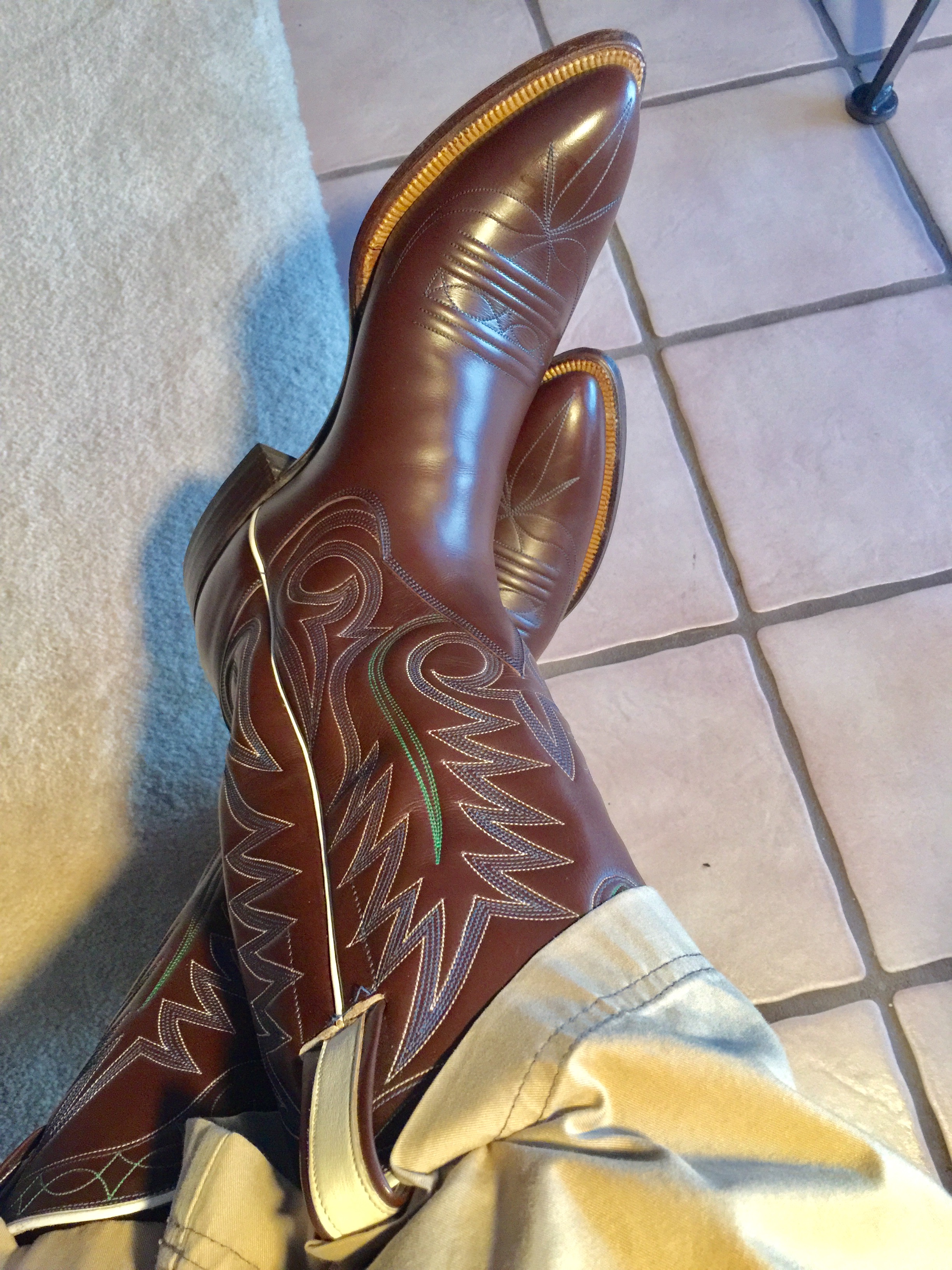 Ray Jones boots circa 1970's I bought them NOS from original owners grandson about 7-8 years ago. As close to NOS as you can get, anyway. Absolutely one of best ever Texas Bootmaker. Yes, I baby these. Mostly wear around house and condition them. But on a Special Occasions, they make an appearance. Today is such a day.