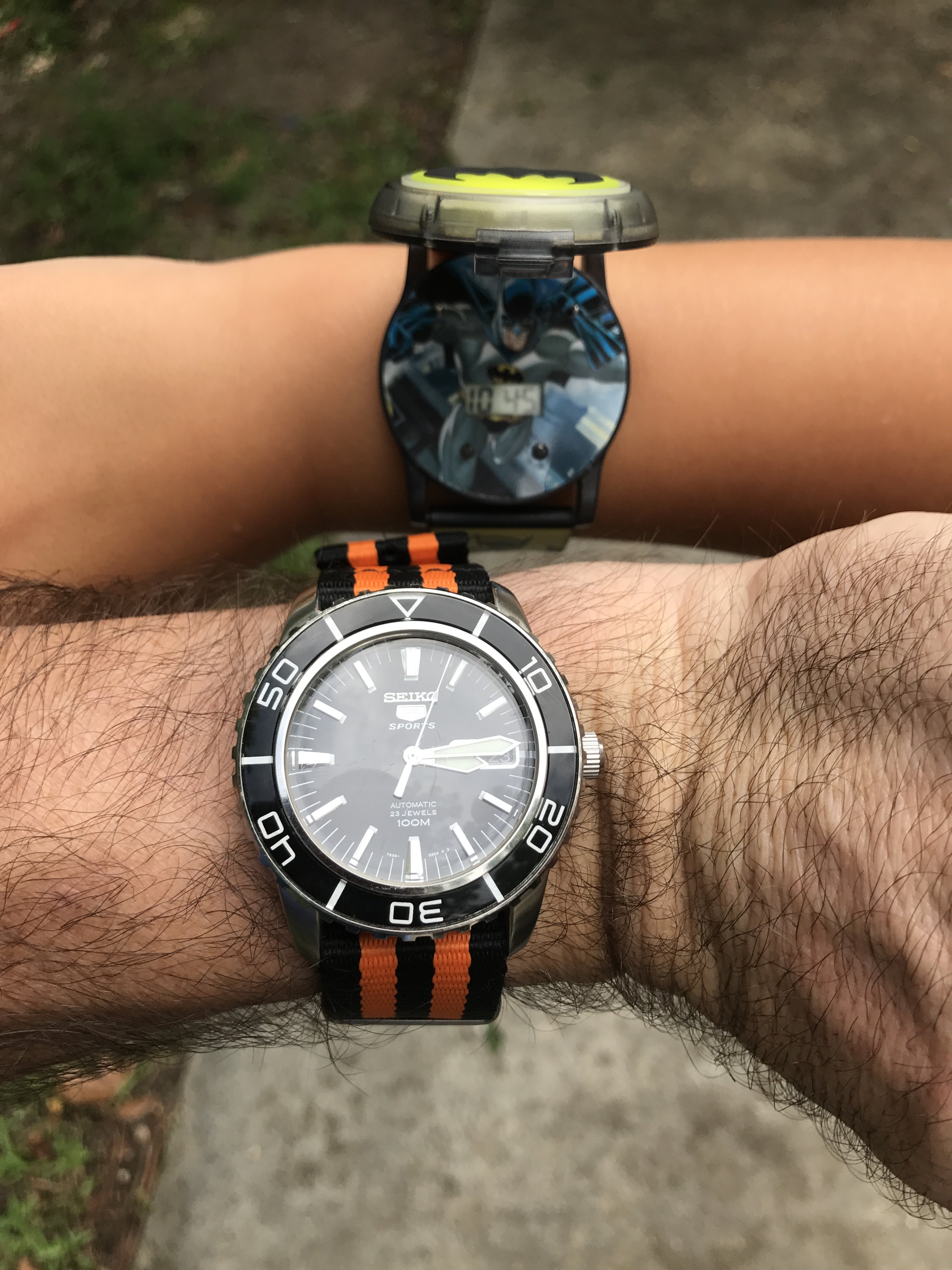 I put this up on my IG yesterday but thought I'd throw it up here too. My oldest son turned 5 Friday and asked to buy his first watch yesterday. I jumped at this opportunity and we went shopping. I jokingly said he picked up a "Quartz Target Reverse Flyback digital BLNR"...here's my first father soon wrist shot!! Hopefully many more over the years to come!!