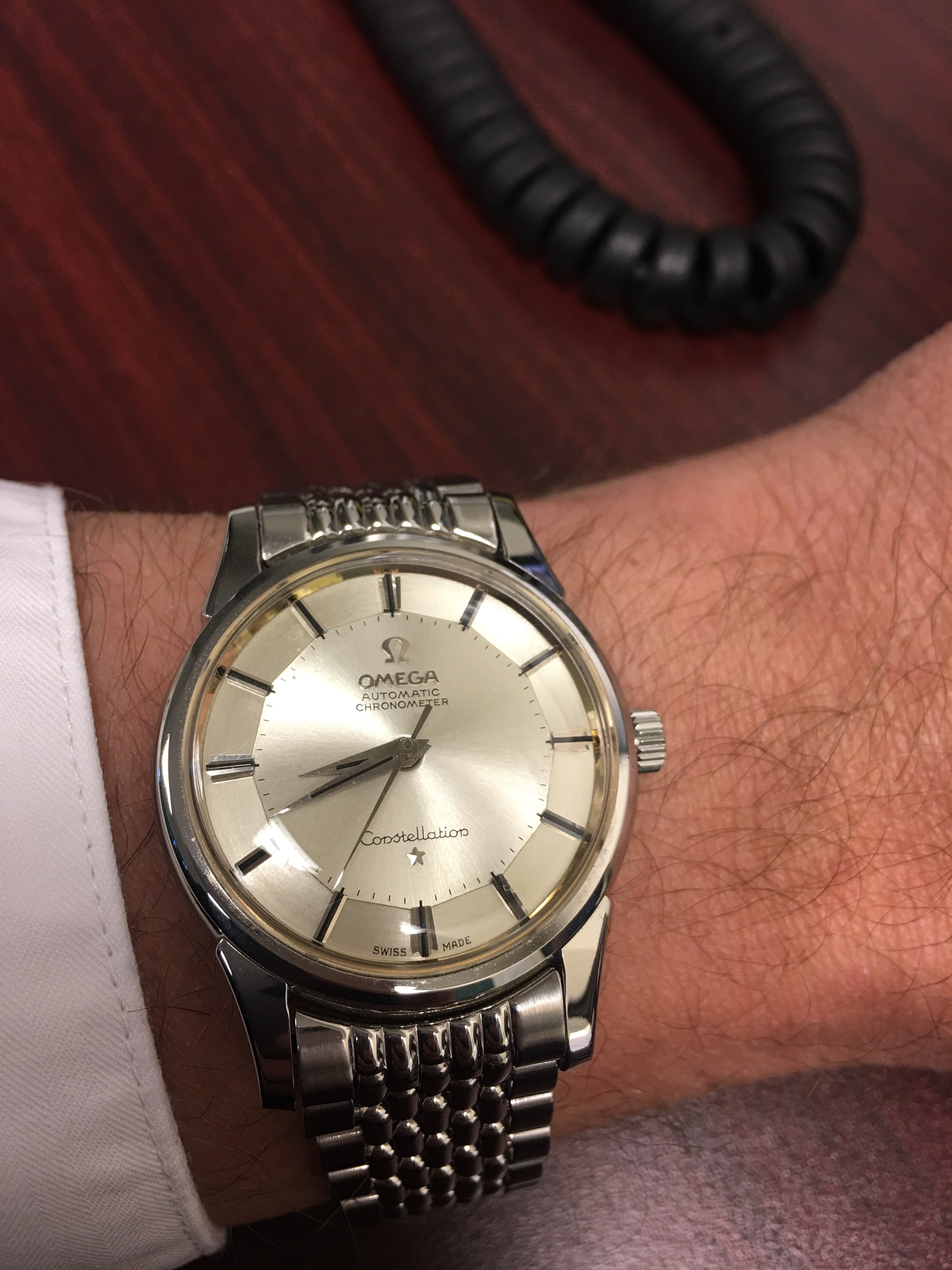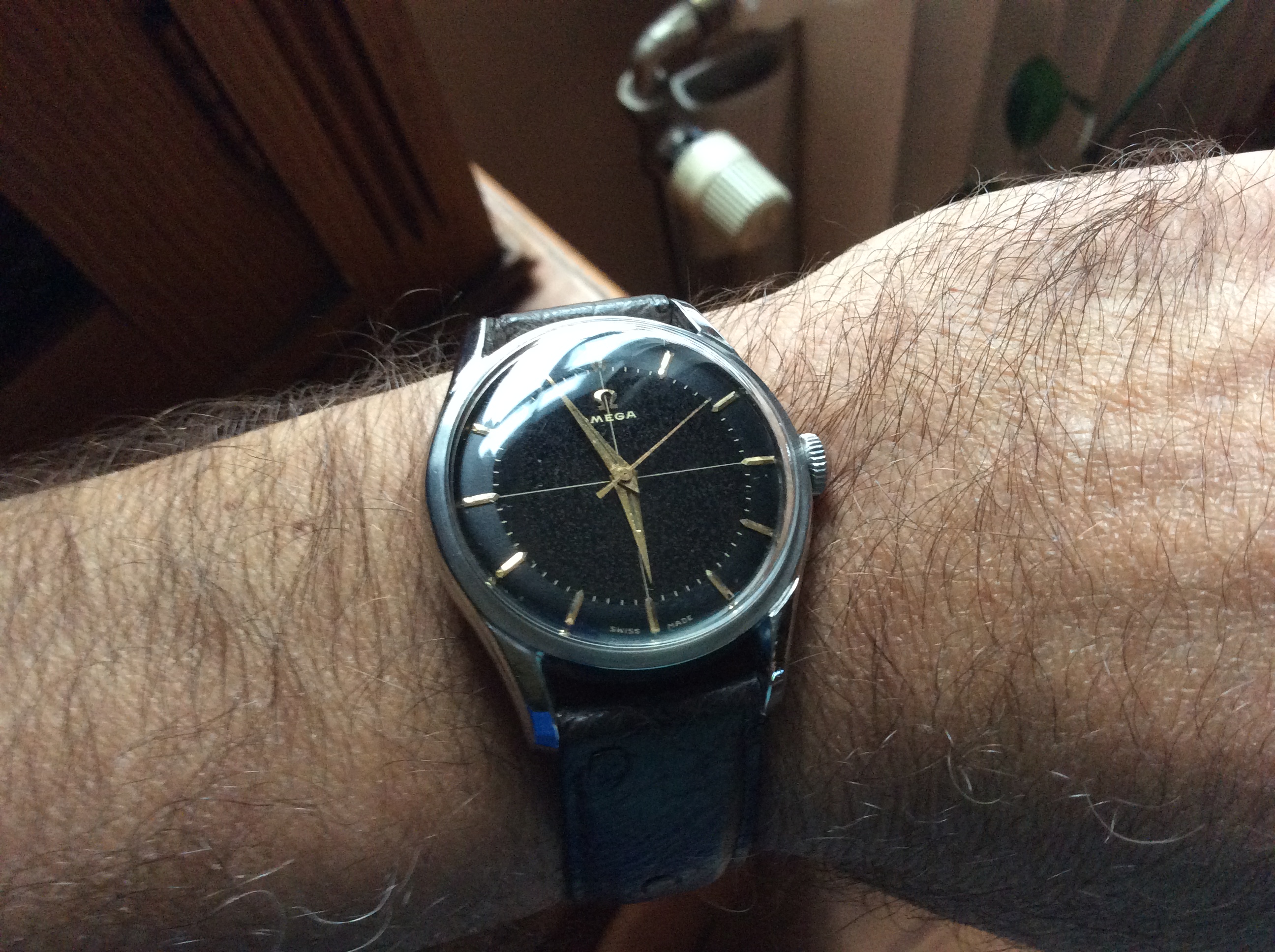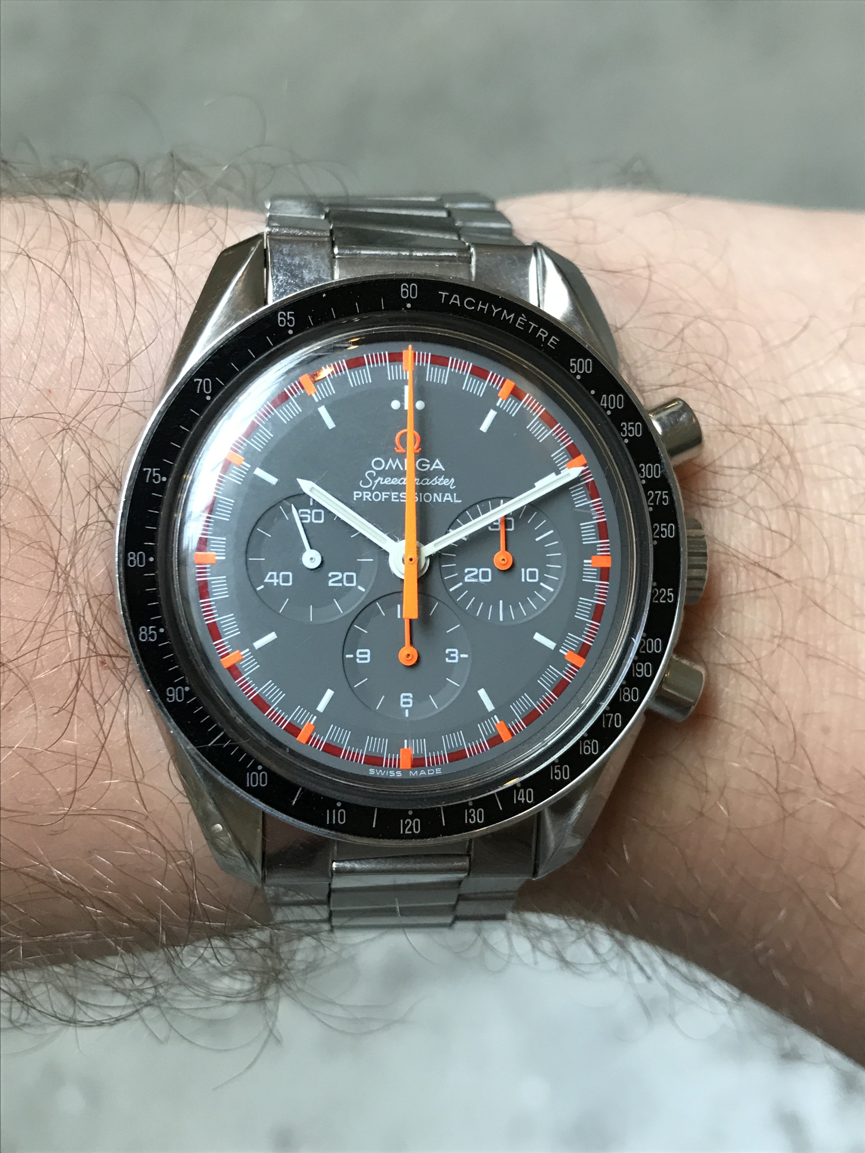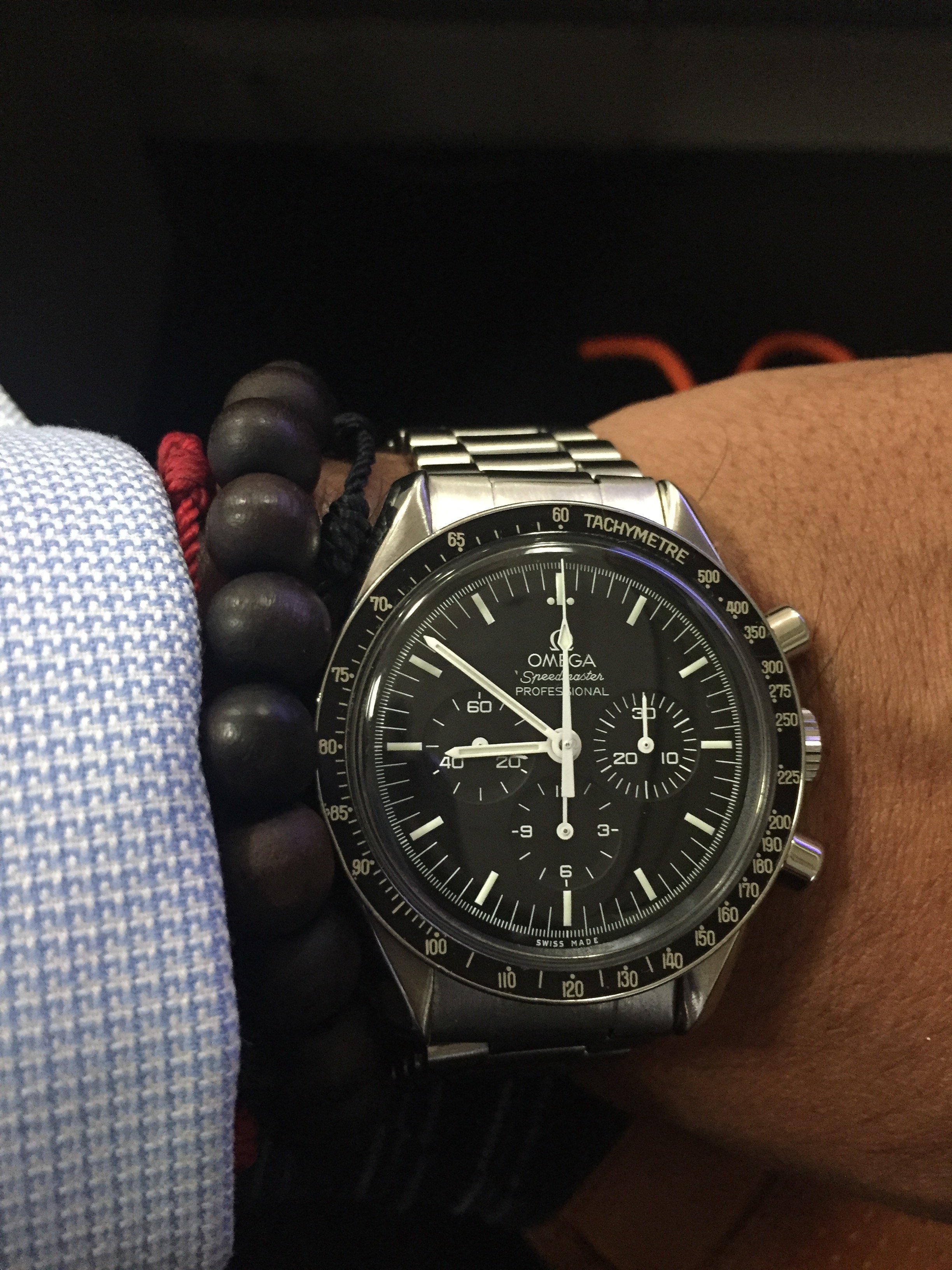 Tried in a buddy's Speedy Reduced today, just for grins. Nope. Too small on my ham hock 7 3/4" wrists. Plus I've gotten used to my co-axial Speedmaster so the difference was shocking. Likewise, my 44.25mm model completely eclipsed her dainty wrist. Strapped my co-axial back on my wrist and there it shall stay.
