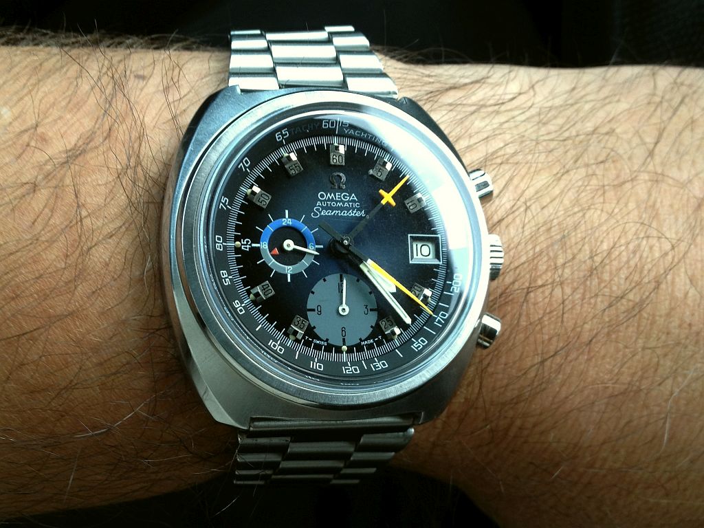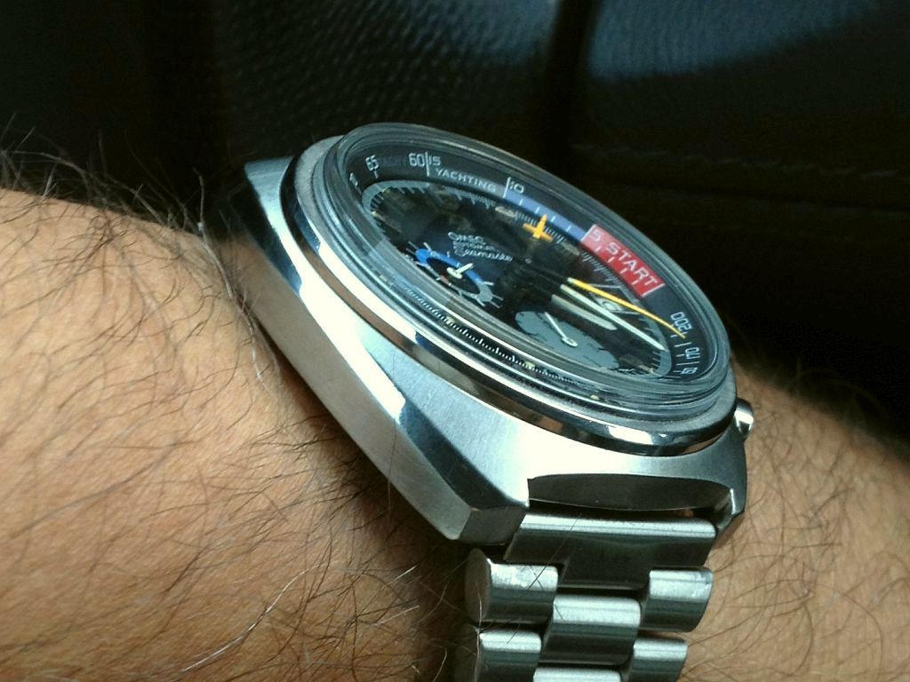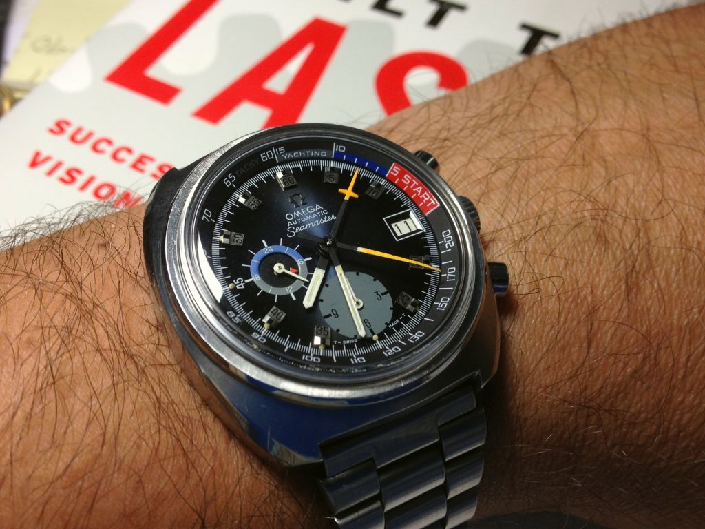 New arrival acquired from @Andy K: Seamaster Yachting chronograph 176.010 with sunburst dark blue dial. I can confirm what the reviews say: despite the interchangeable dials, this model is larger and wears larger than the 176.007 cal 1040 variants. The case has an extra polished bevel as well as a step around the crystal's perimeter adding complexity.