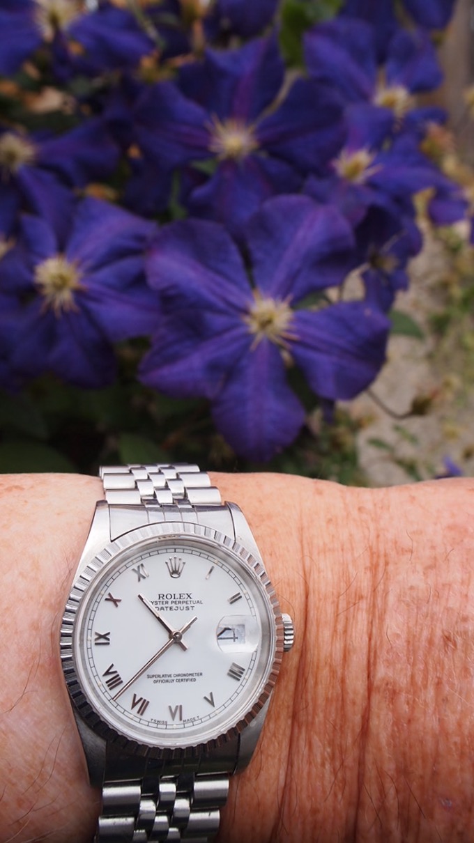 Happy Labor Day. The Date-Just again today. Out in the garden with the clematis while it is still in flower, and in the greenhouse with the oncidium orchid "Dancing Lady", now in full bloom with about 30 flowers.