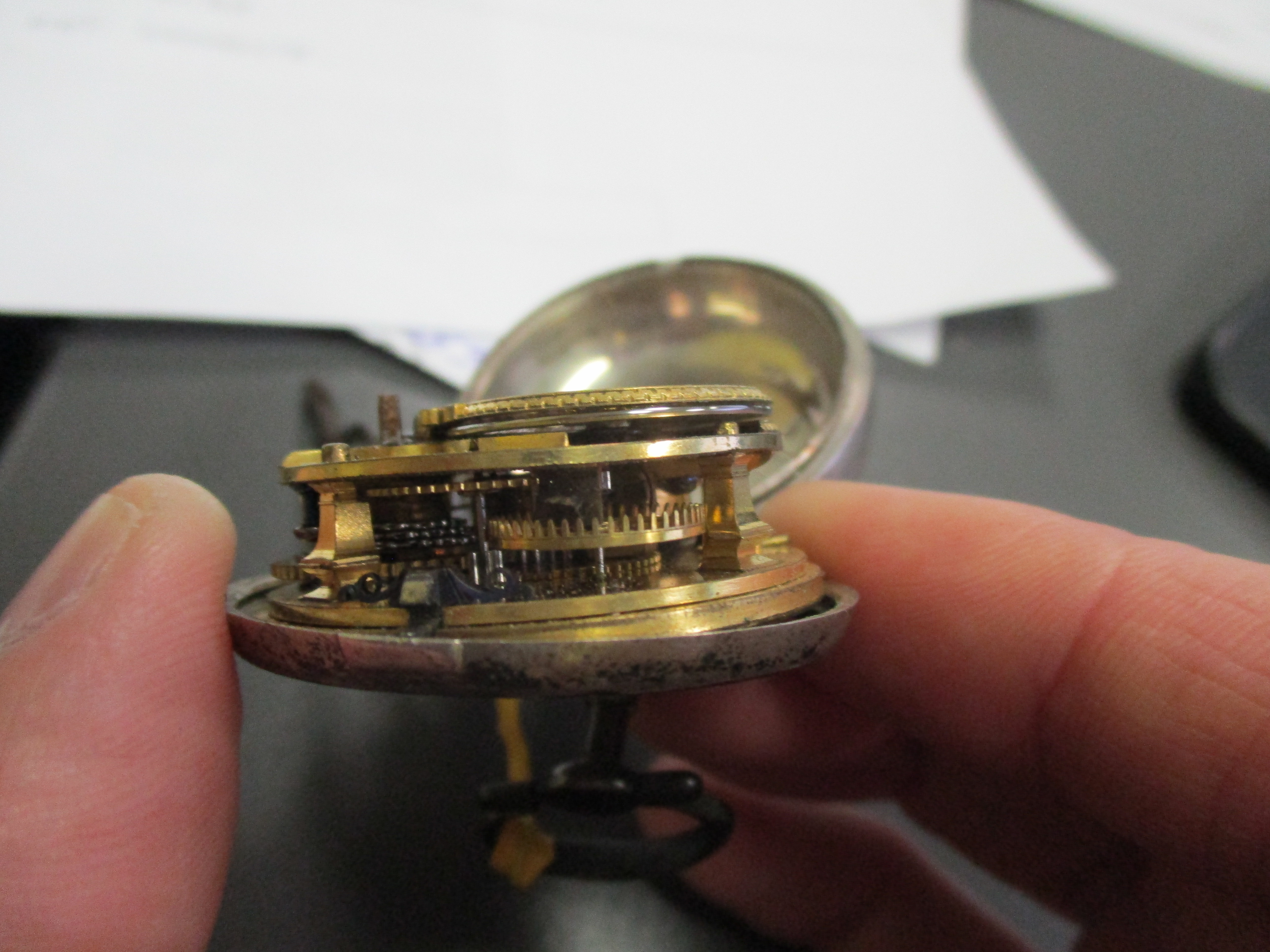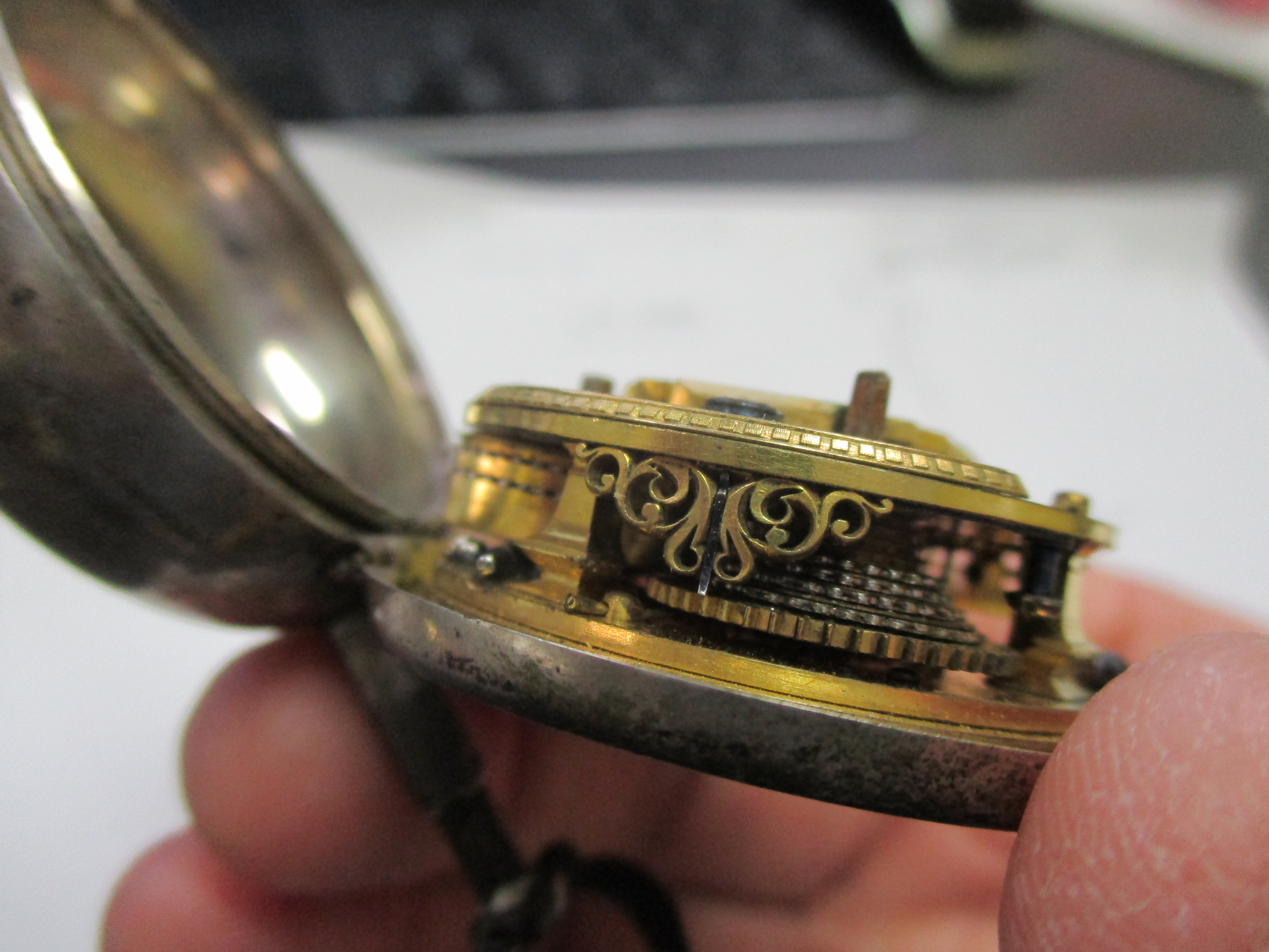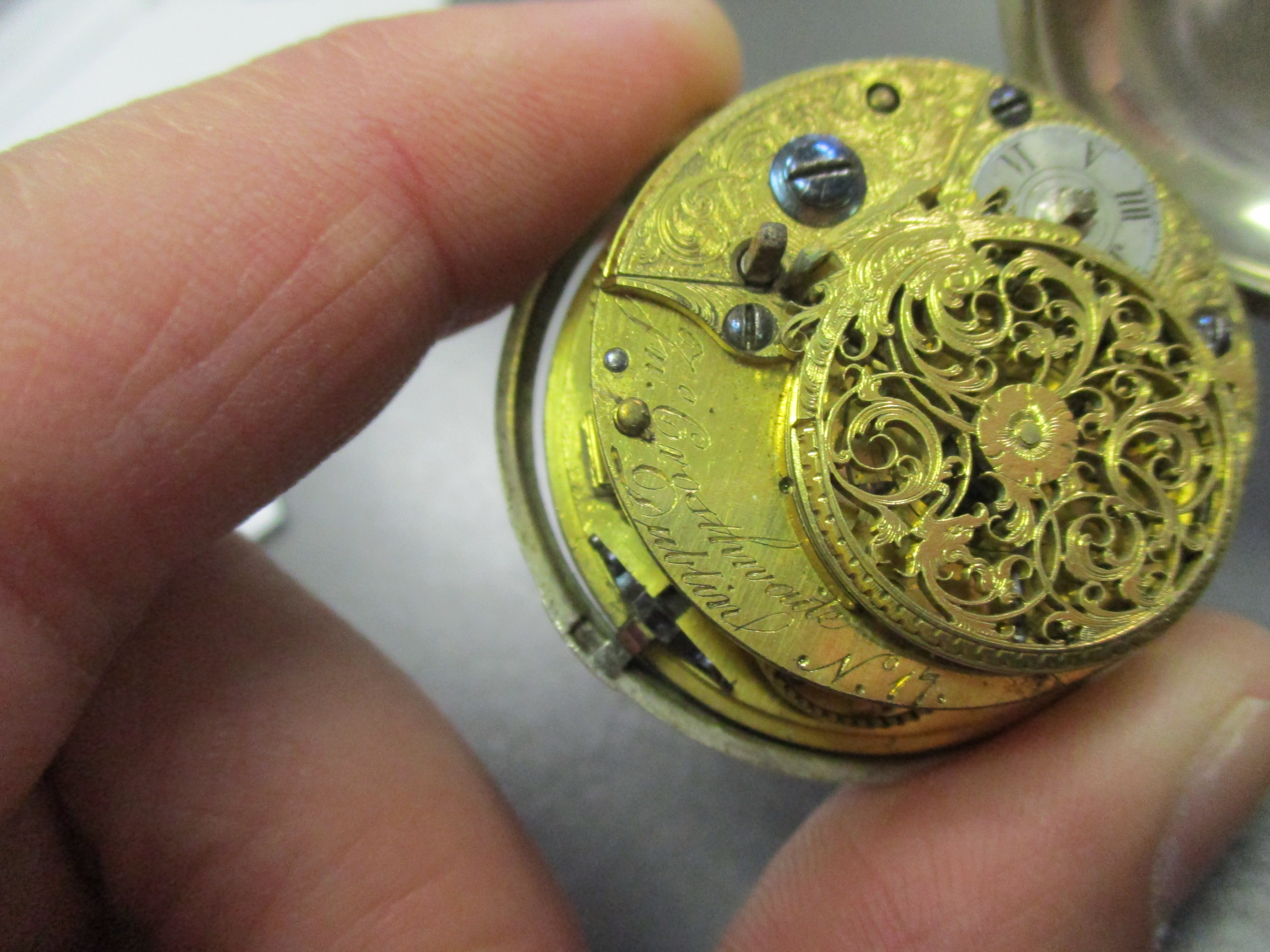 Posts 3,819 Likes 16,164 Fritz ·Oct 16, 2017 early 20s Illinois... BUT.... I was outdone at work today! one of the guys at work, knowing my addiction to watches says " here, I brought in my grandad's watch for you to look at" I expected one of the usual: a 1920s 12 size American pocket watch in poor condition but NO! We got this! An Irish made (Dublin) silver pair cased verge with a fusee from the mid 1770s.... and the friggin thing is running! WOW!!! and all that scroll work... the pretty piecing of the balance cock... all hand done!