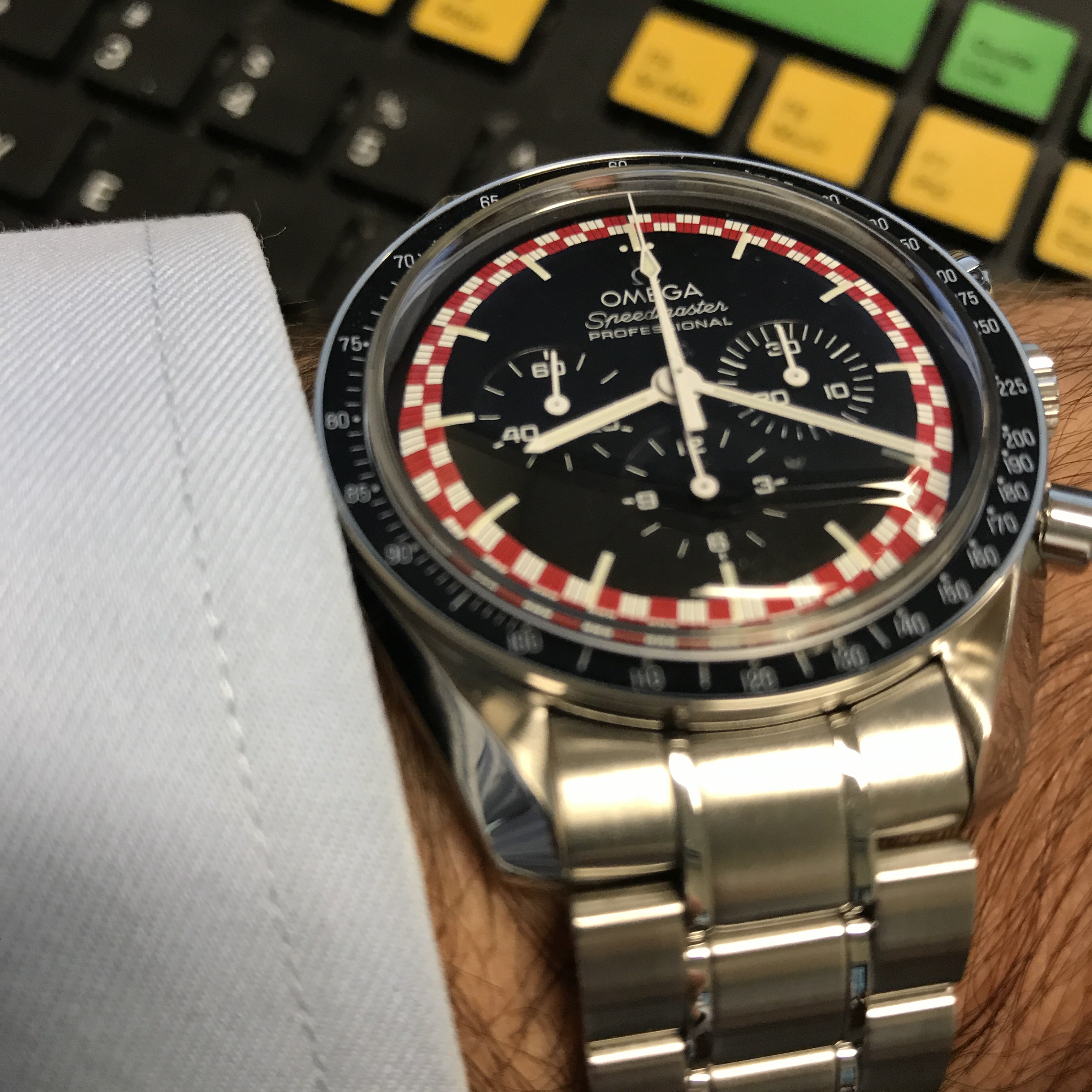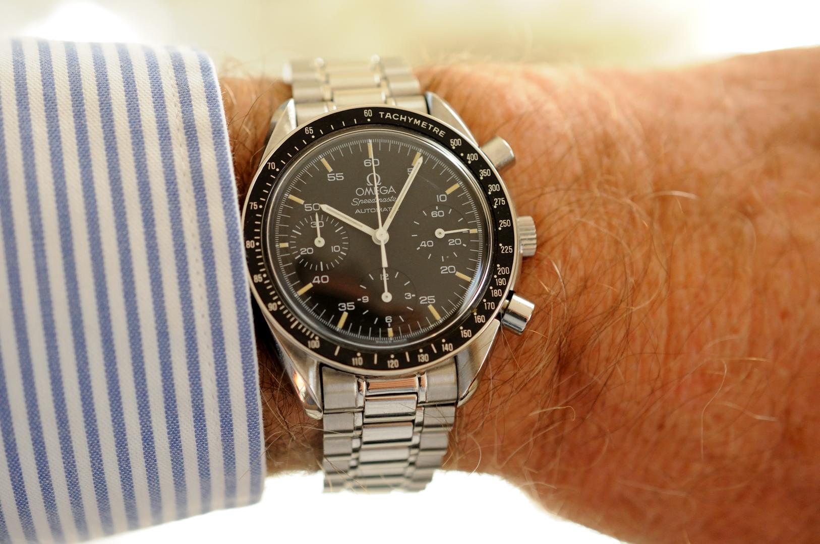 I'm sort of smitten with this watch; now I have a Speedmaster Pro transitional - it was the watch that got me into my fascination with mechanical timepieces - and it's the crown jewel of my very humble accumulation. But I don't really like big ass 40mm+ watches. This 38mm reduced though I find just about perfect on my wrist. You hardcore Speed freaks can sniff at it all you like but this, for me, is a great wearing, great looking watch...