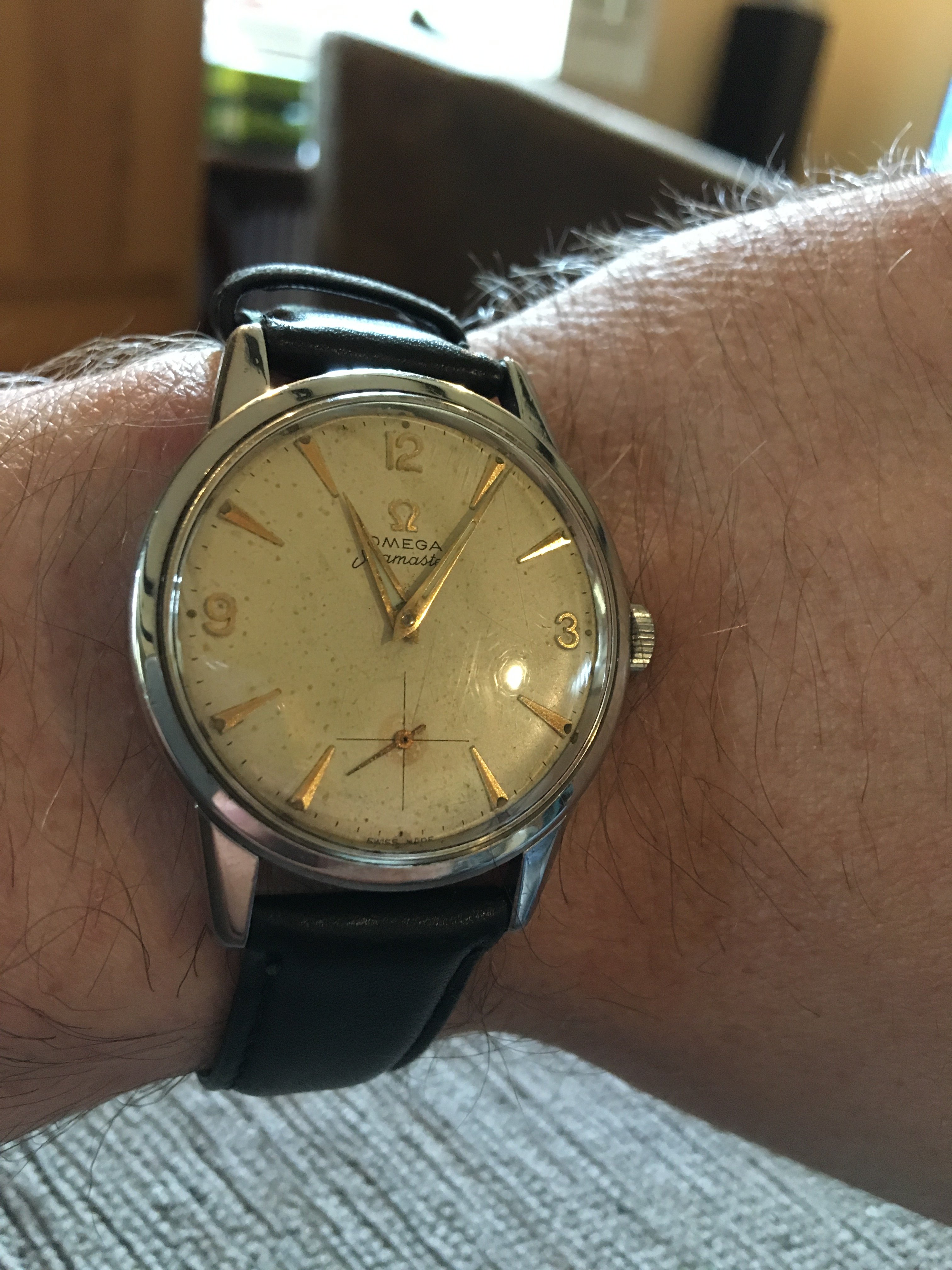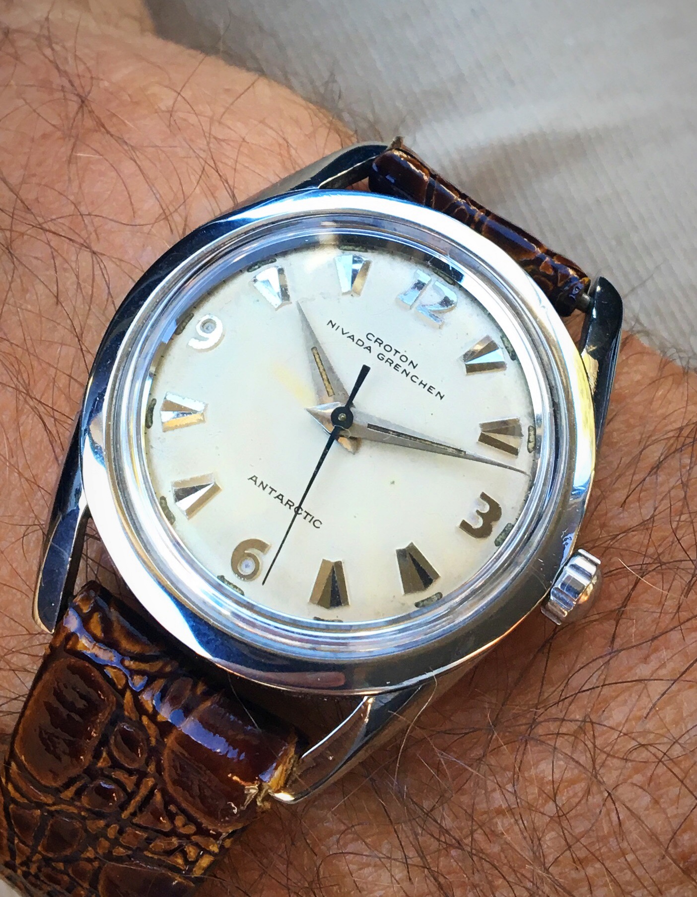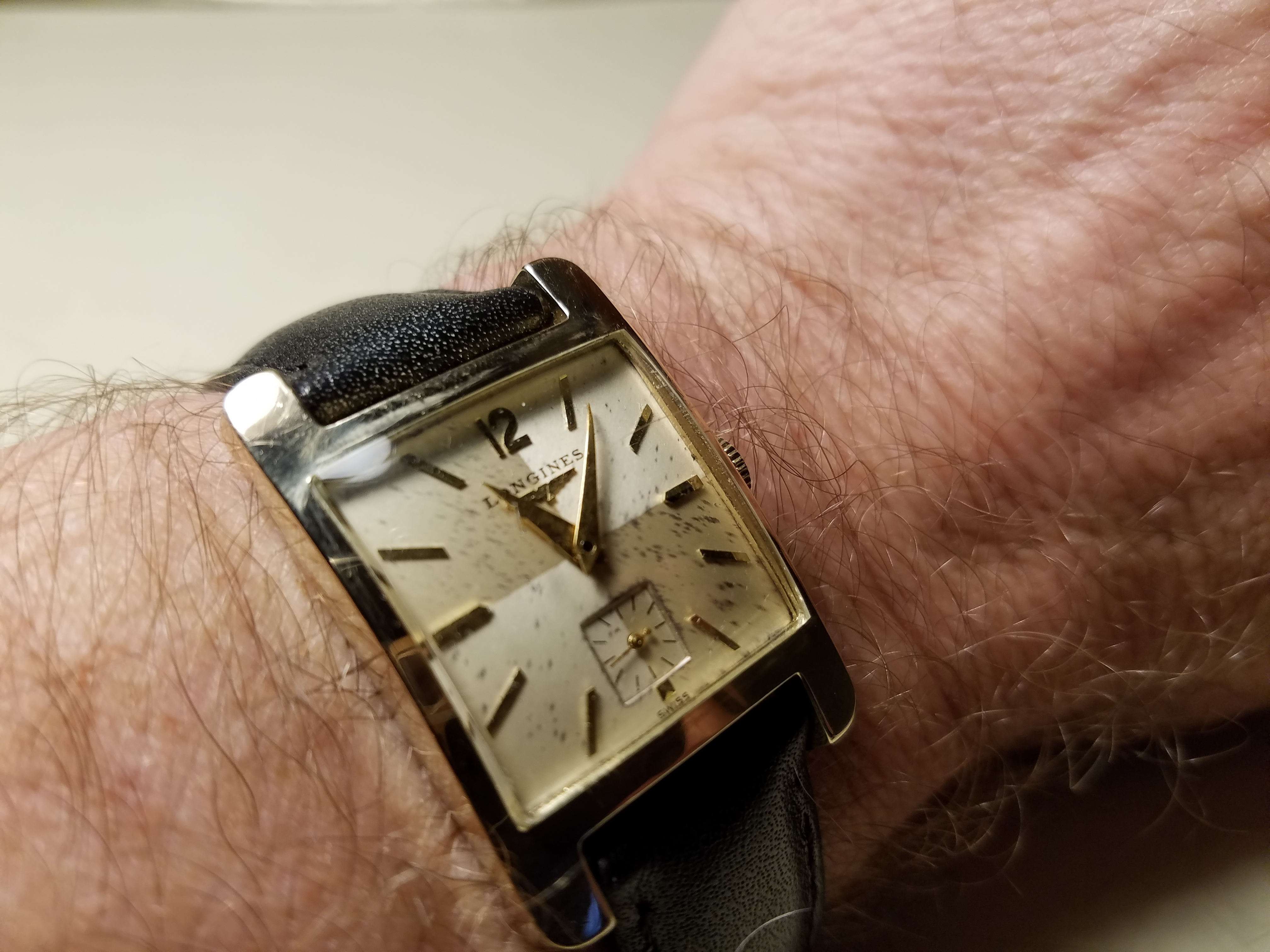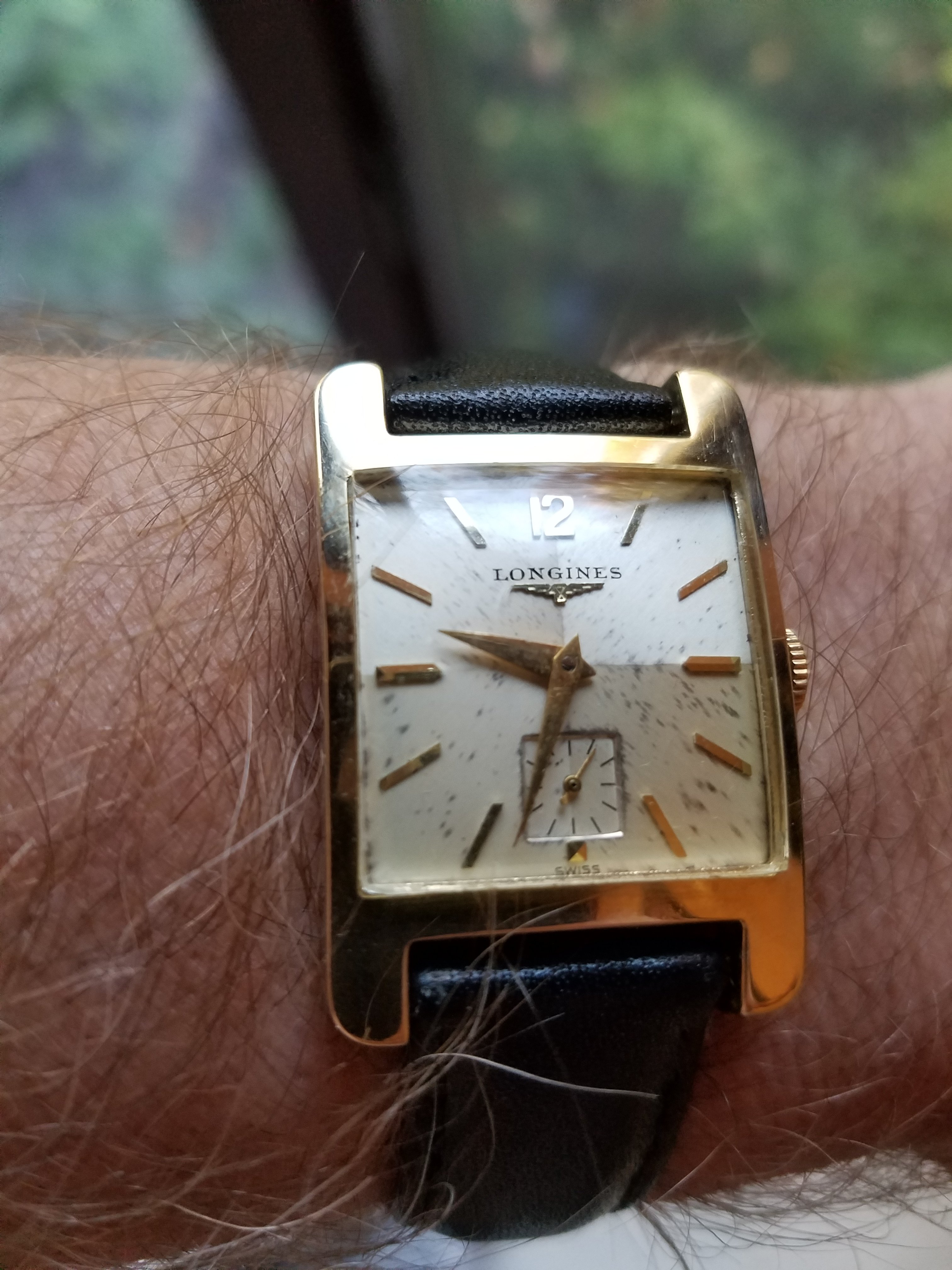 Friday is my day off, starting the weekend early after working 4 12 hour shifts this week, so I am wearing a vintage, snap back 14K gold Longines President Coolidge model that I picked up from my old retired watchmaker. Lots of patina, but that is just character. There is a deep scratch at 10 o'clock and I am looking for an original glass crystal replacement if anyone can help me out. Thank you for looking.