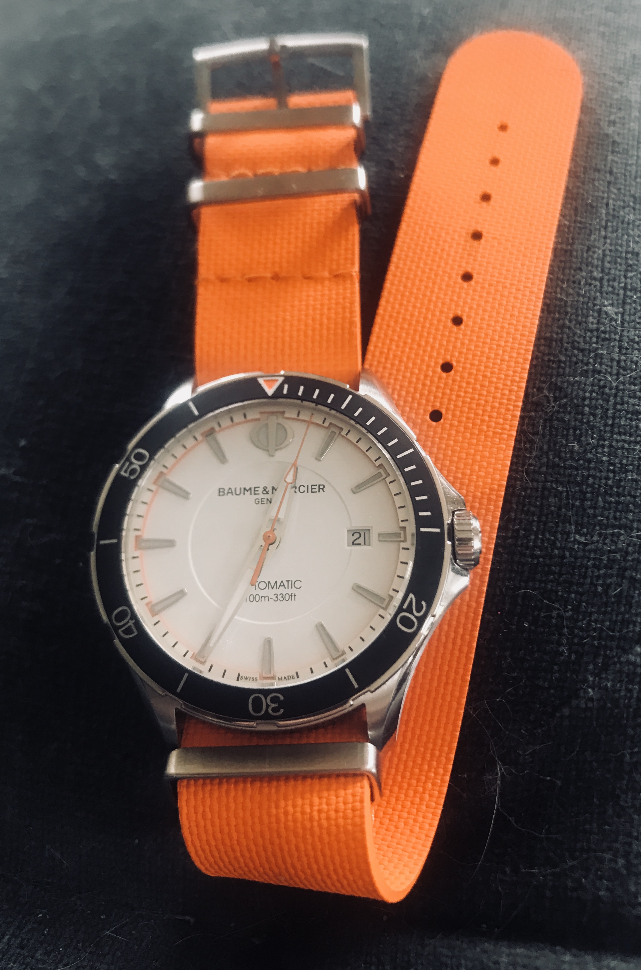 Posts 6,832 Likes 13,797 Nobel Prize ·Oct 21, 2017 On a rather unique restaurant Baume Mercier rubber NATO. Not the most comfortable to be honest, but I was curious about it