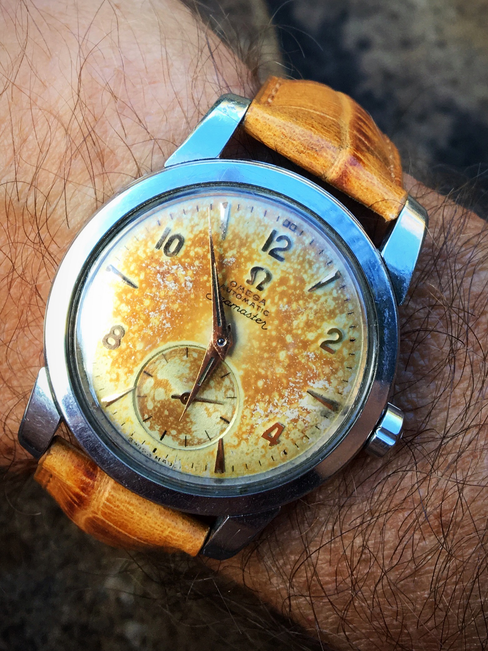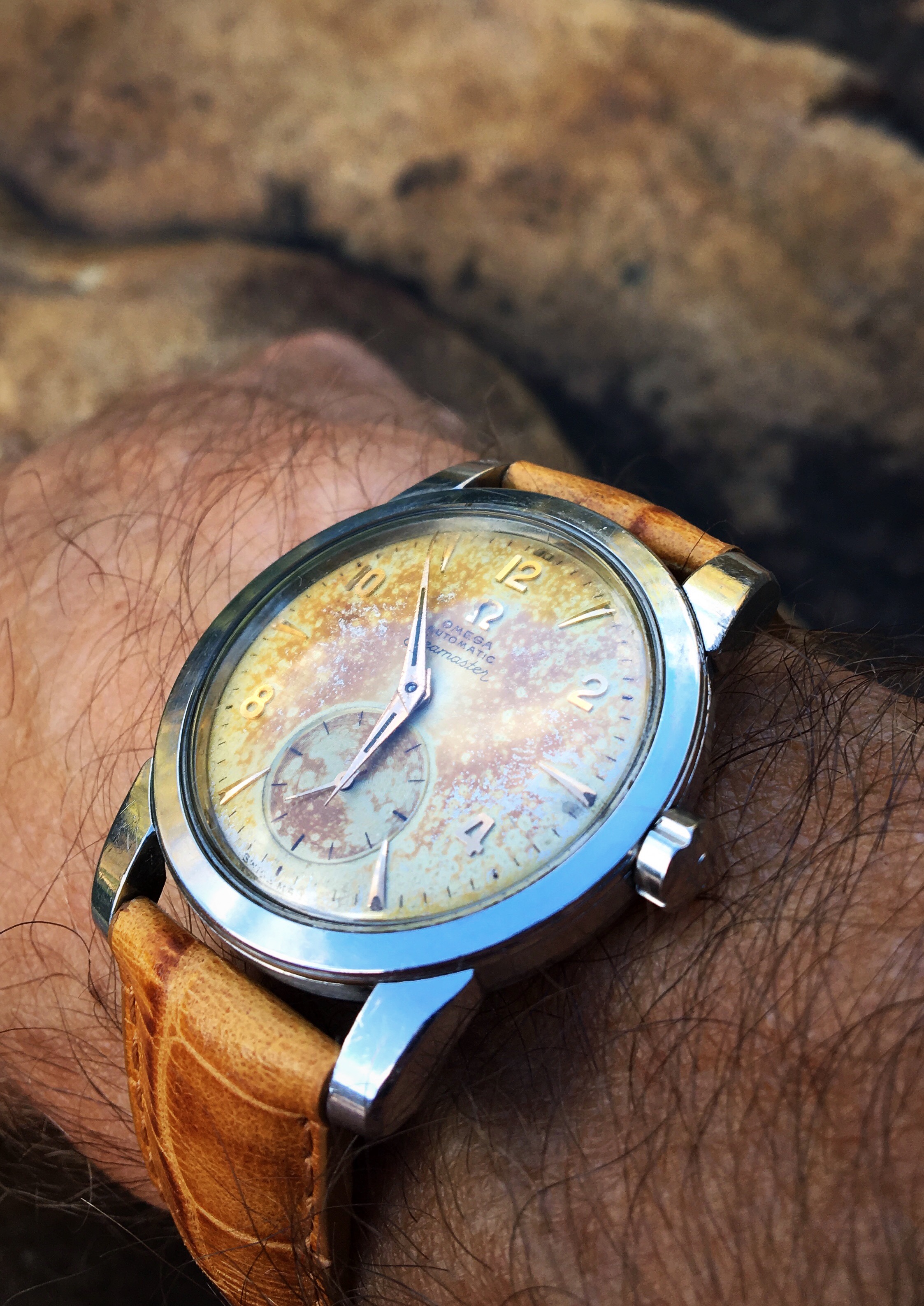 Posts 7,293 Likes 76,579 dougiedude ·Oct 23, 2017 Another watch back from a full service, and forcing a ‘Double-Dog’ evening! ... who can guess which ΩF chap sold me this little patinated beauty?