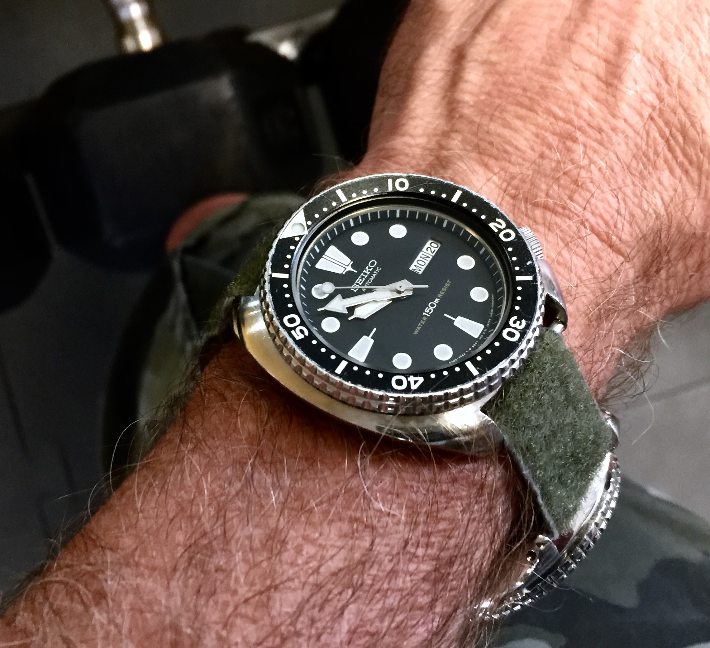 Pic from earlier today at the gym...the meatheads always think twice about kicking sand in Mad Dog's face at the gym...because Mad Dog wears two watches [a Seiko 6309-7049 and a Seiko SRP777K1] on one camo band at the gym...as well as matching camo cargo shorts. Very intimidating. Yes. 😁