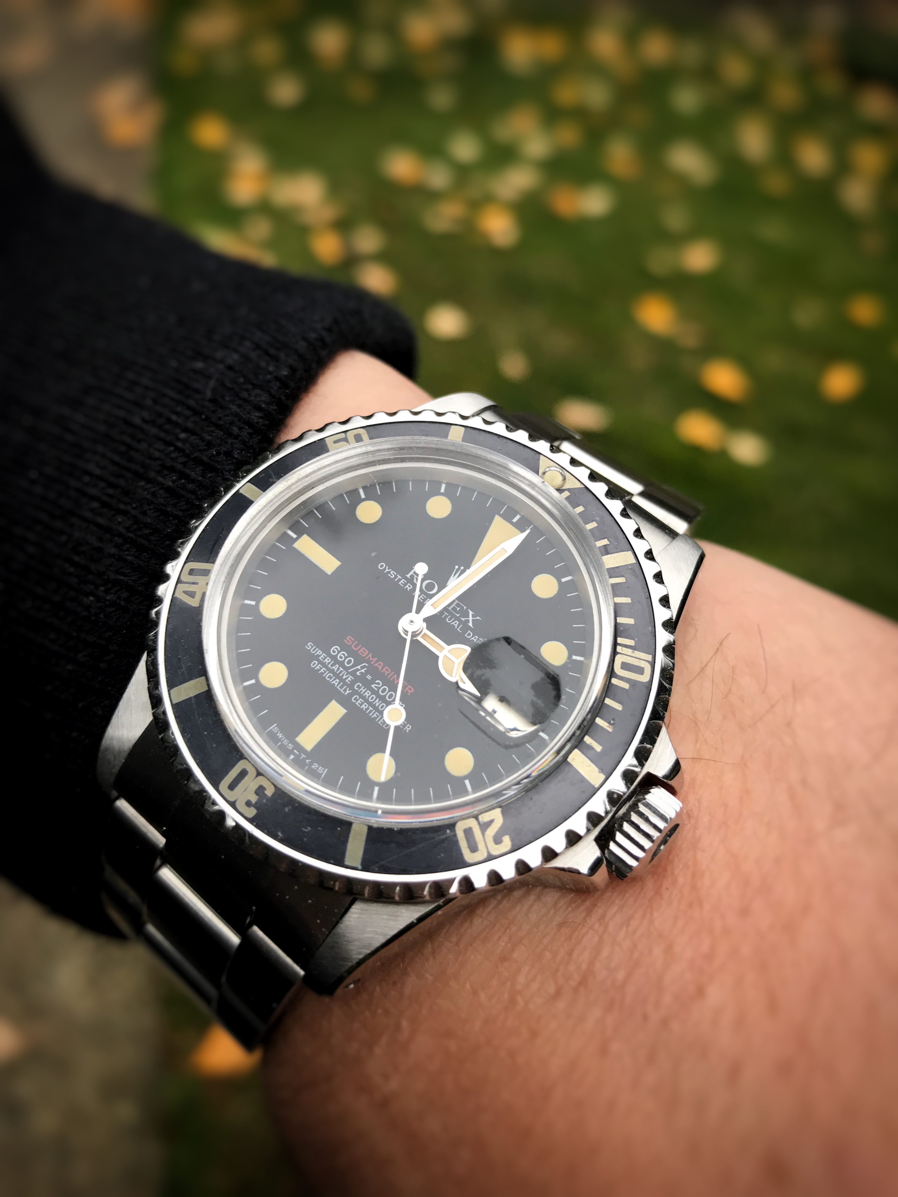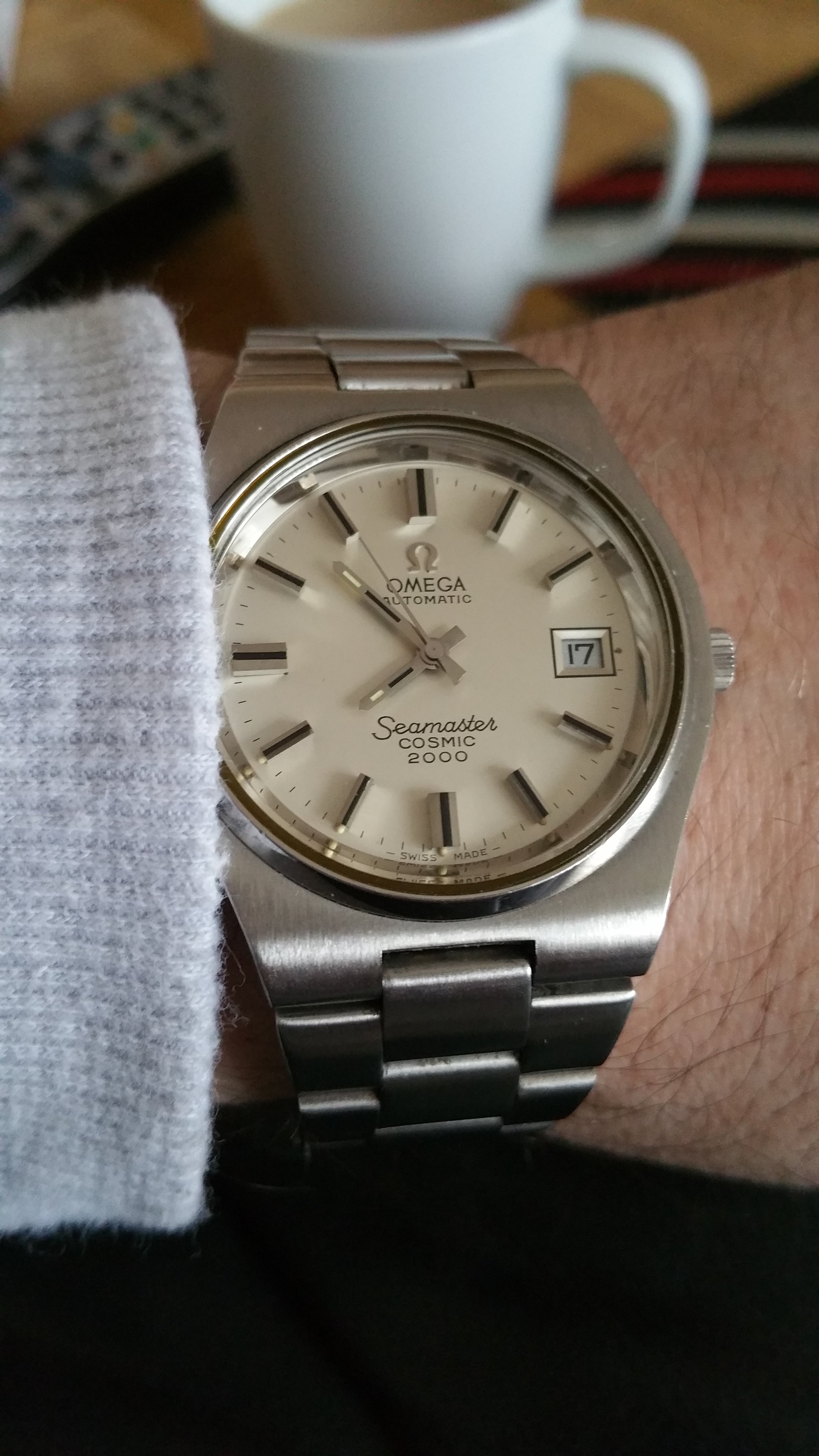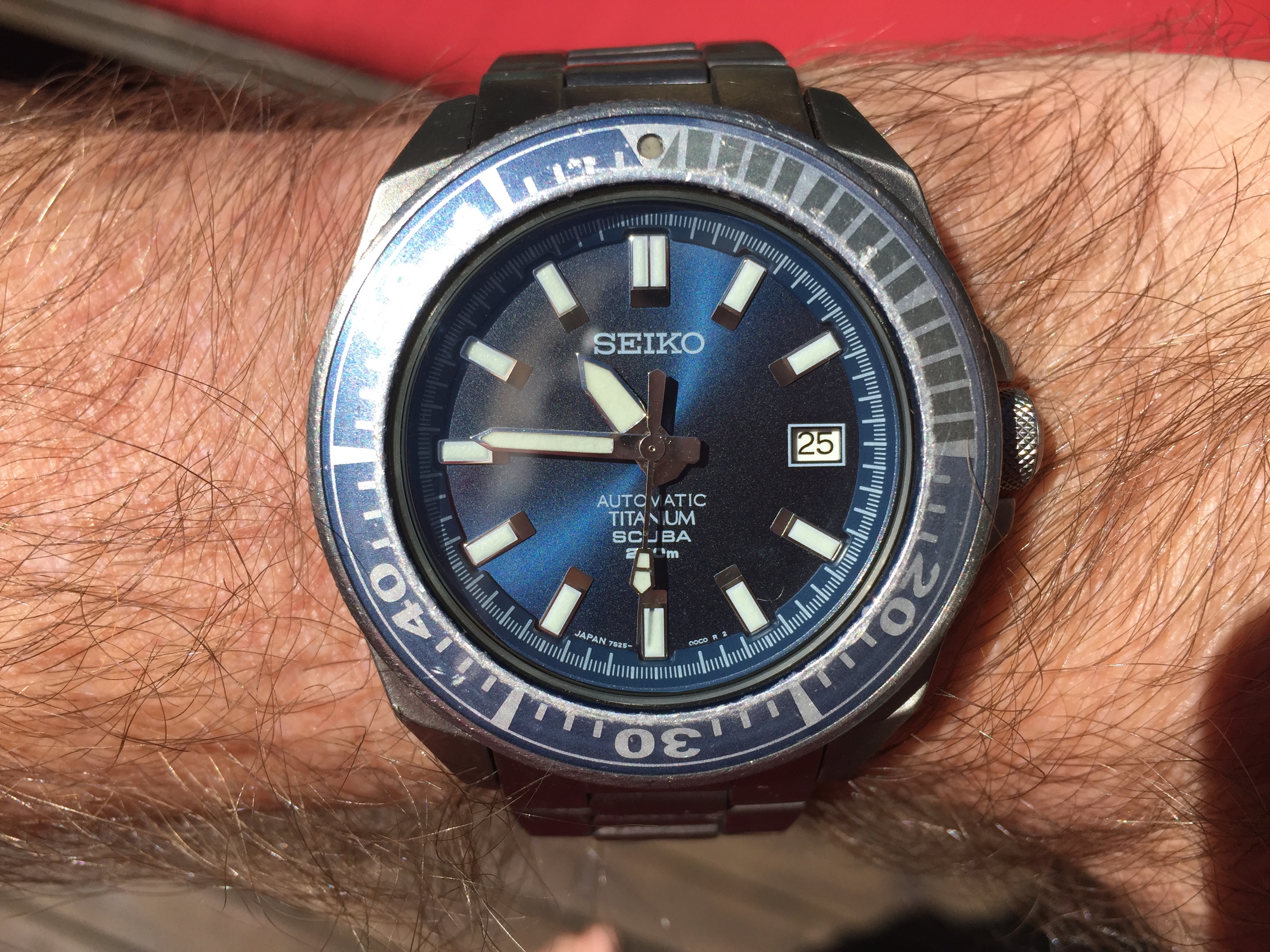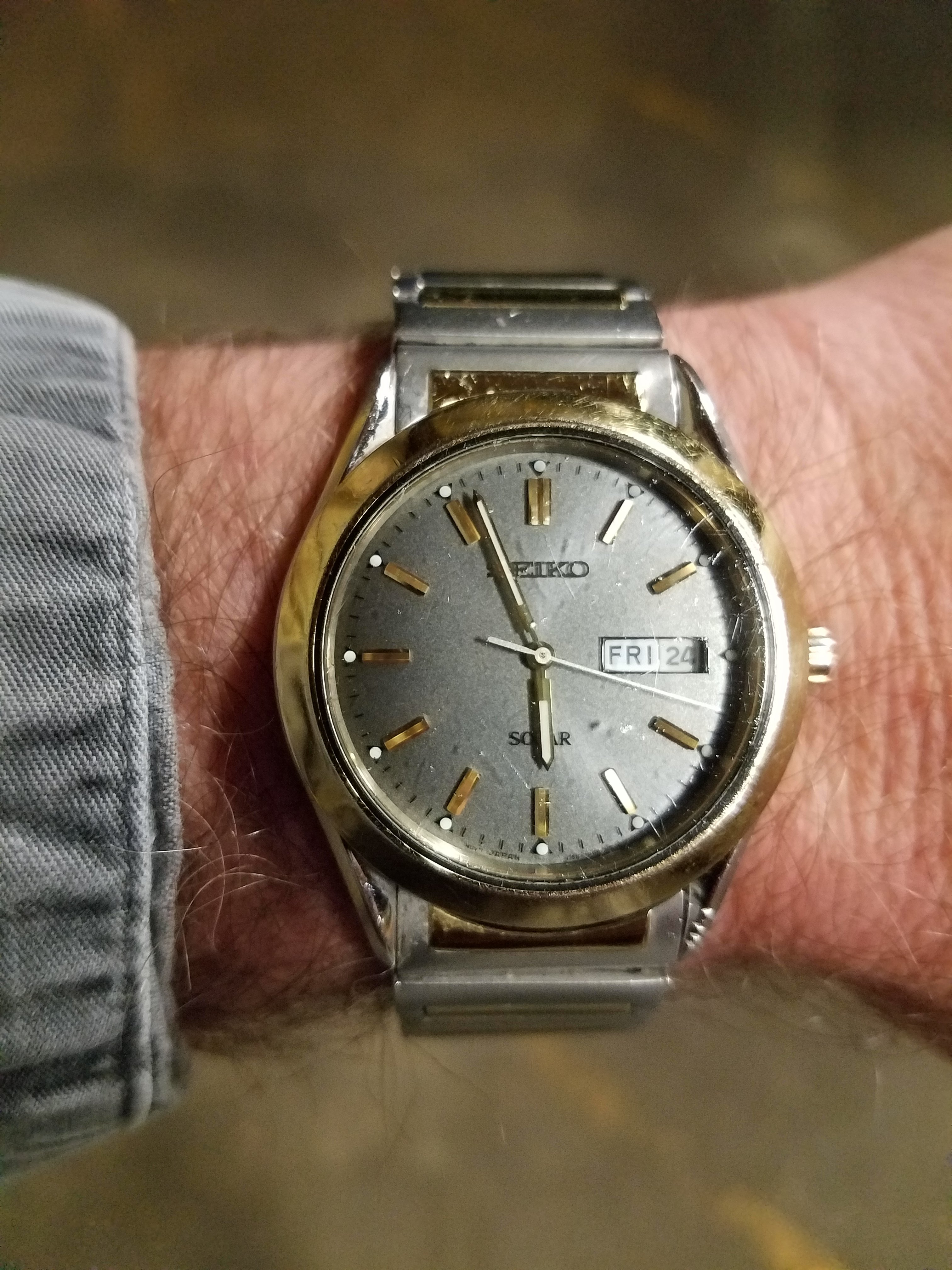 Back to work, nightshift, after the holiday here in the U.S. so it is back to my $4.20 thrift shop solar Seiko. I saw what looked to me to be the modern equivilent or model of this watch a couple of weeks ago at J.C. Penney. Case shape and bracelet were changed very little.... $265. It shows it's age, but it keeps perfect time. And I just realized the dial and my shirt match perfectly tonight! LOL