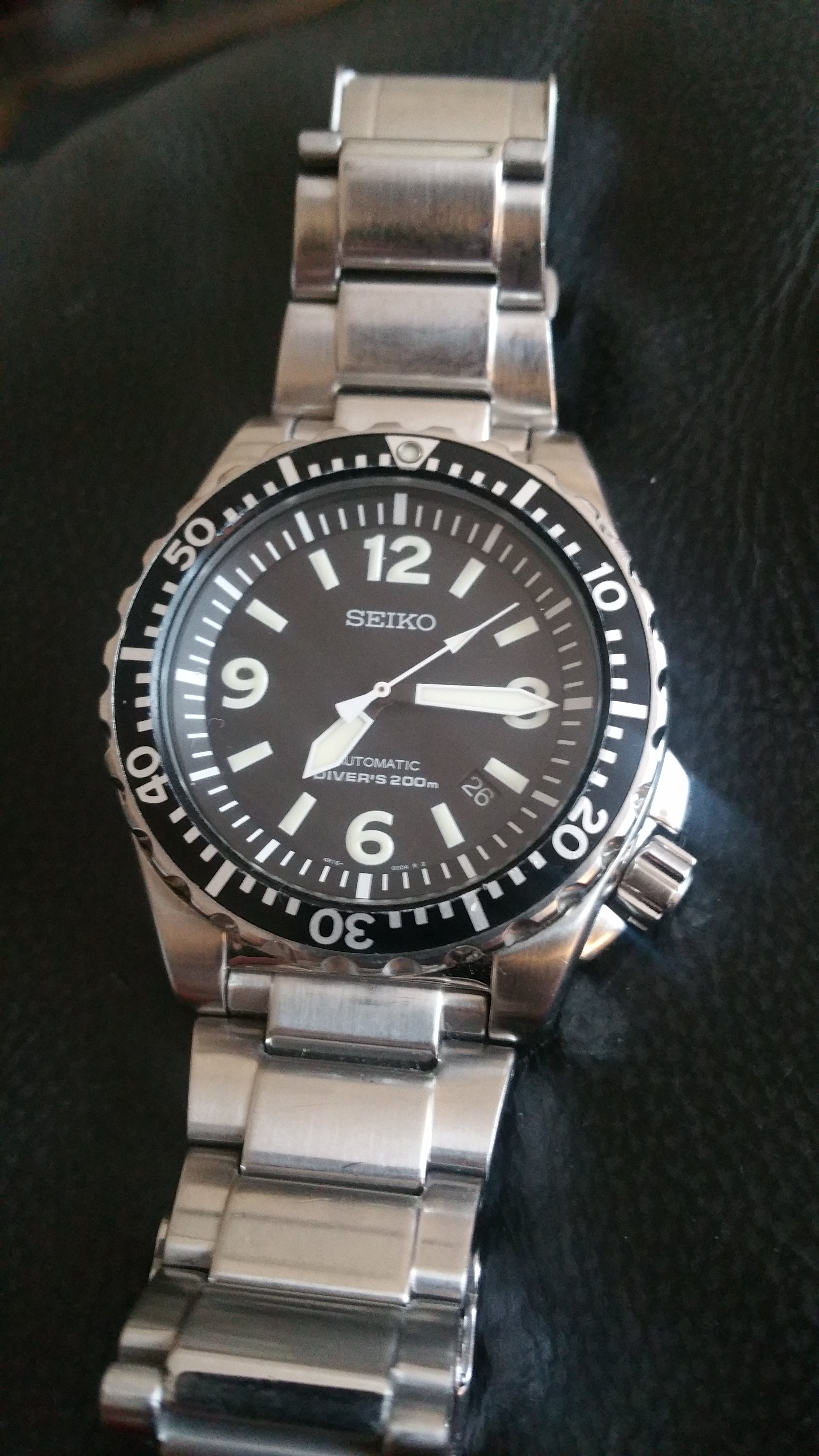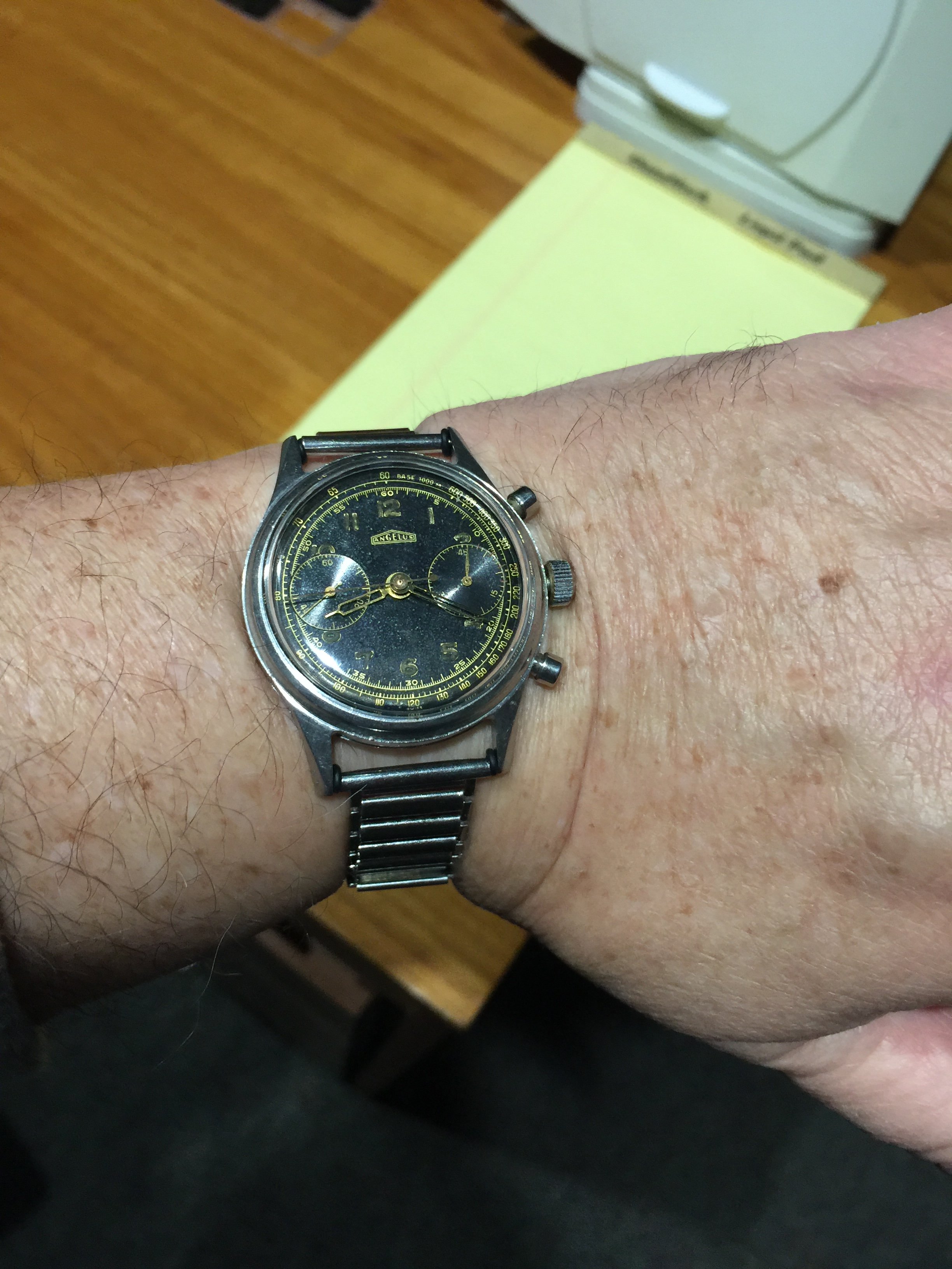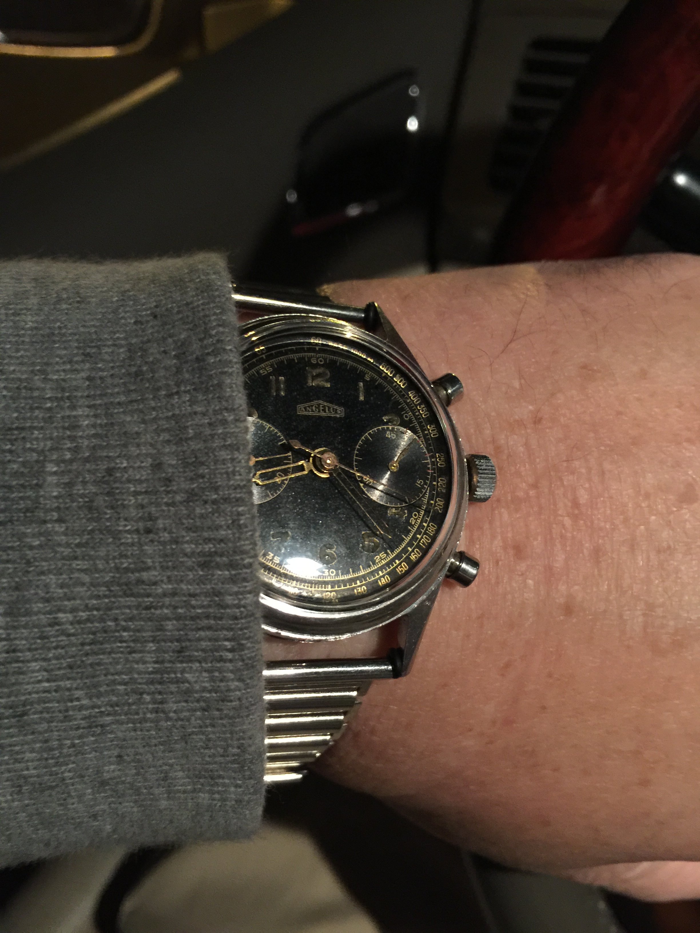 Shiny black dials are hard to photograph! I realized, but didn't do this time, that I need to put a black sack over my head to eliminate the reflection of my white hair and pale forehead...