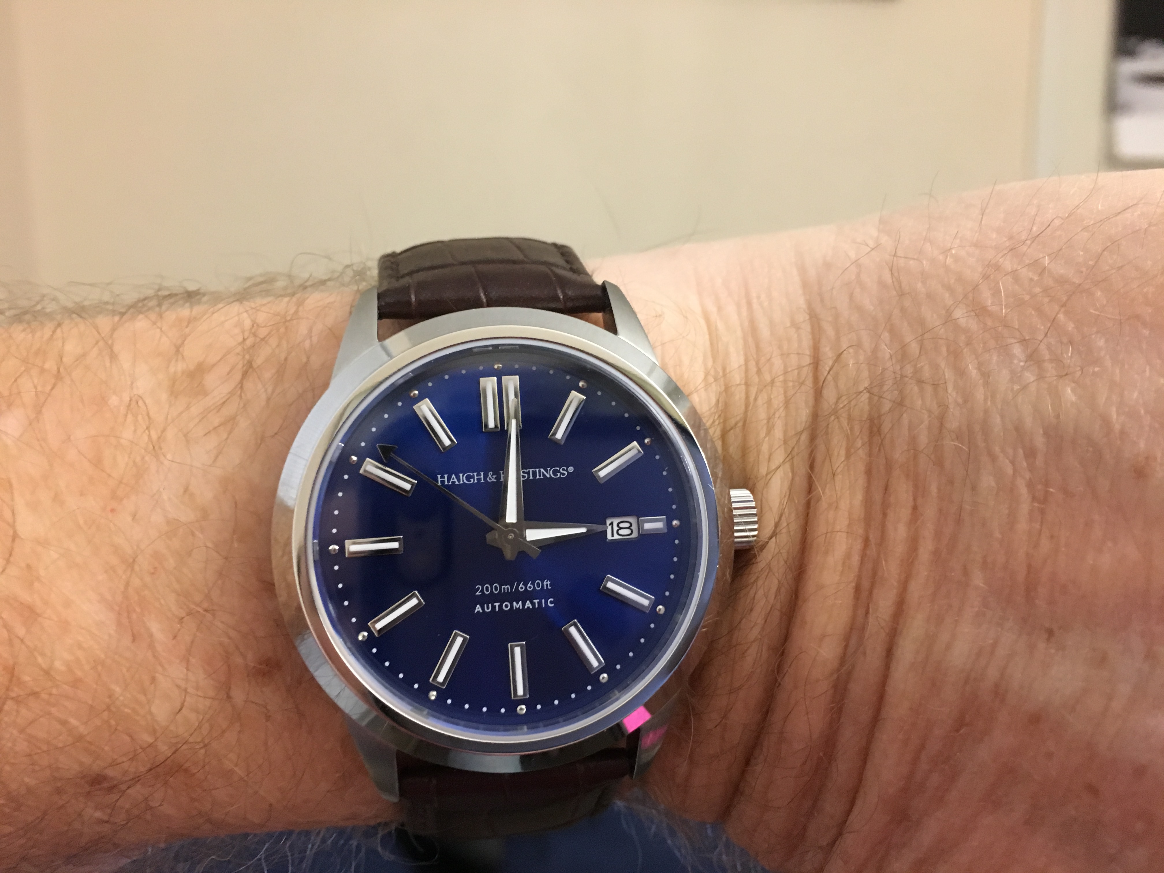 Dressy holiday lunch today, so I broke out my Haigh & Hastings Classic Blue. A nice little number from Down Under; Seiko NH35 automatic movement, Aussie design (in collaboration with Emmanuel Gueit).