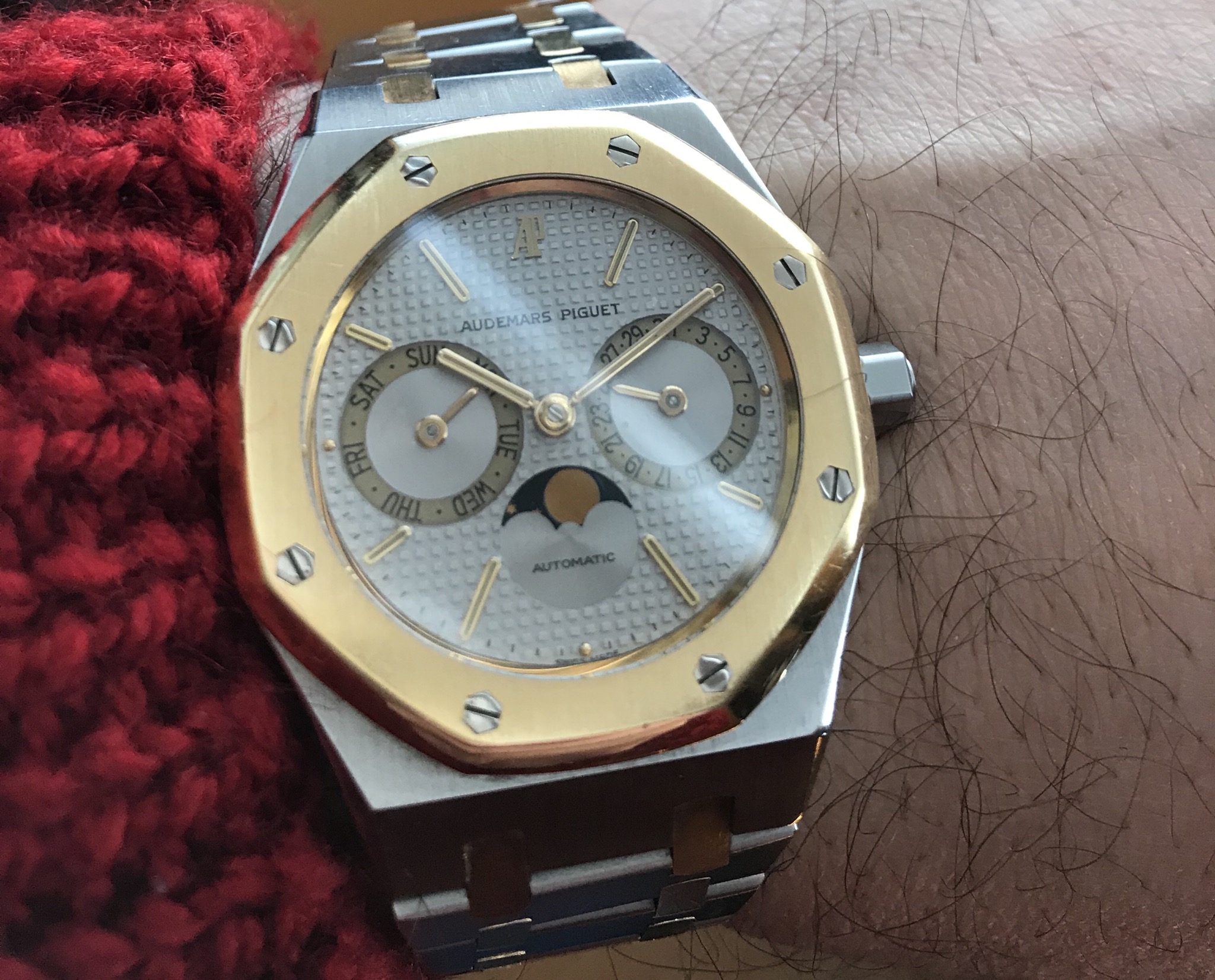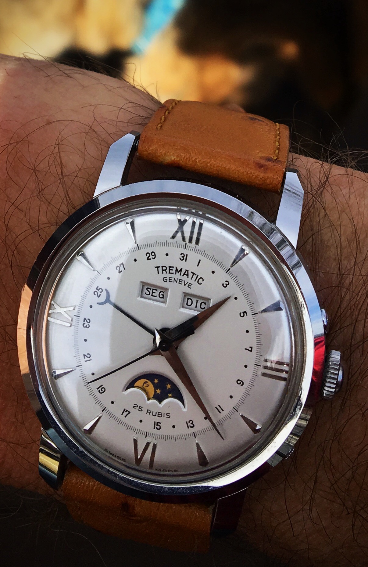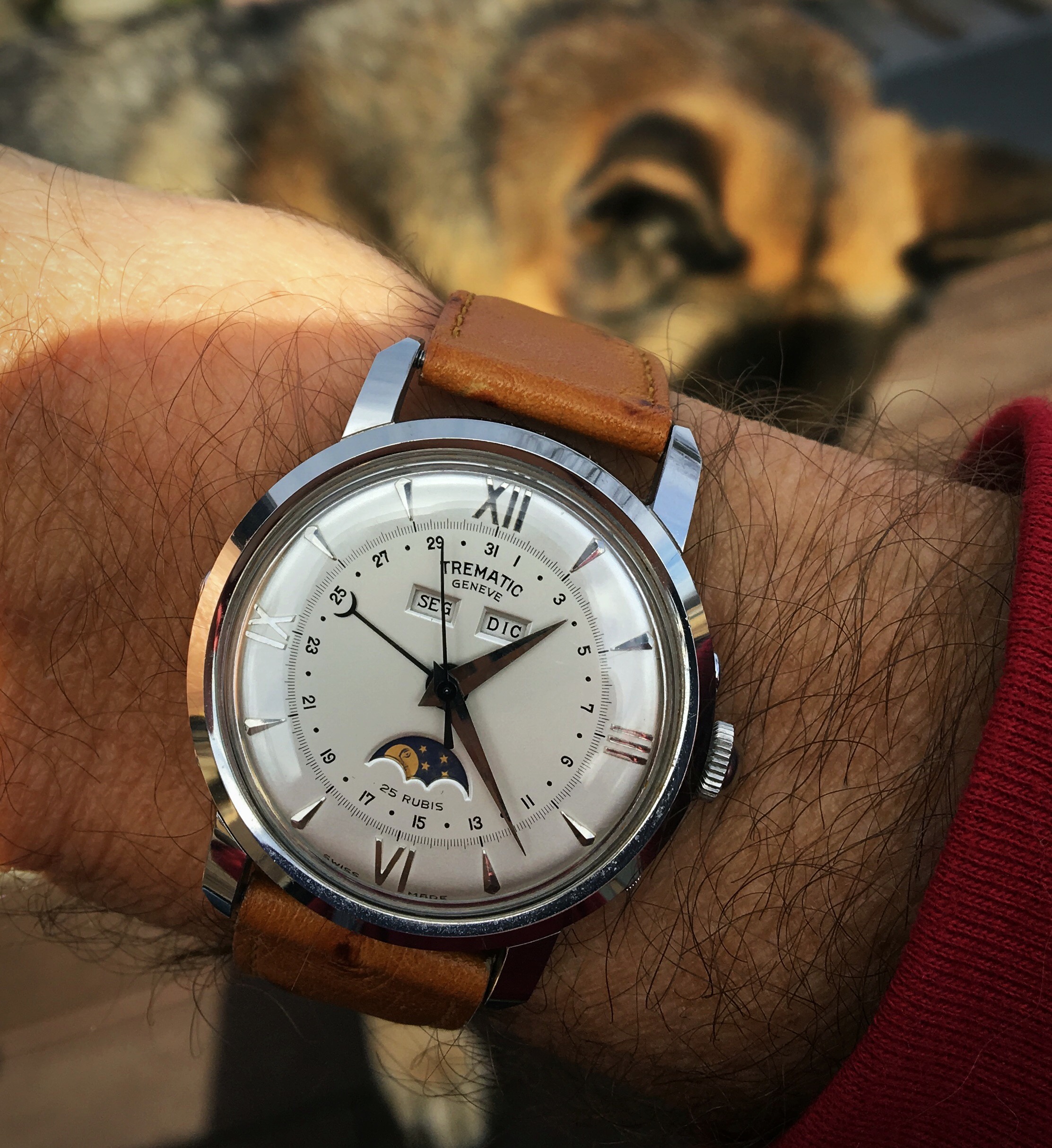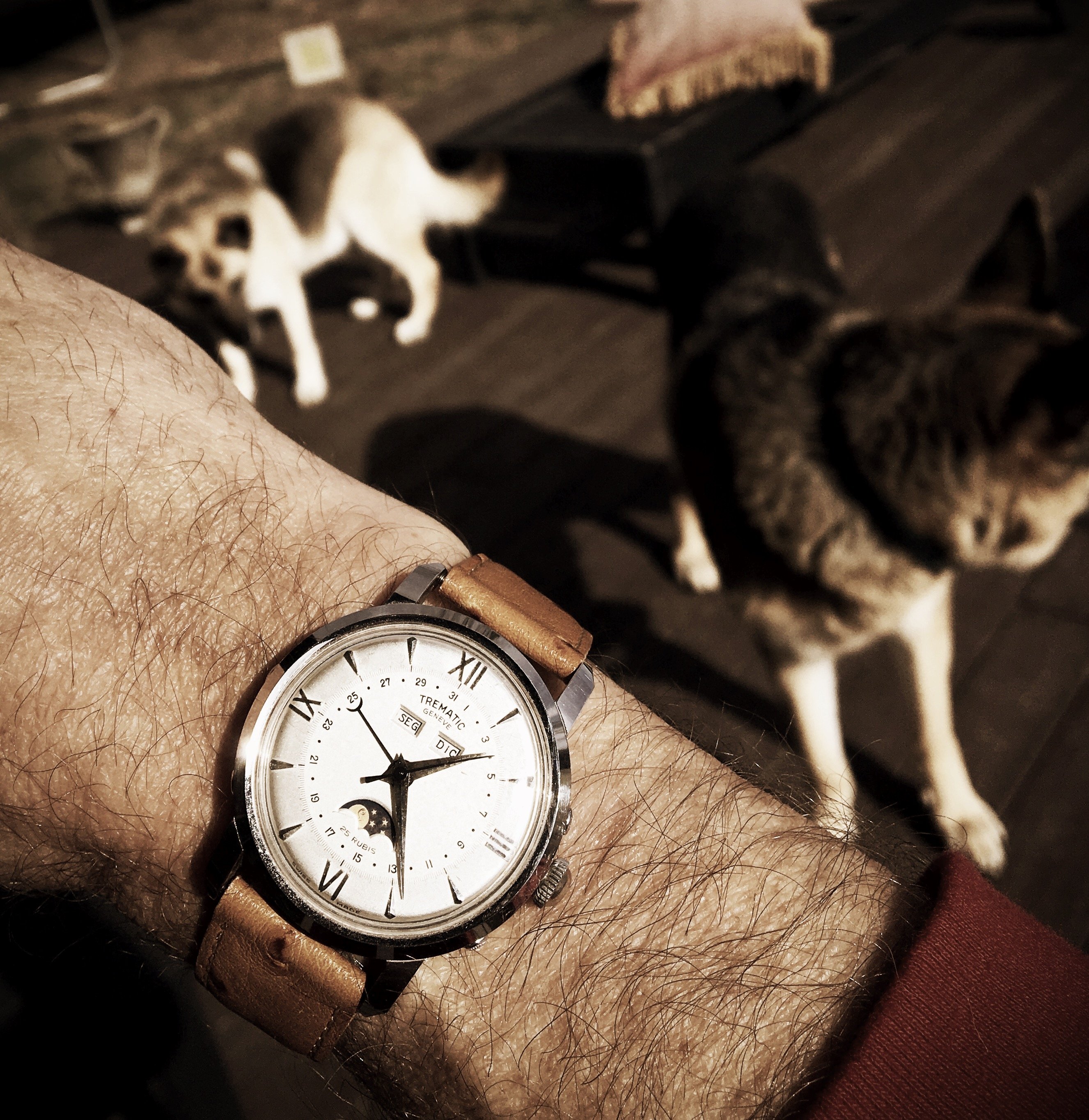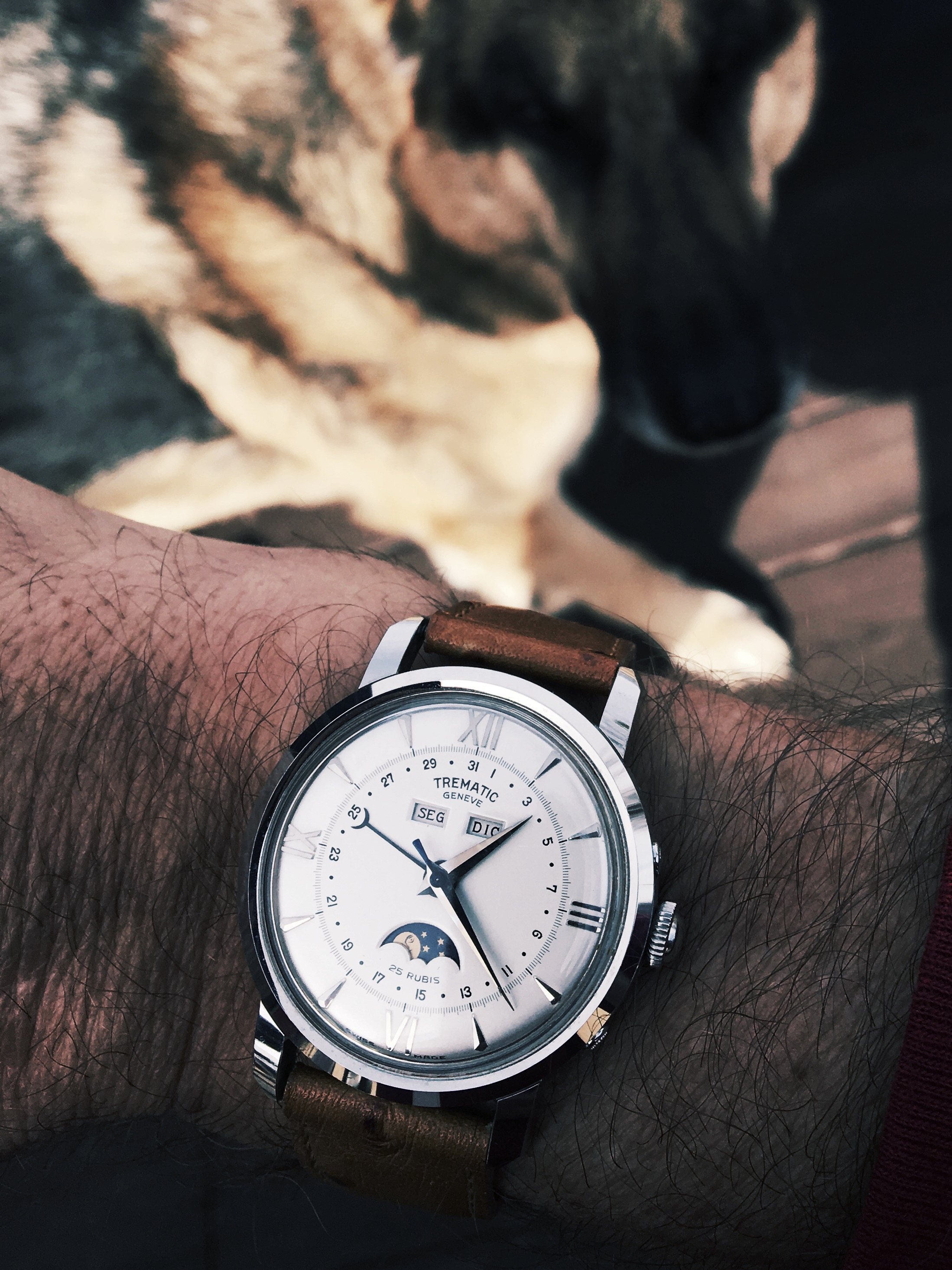 From the days when I mostly wore flat sapphire crystal watches, these pups (my sister’s) still like to search for sun reflections to chase around the deck.. or do they love my vintage watches just as much? 😉😁 #TrematicMoonphaselove