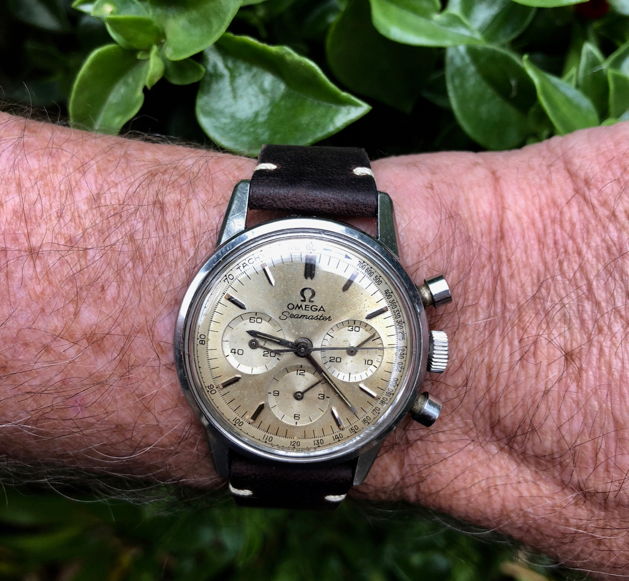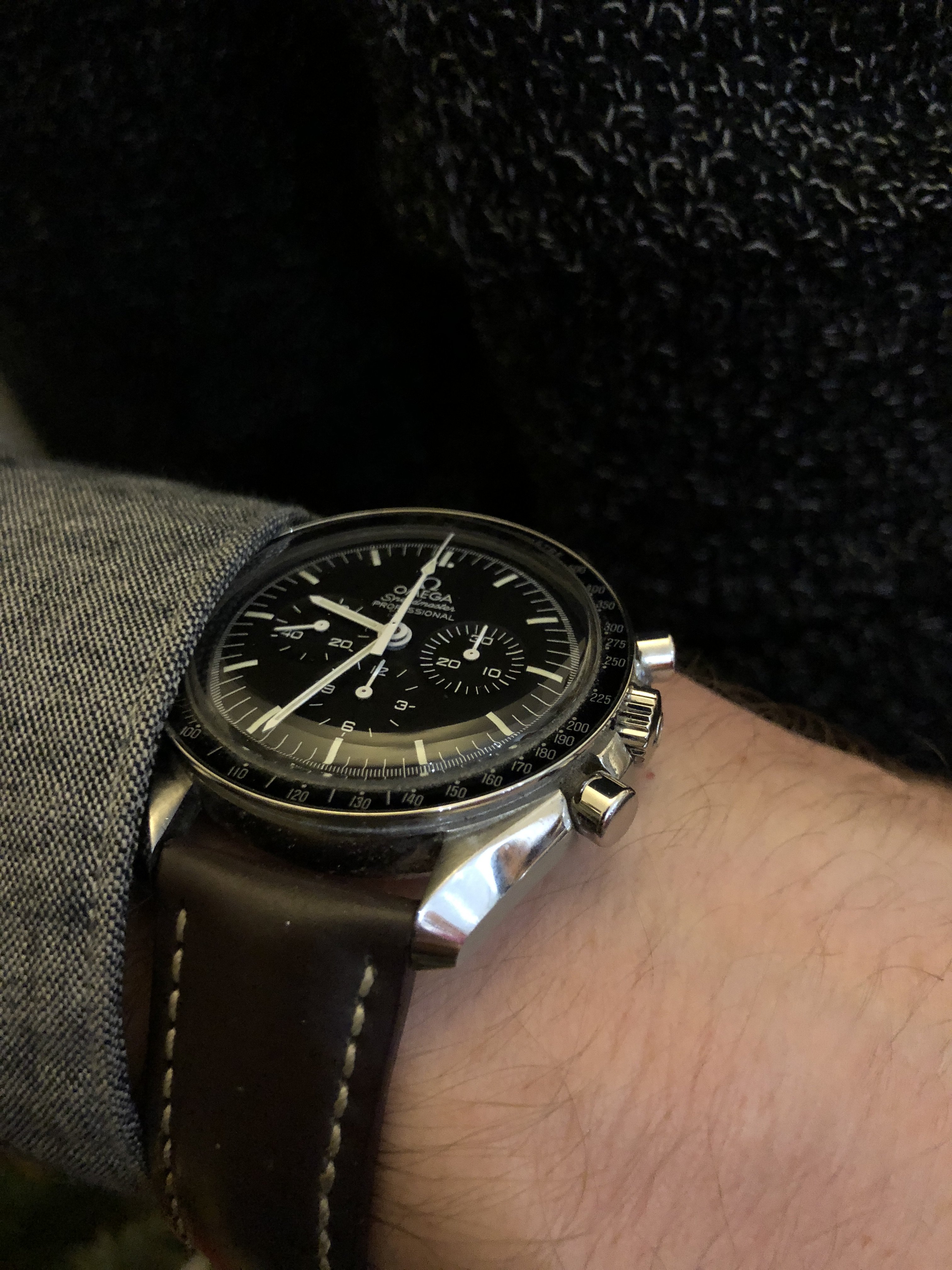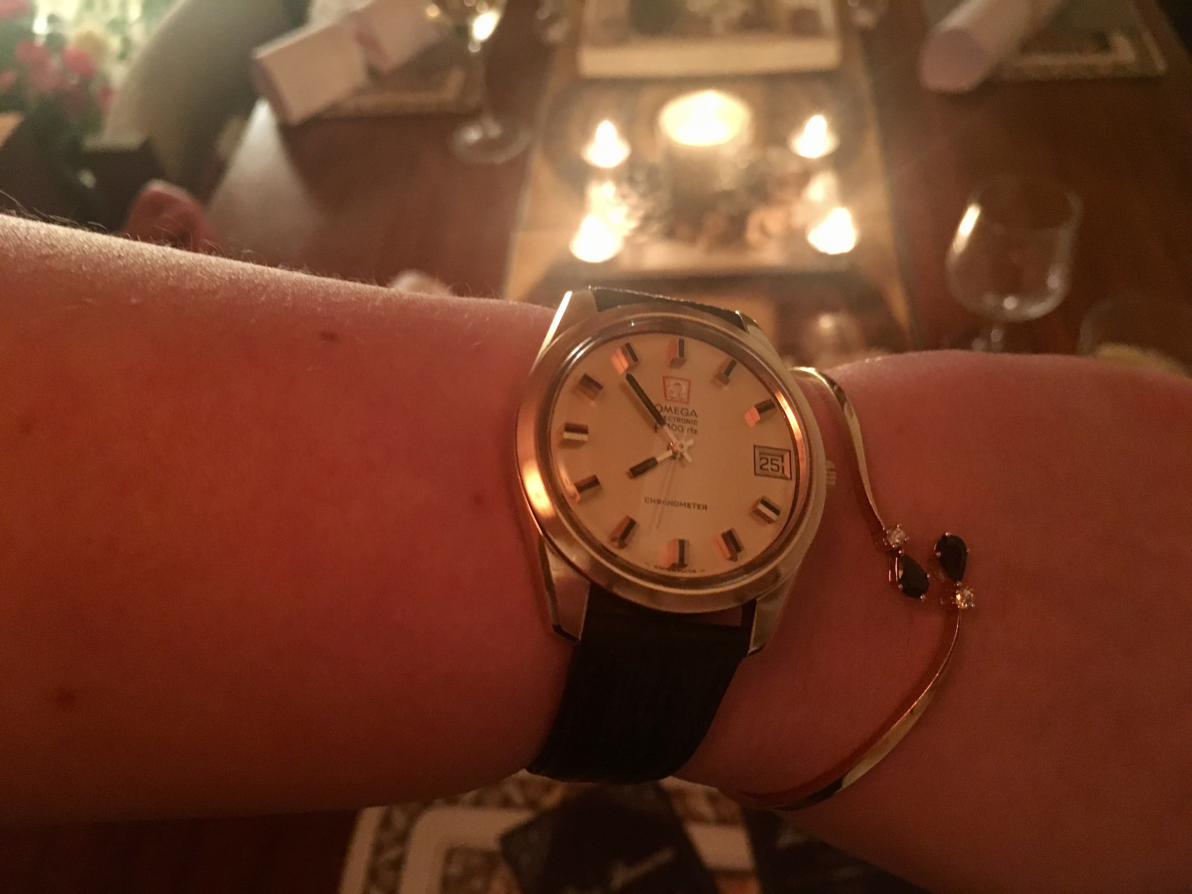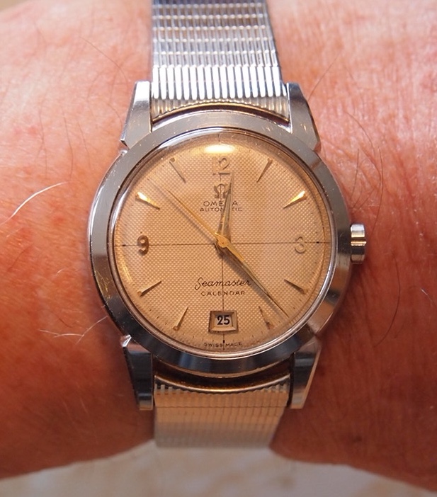 Christmas Day. Still on my wrist as I had it planned on December 23. Many feet of snow outside, so to an indoor shot. My 65 (approx.) year old Omega Seamaster caliber 355, date at 6:00. Case, crystal, crown, all NOS Omega. Dial is pristine original. Hadn’t seen the light of day for over 40 years, when I happened upon it in a box of 50s vintage Omega parts watches. Happy days.