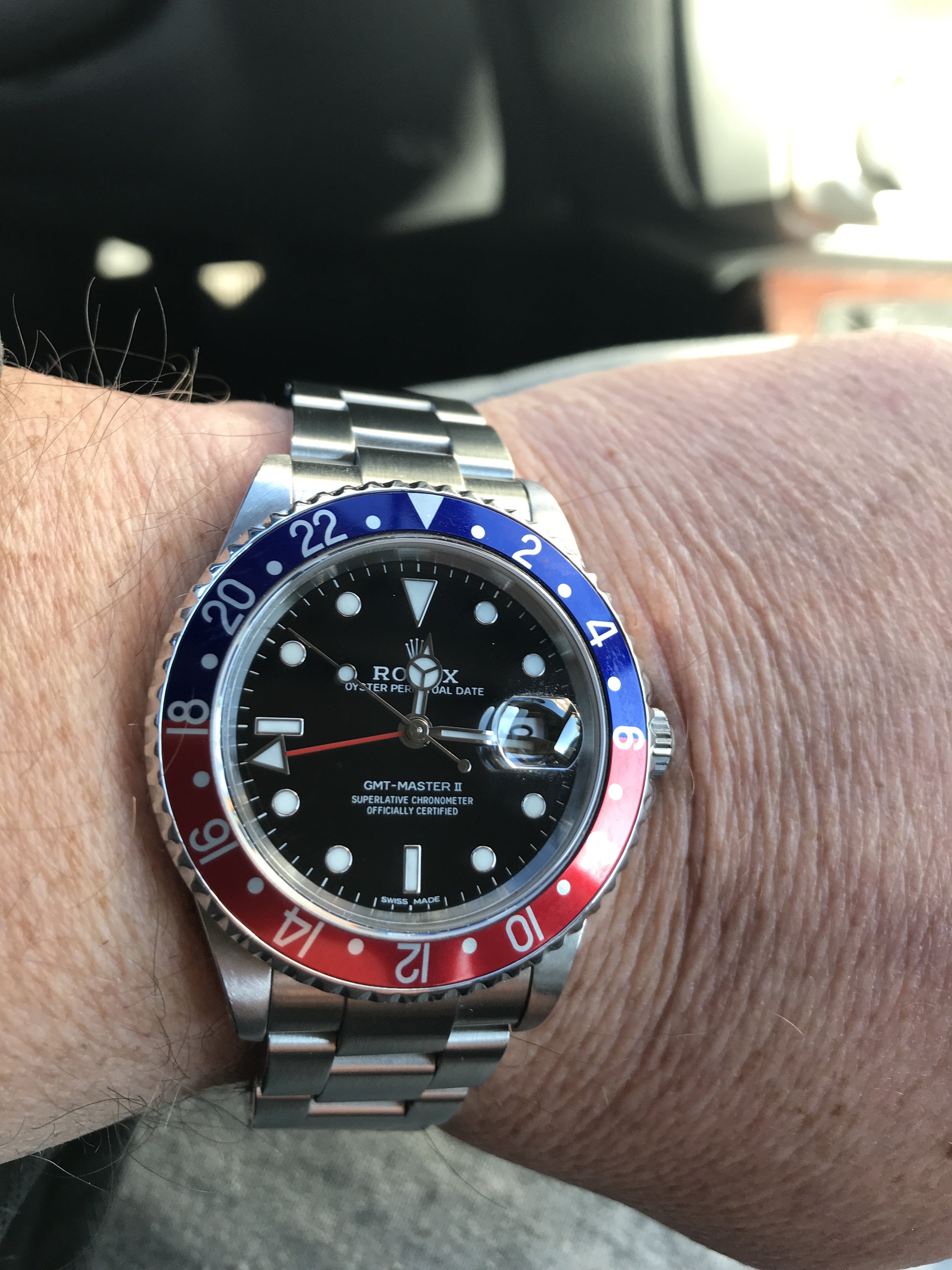 16710 GMT Master II BLRO. I normally wear it with half a pinkie finger of slack in the bracelet. But today, with the frigid temperatures in NJ, it鈥檚 a full pinkie + worth of slack.