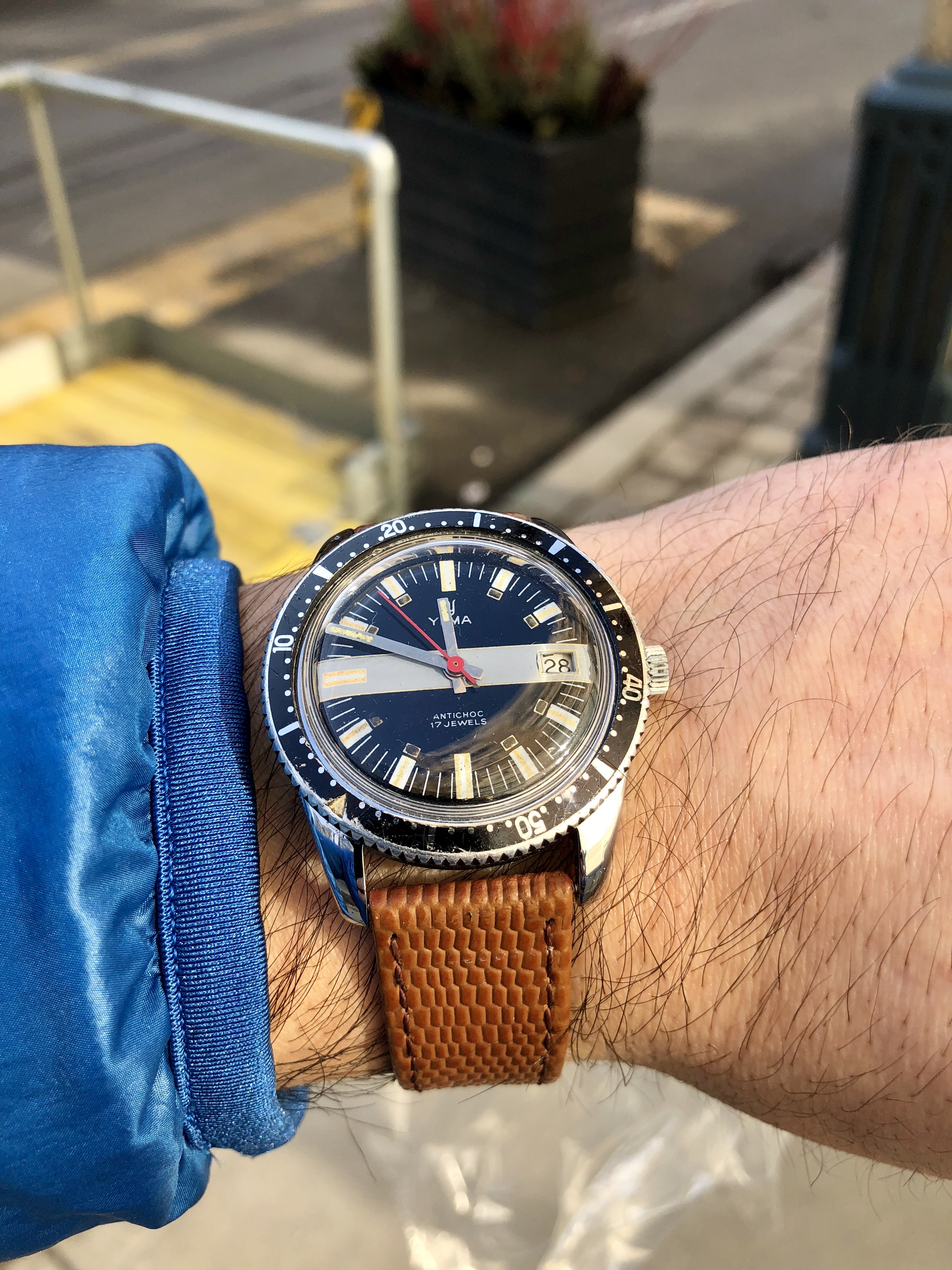 Posts 886 Likes 2,975 sjg22 ·Jan 28, 2018 Bought this a month ago for very, very little on a whim and I quite like it. Yema Sous-Marine - I’m sure it’s not fully original but the funky dial makes it an awesome, cheap and cheerful weekend watch.