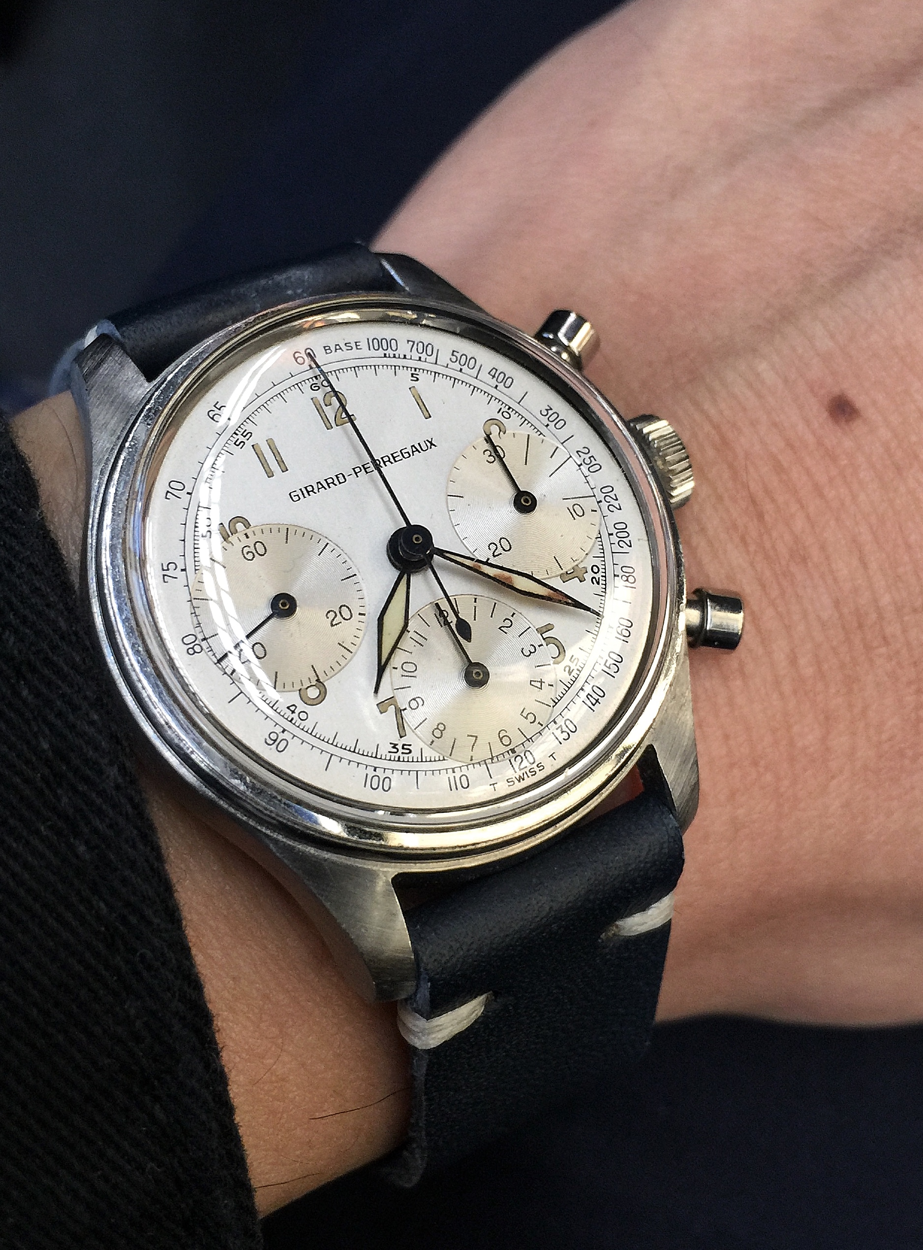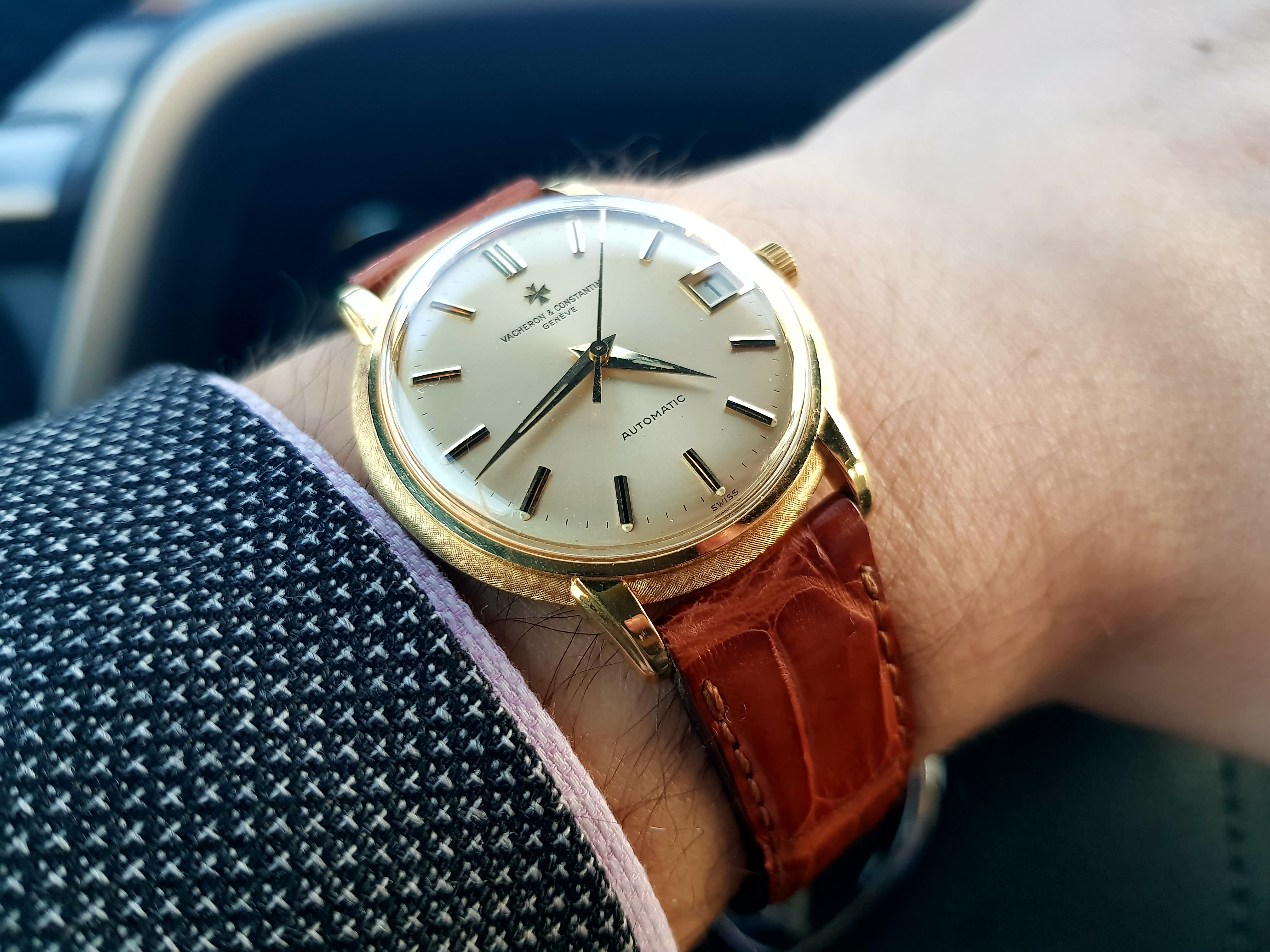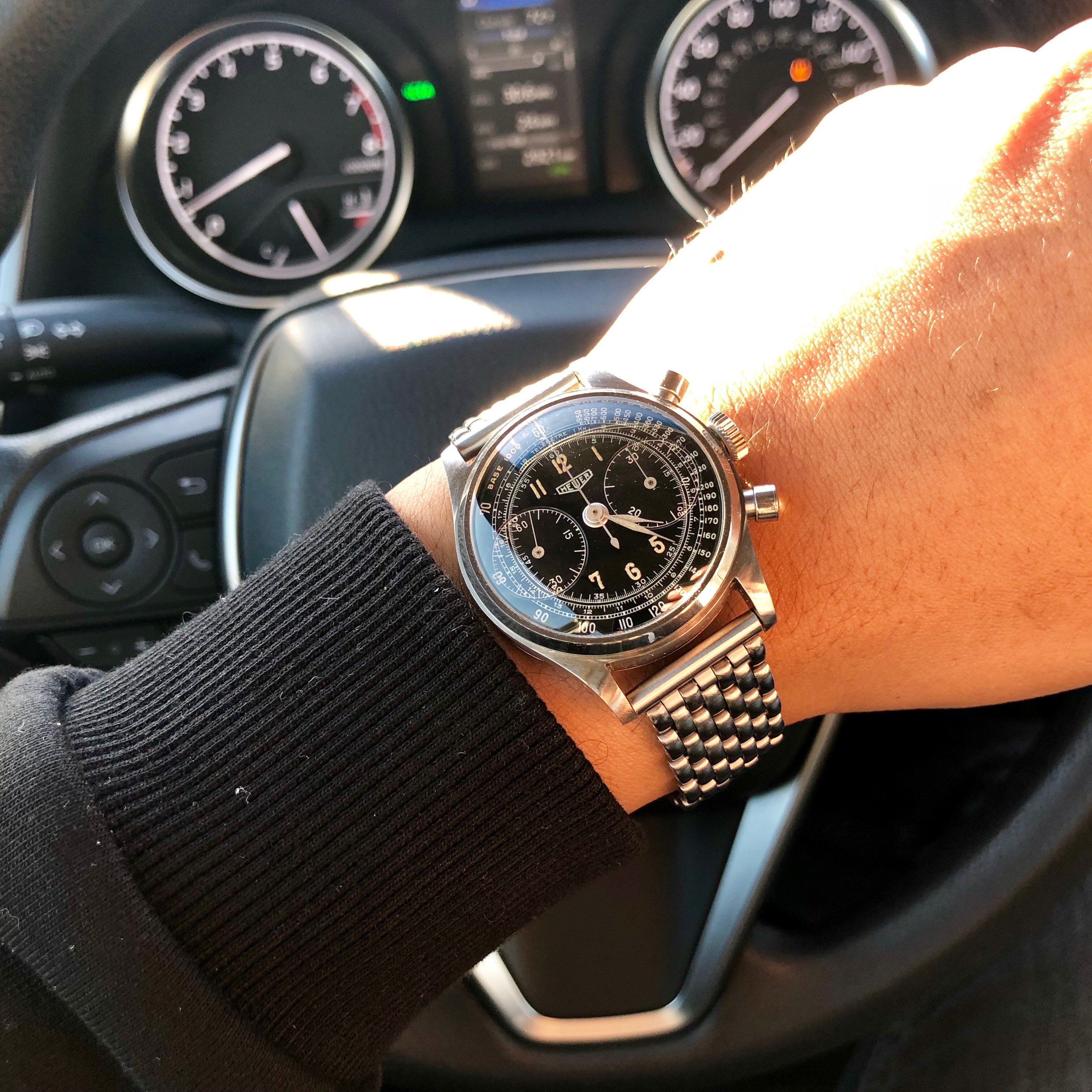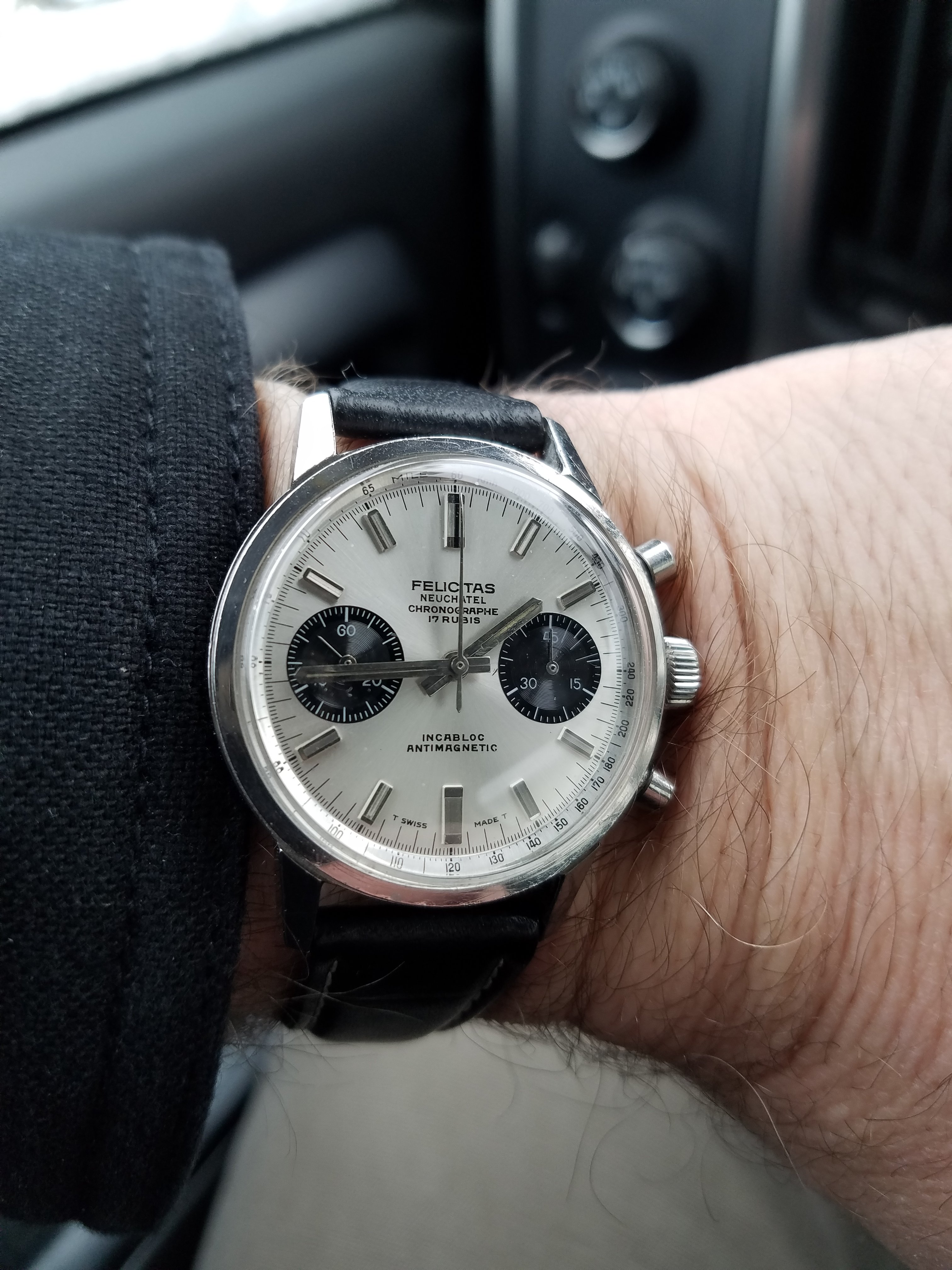 In the cue, waiting to pick up my daughter from school. This watch has not disappointed. I am still estatic to own and wear it. I can't stop looking at it throughout the day. I never understood the draw of a chrono before. I have never been drawn to the Speedy, but maybe that is about to change. I am sure this will not be my last vintage chrono.