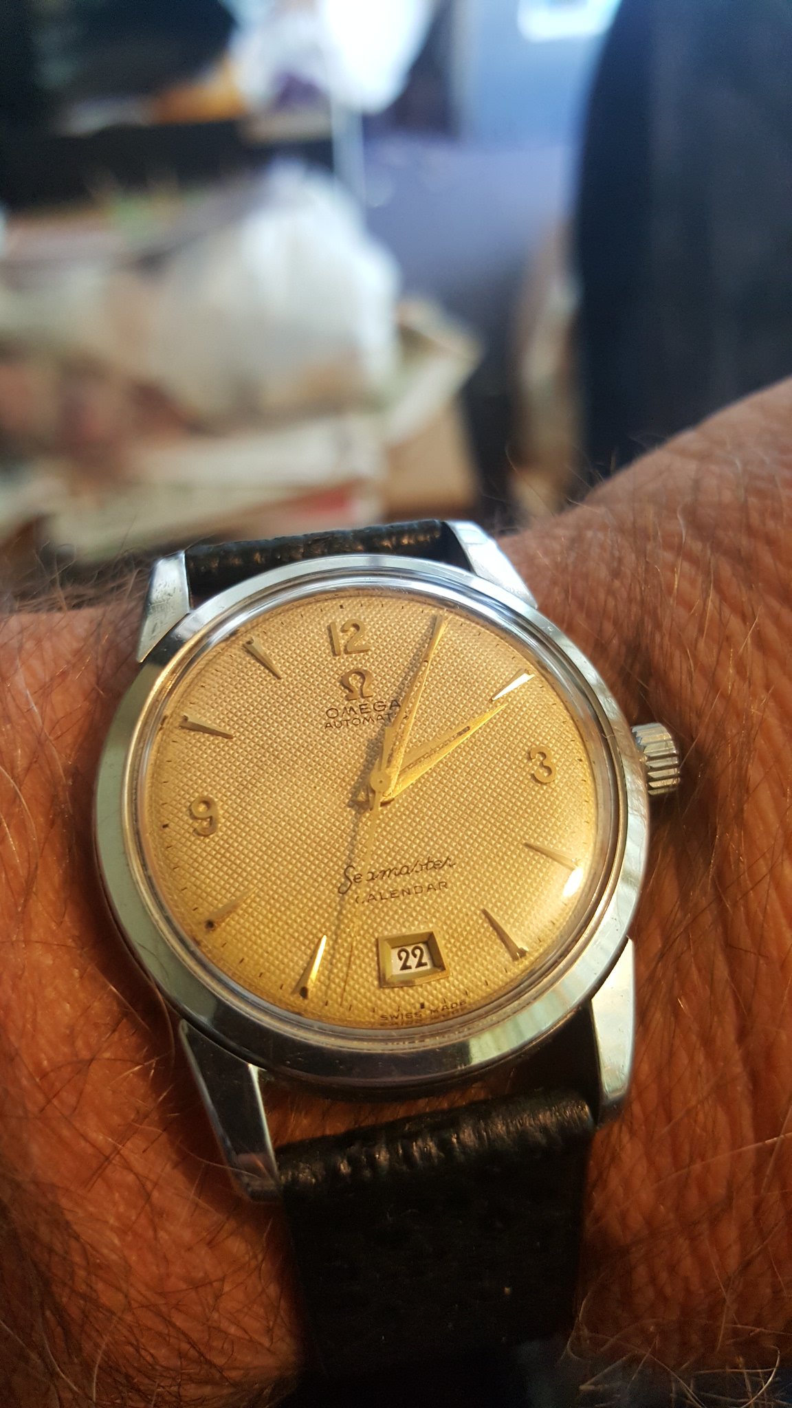 Posts 15,547 Likes 46,187 Canuck ·Feb 4, 2018 Raymondo5508 Vintage Omega calendar @ 6. Sorry wrong date... The crystal appears to be quite yellowed. You might consider changing it. Mine says HI.