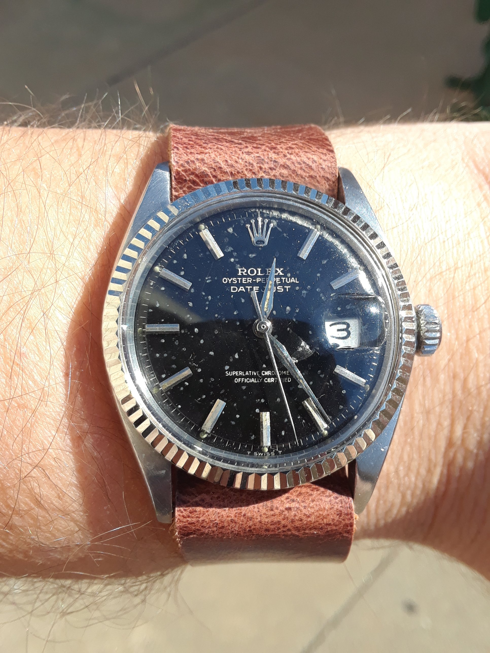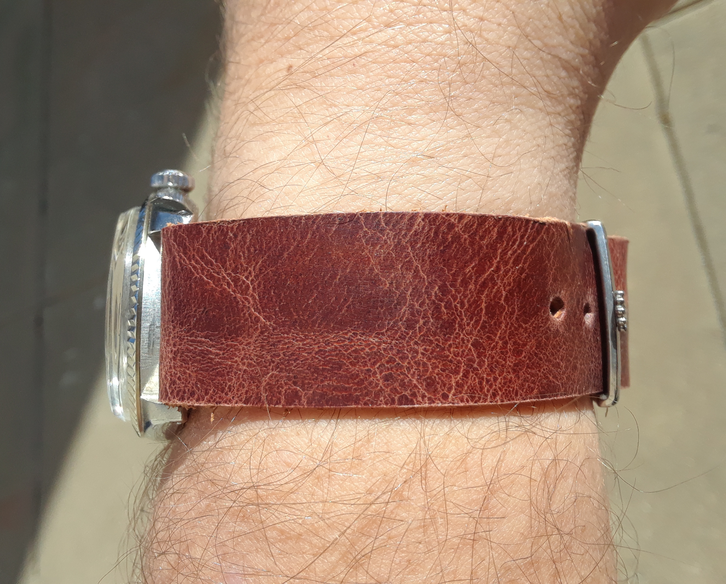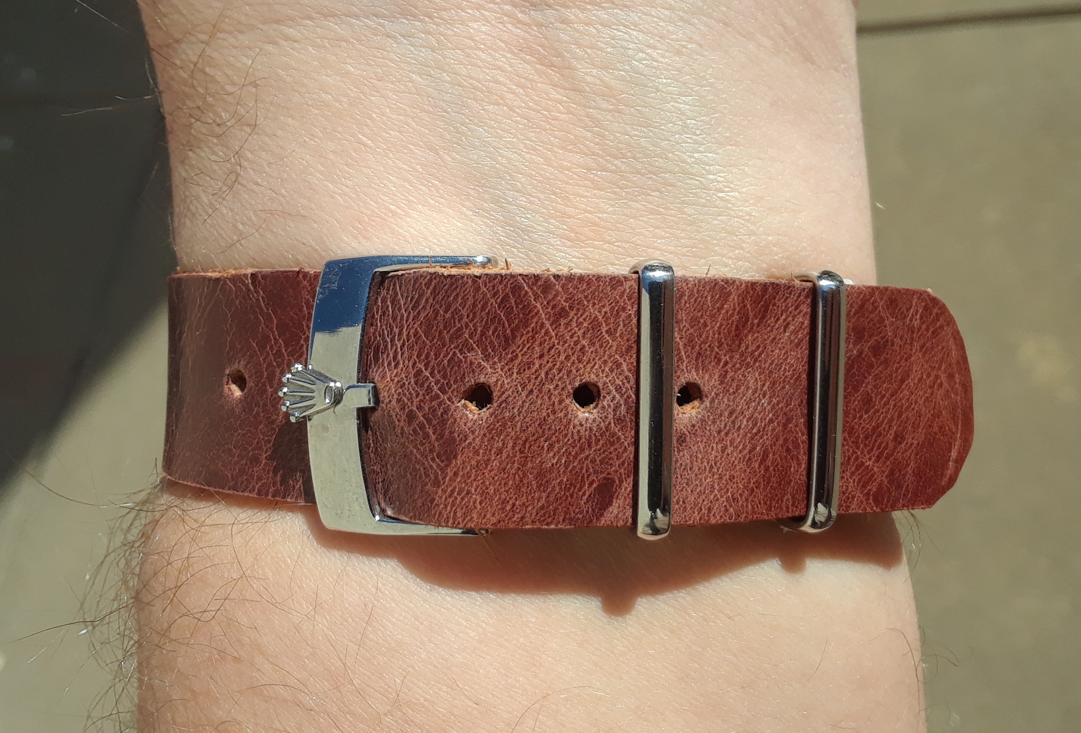 My good old 1601 DJ on my very own, handmade OMGRLX distresed red Horween Chromexcel one piece NATO with amber line stitching, polished hardware and a Rolex buckle.