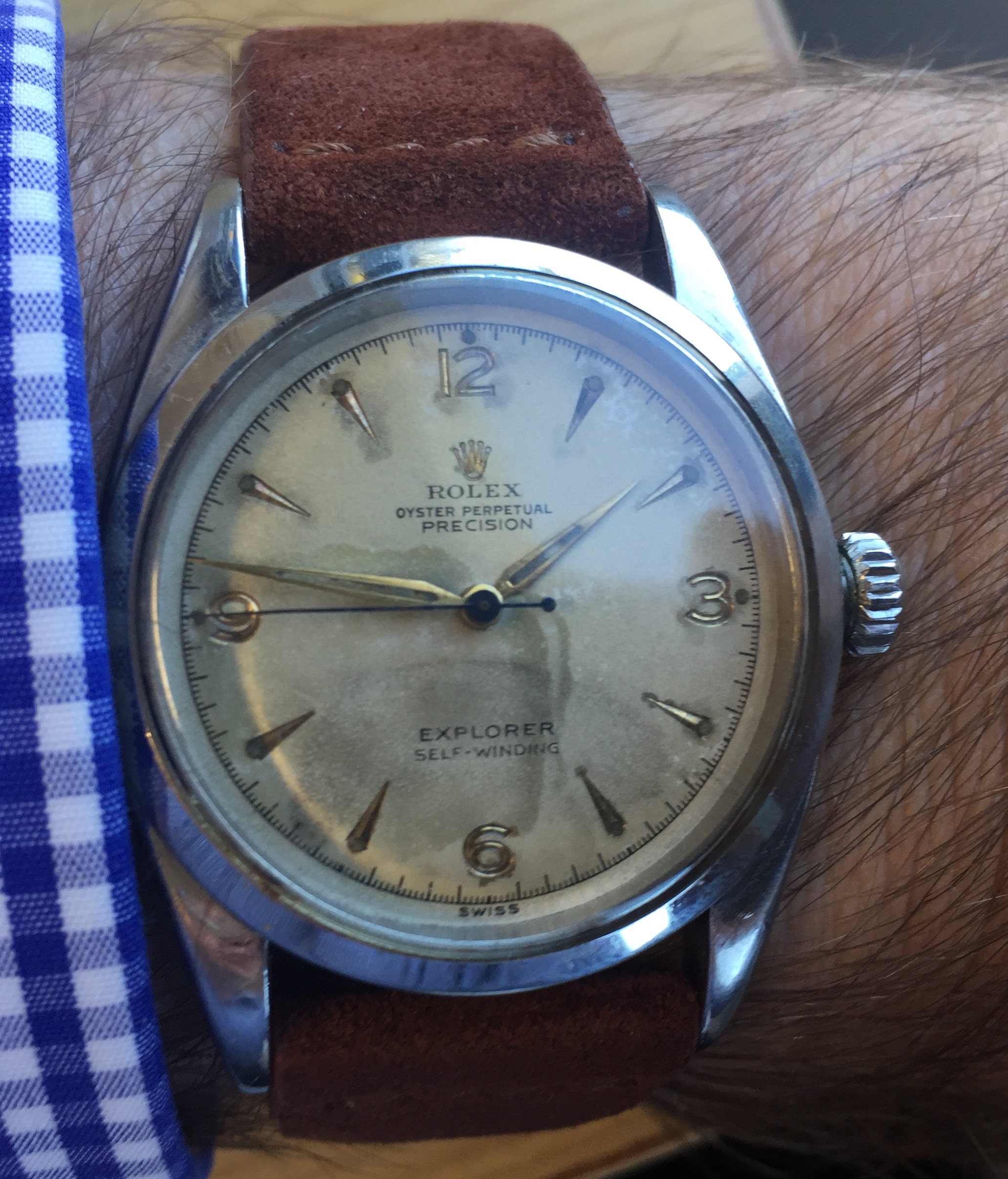 Very early Rolex Explorer 6298, caseback marked III '53, 6098 (which was the earlier version with an integral bezel) crossed out and 6298 etched in. 928xxx serial. Recessed crown, numerals and hour markers. Keeps great time.