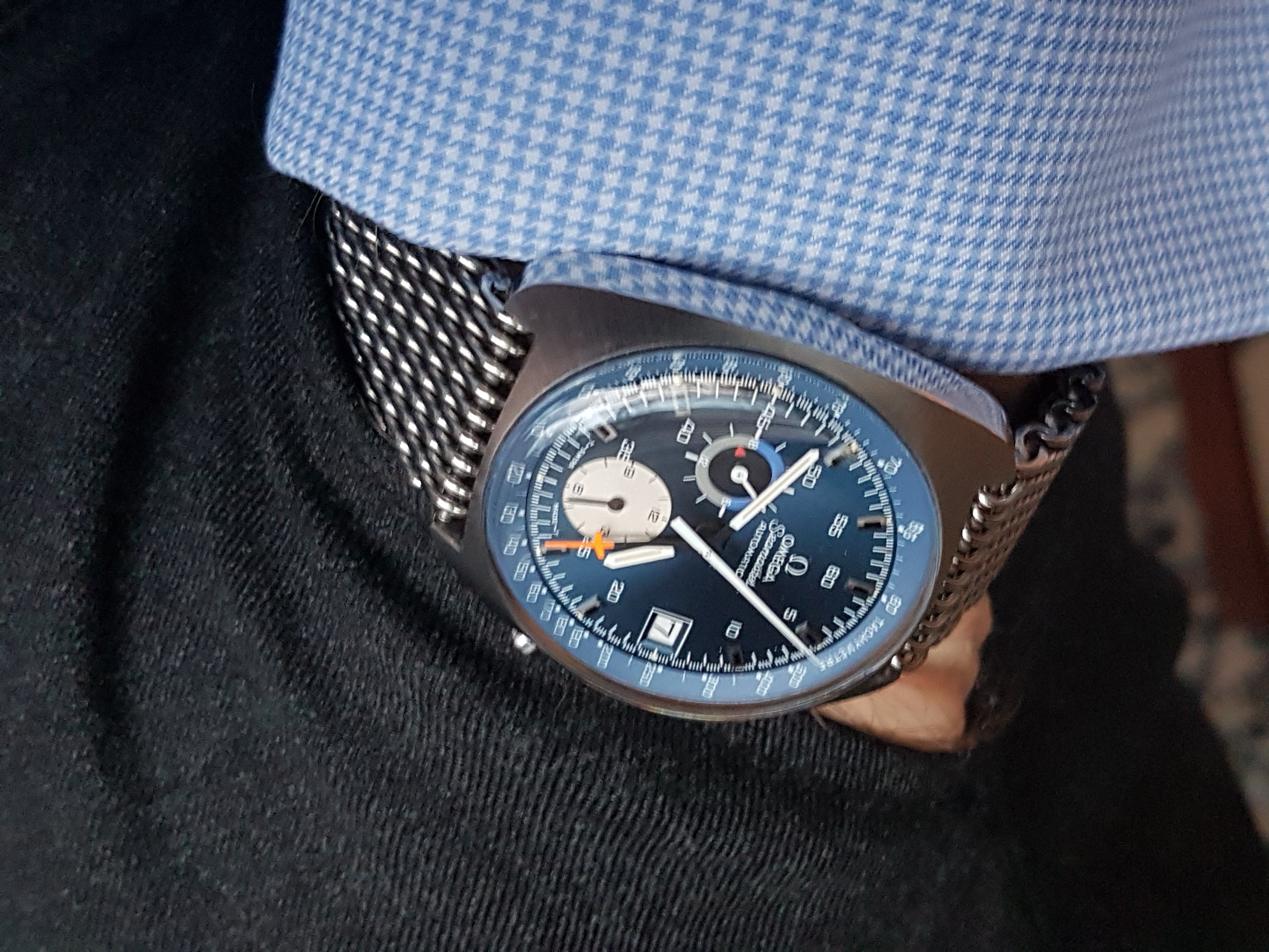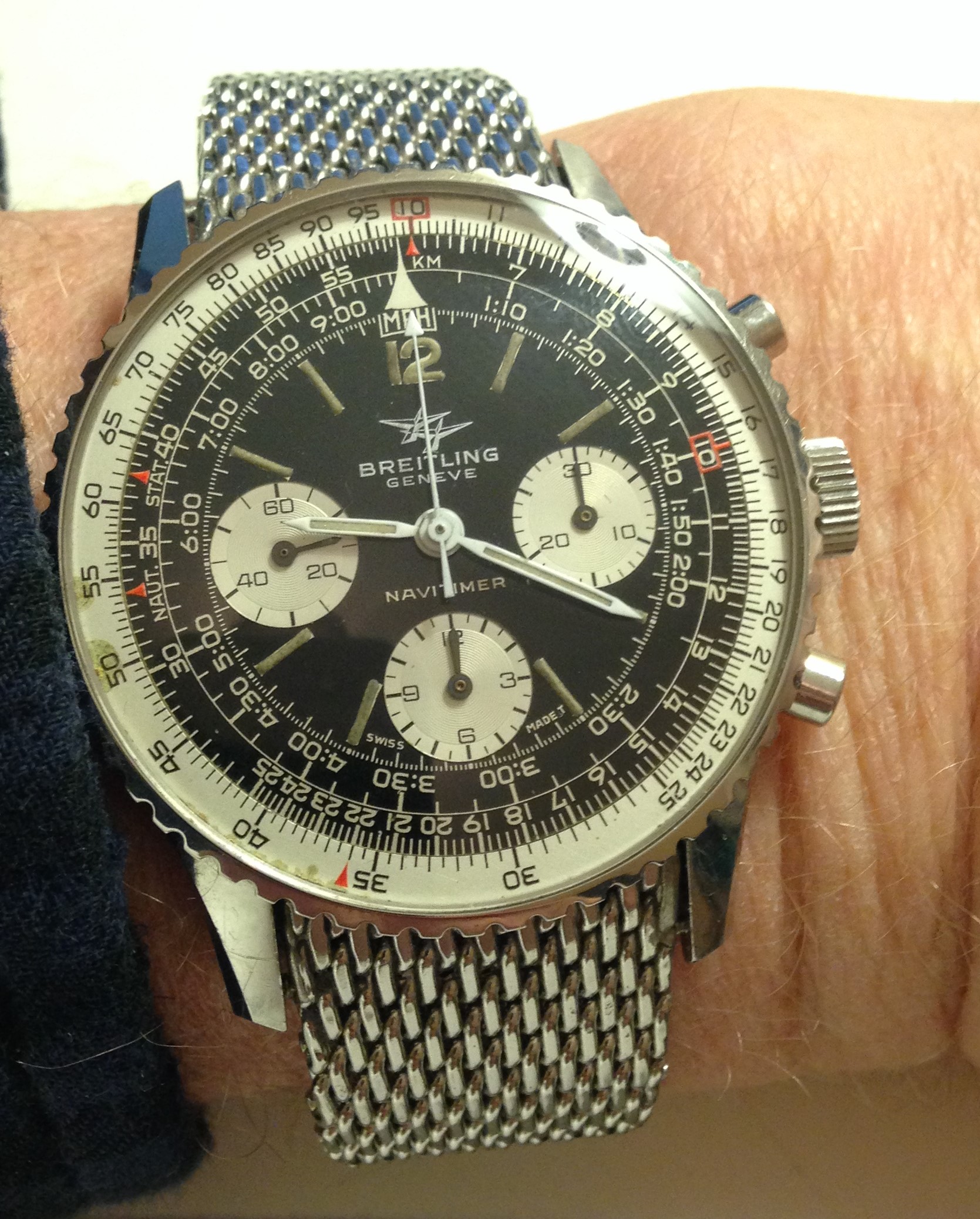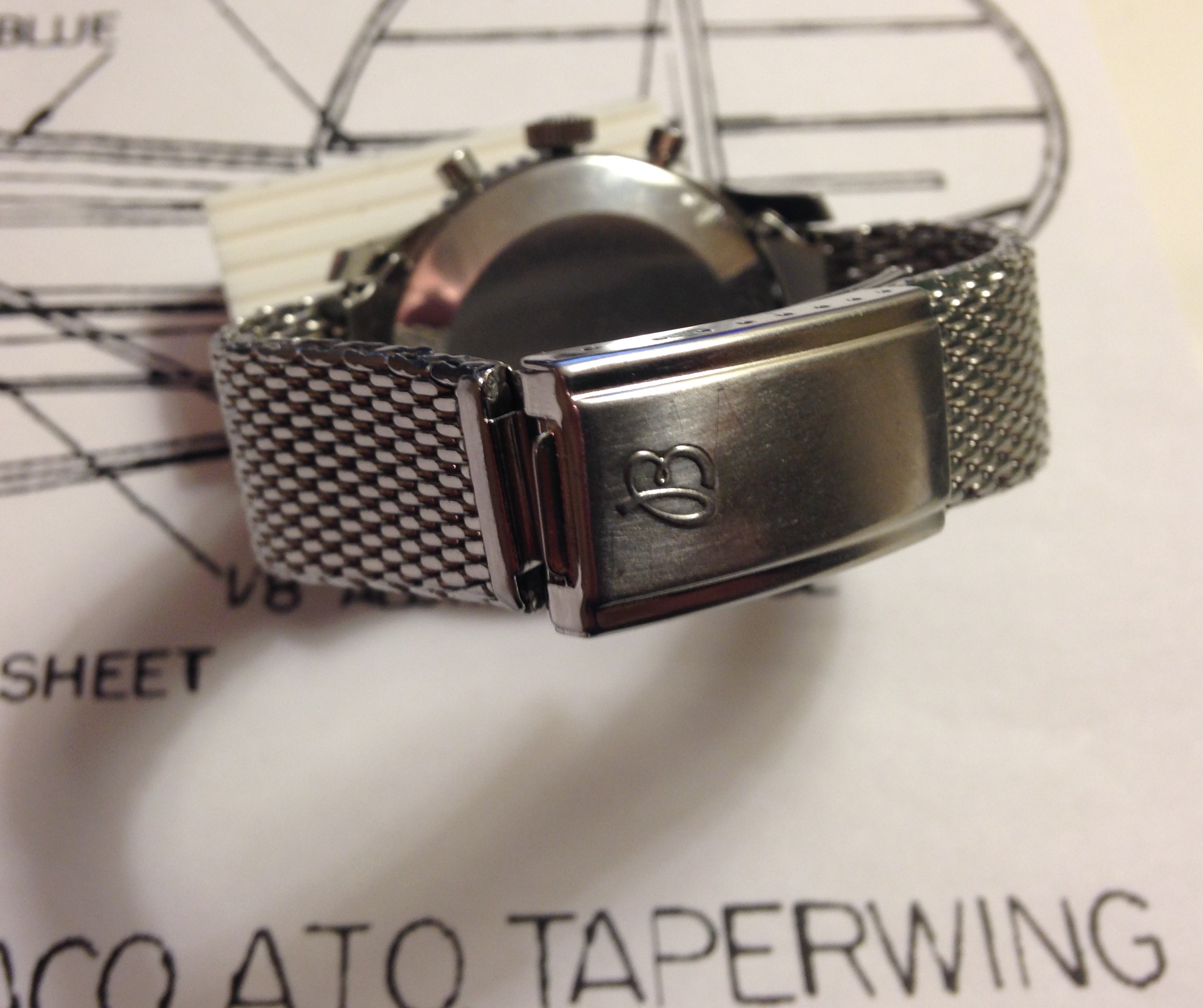 I stopped by my local watch repair guy to pick up three watches fresh from his service work this afternoon. This one went on the wrist first. Twin Jets from 1969 on a Breitling mesh bracelet. As a kid I hug out around airports quite a bit. This one one Chrono I saw rather frequently then, and they still float my boat now.