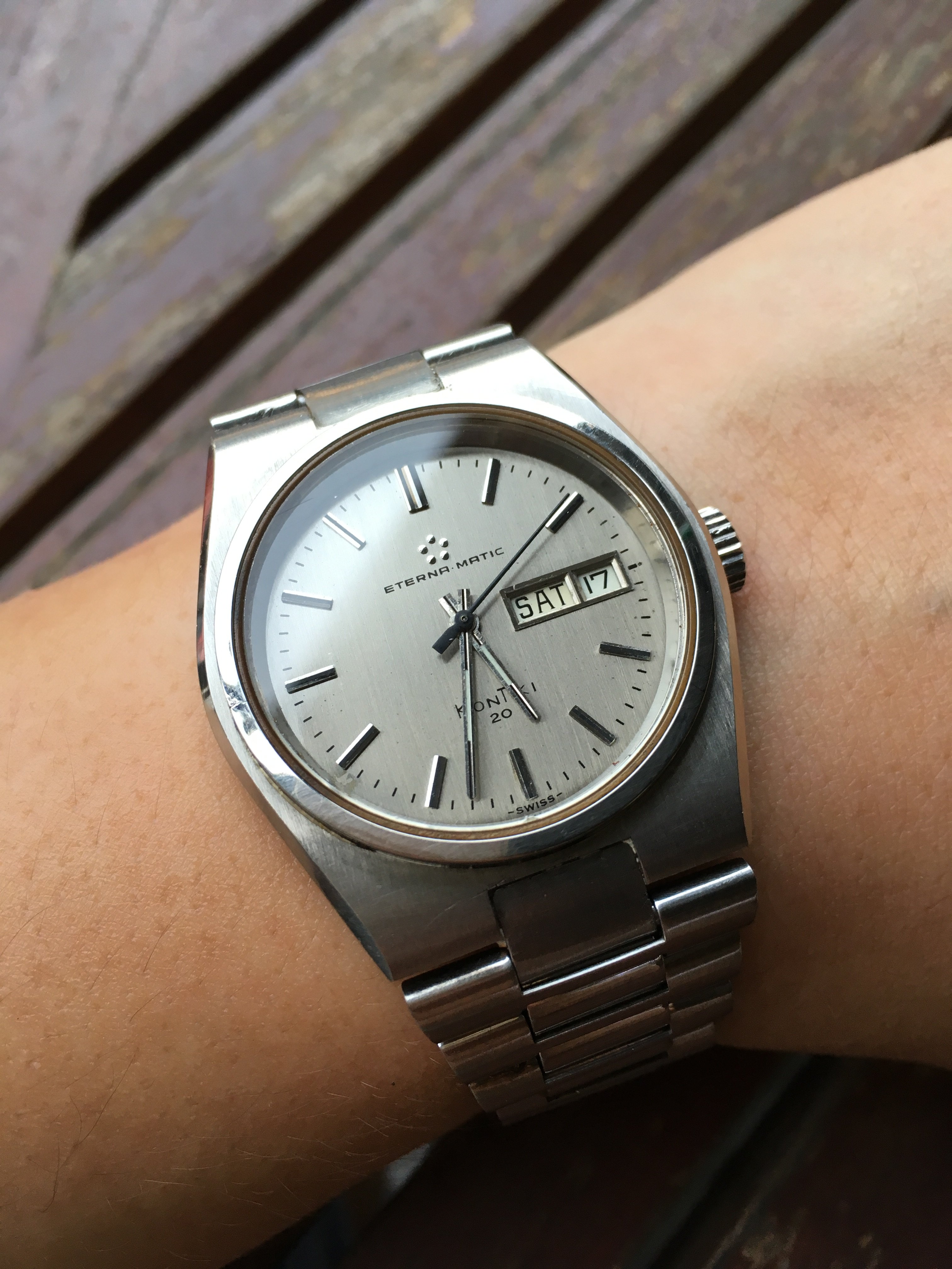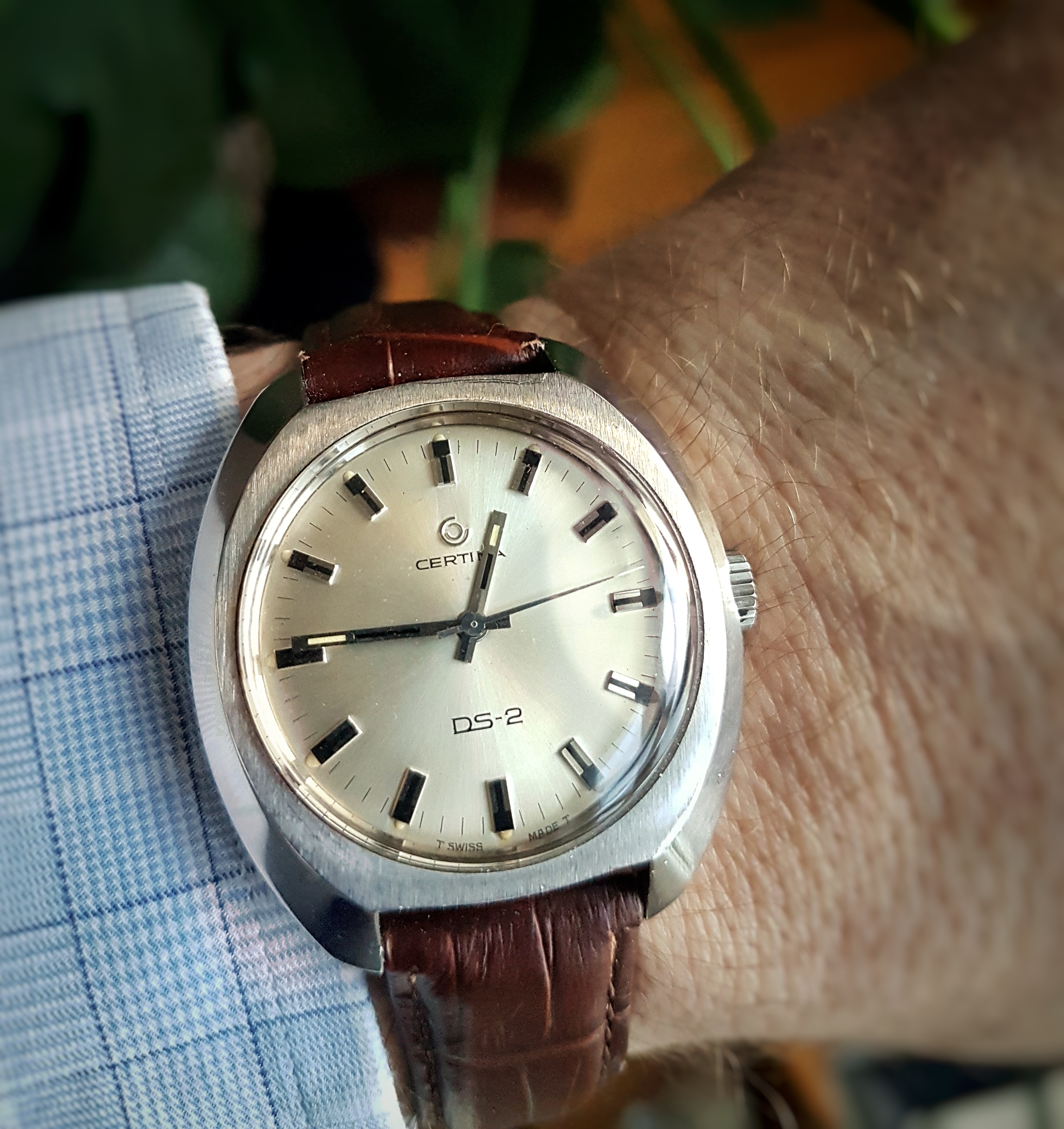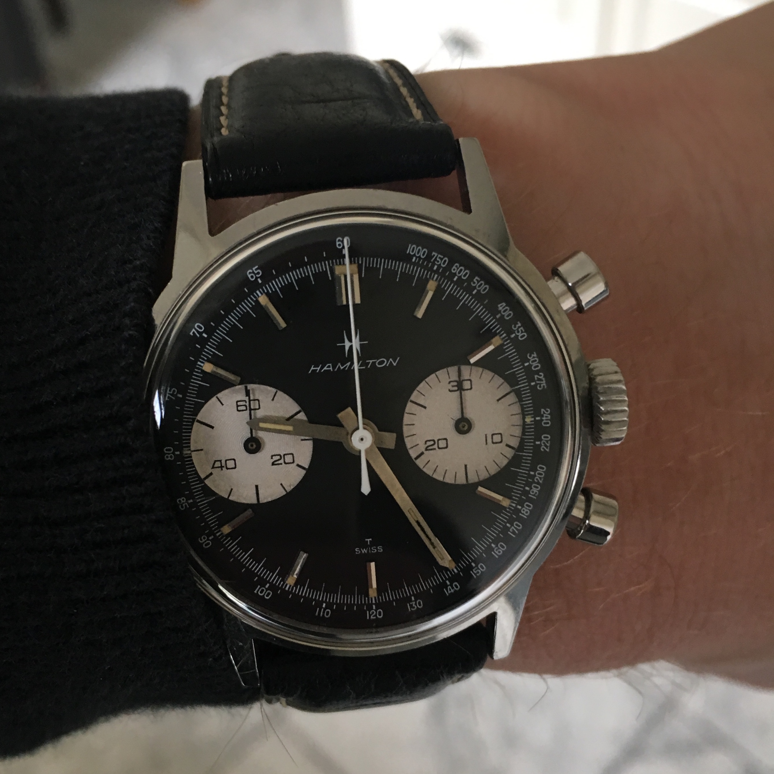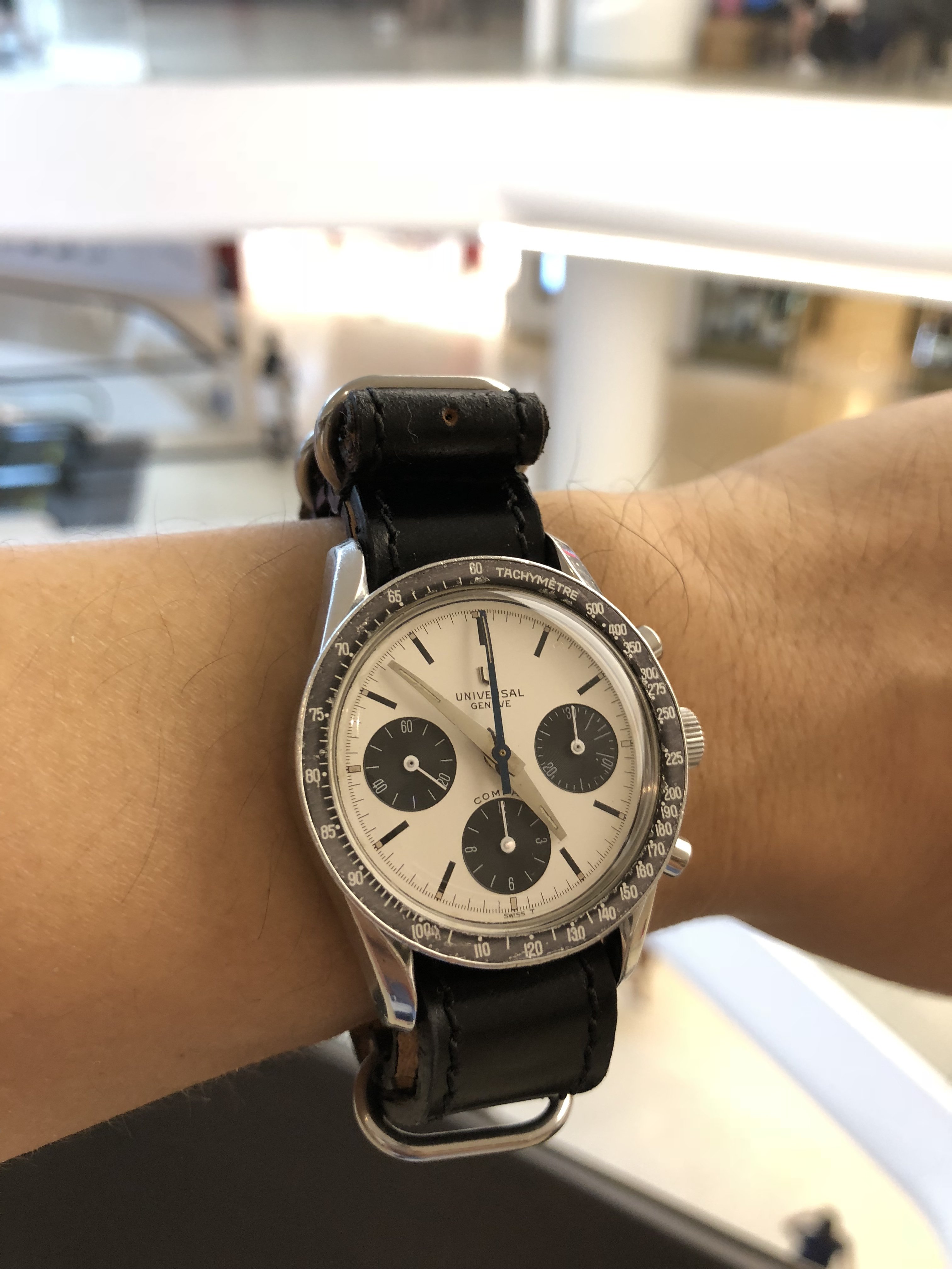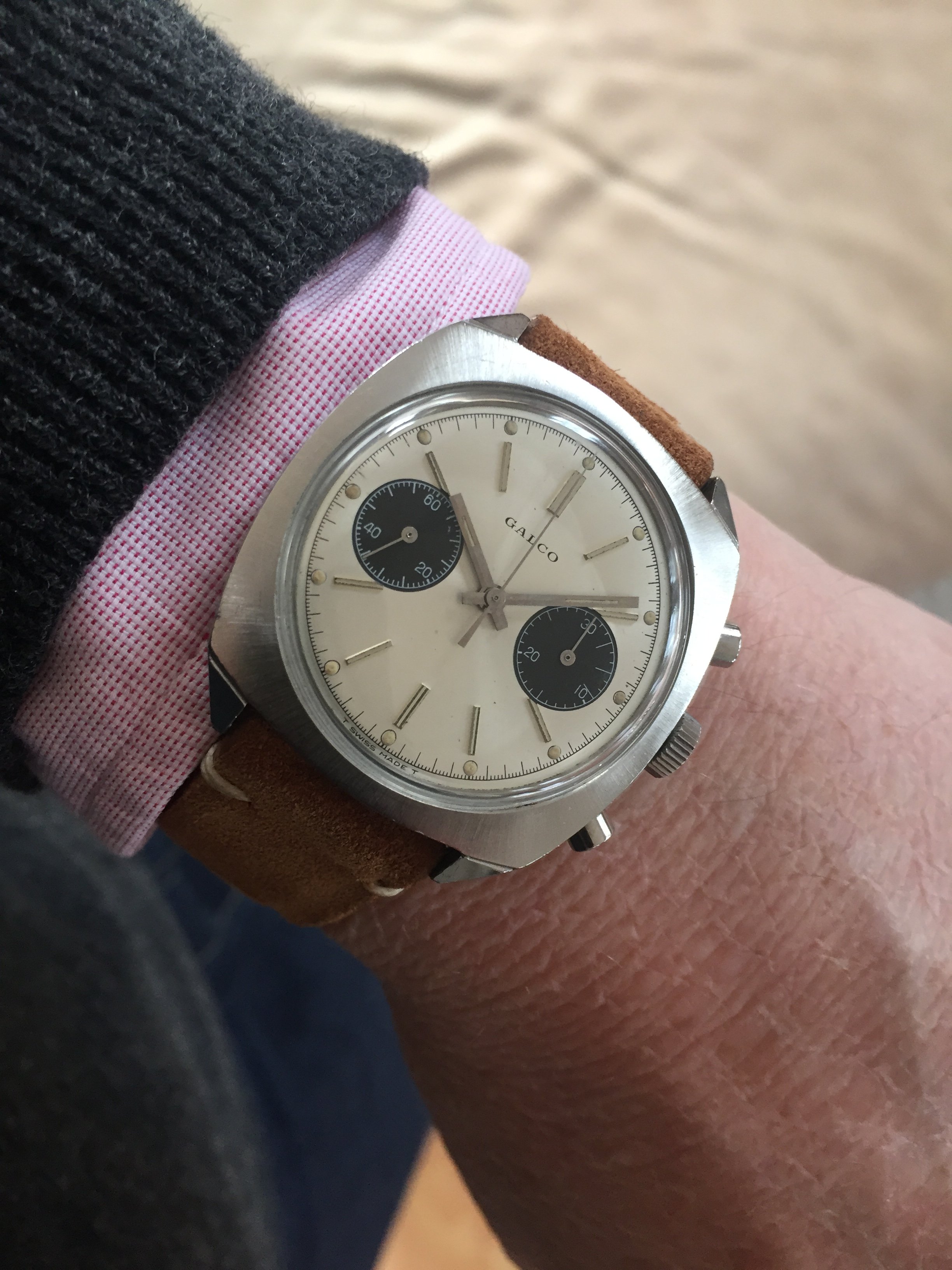 After changing to JPM strap I choose for today my Galco Panda, looking like a Heuer Camaro ...., Galco is an old Gallet brand and the watch is signed Gallet inside, have a wonderful weekend.