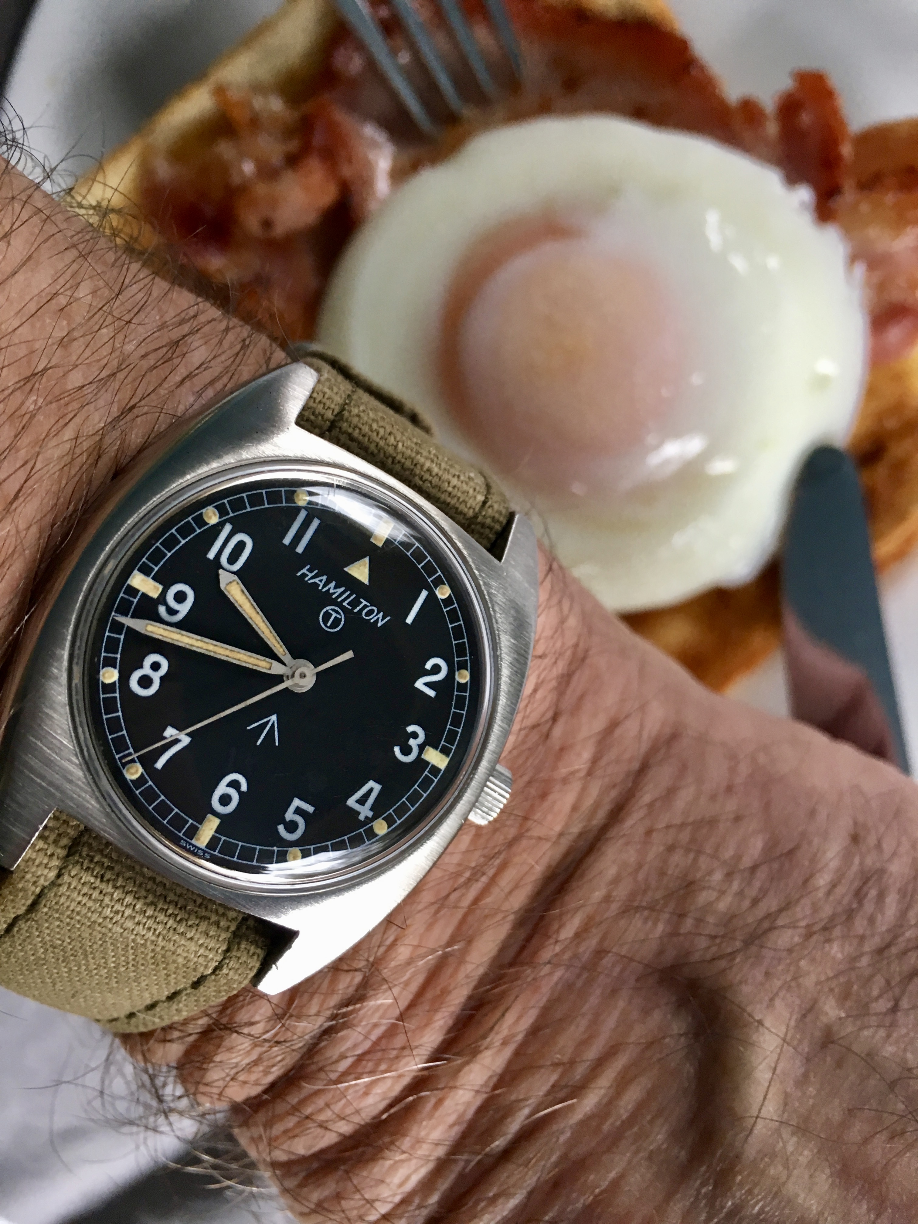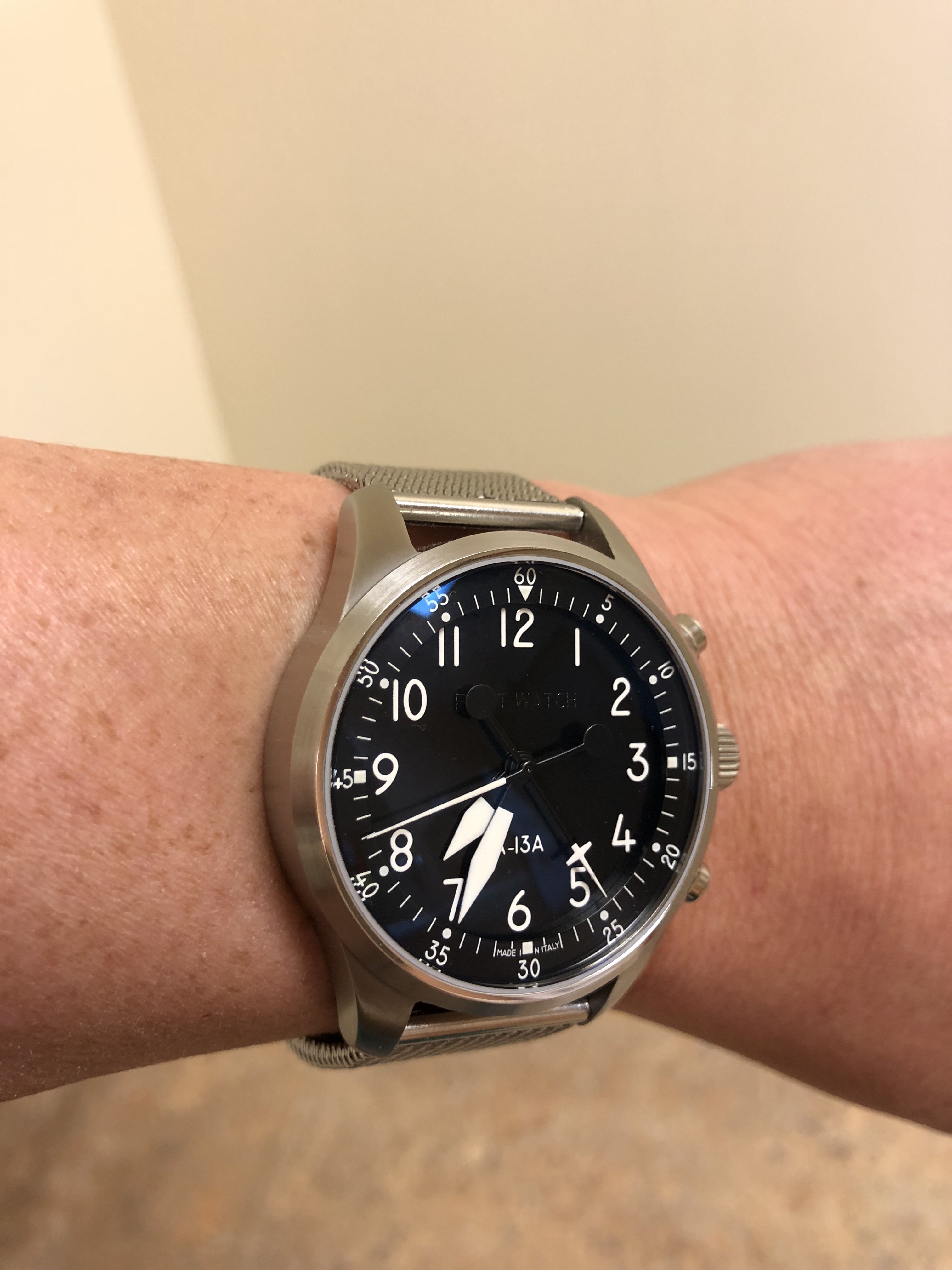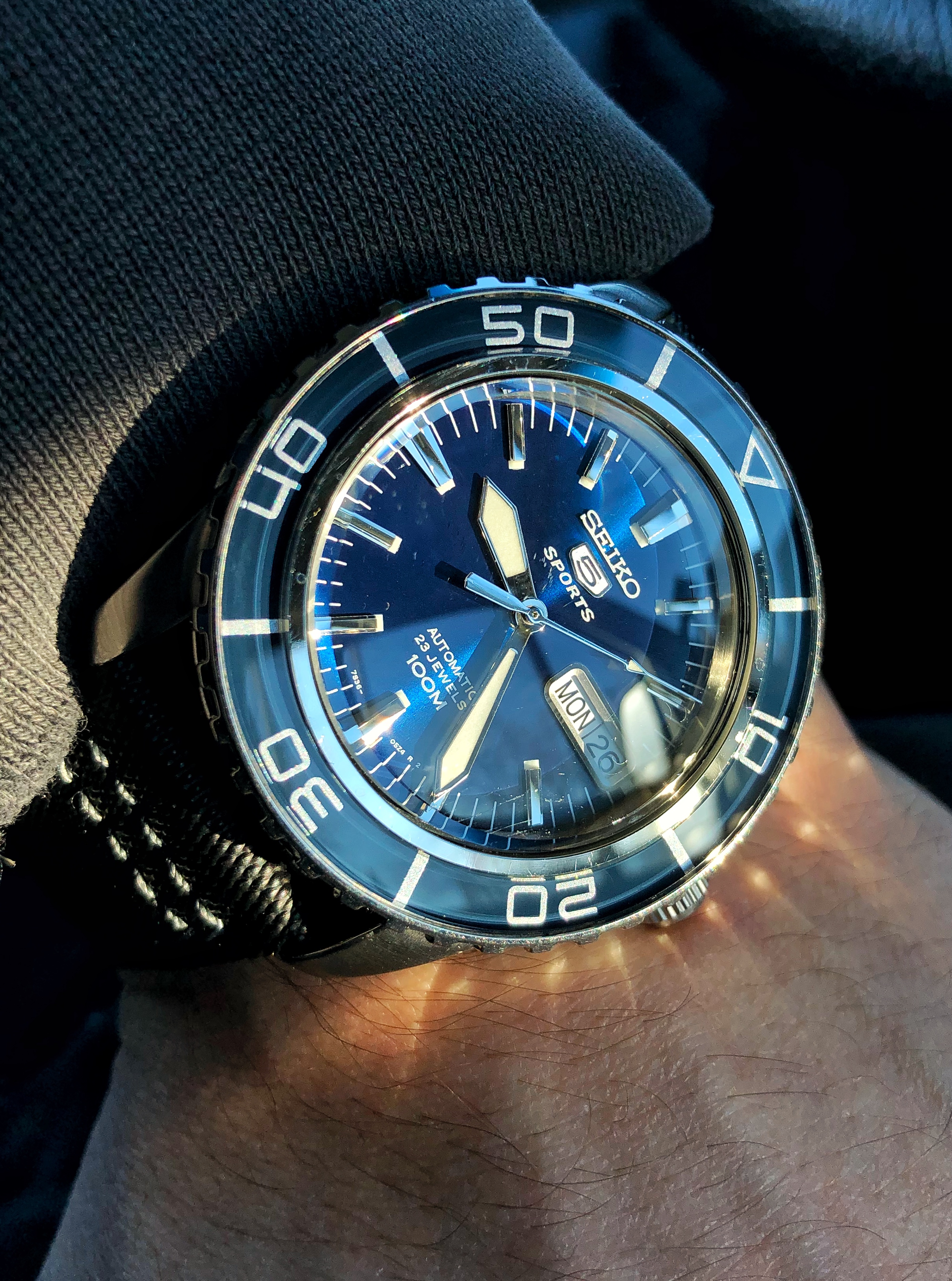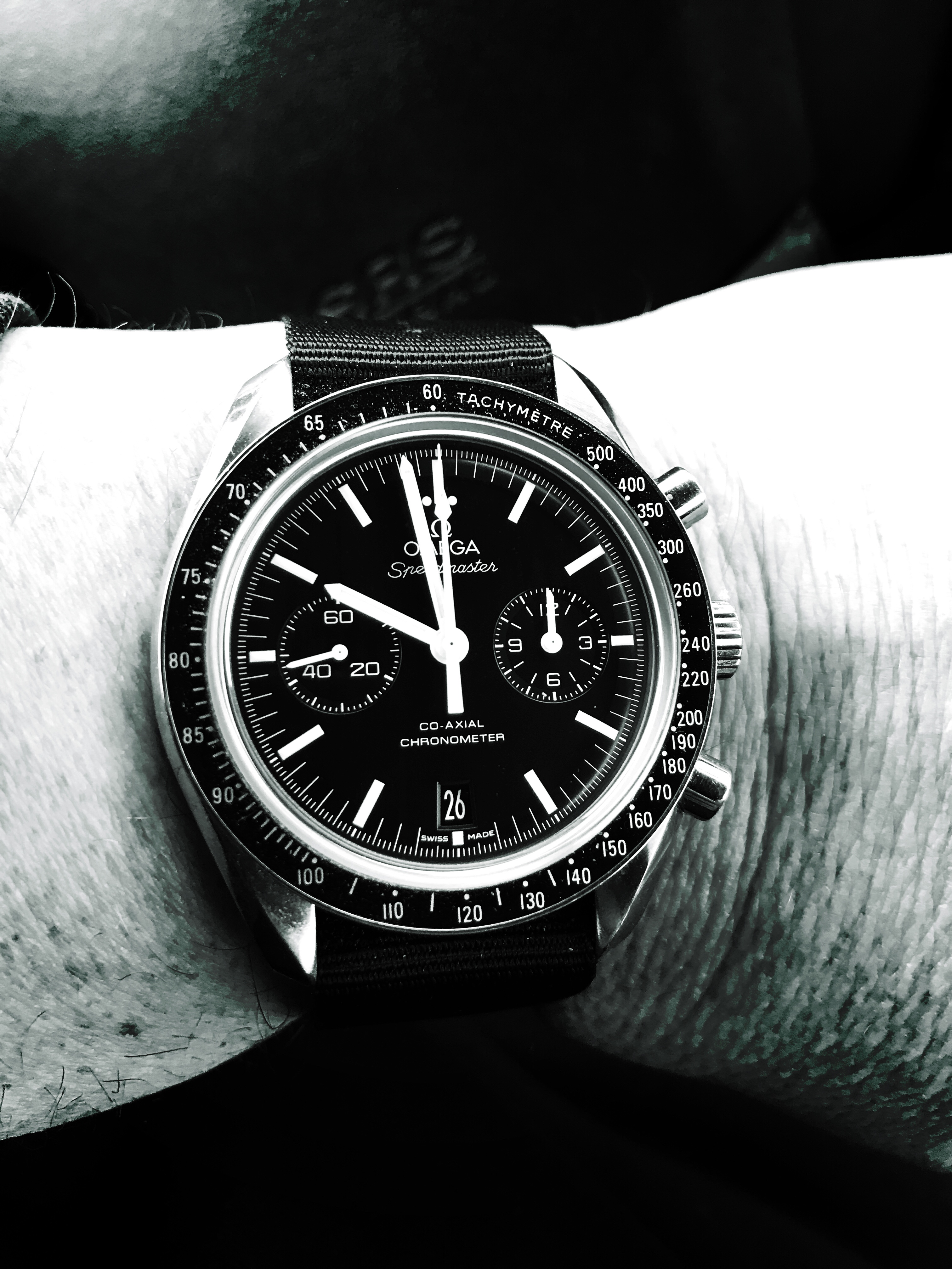 But I’m back to Speedy Monday. Strap by WatchGecko, the nylon Zulu Diver. 44.25mm co-axial Moonwatch Chrono with 9300 movement. Love the size on my 7 3/4” wrist. Huge difference vs the 40mm Rolex. I used Enlight’s photo editor app for iOS (free right now) to apply a b/w filter.
