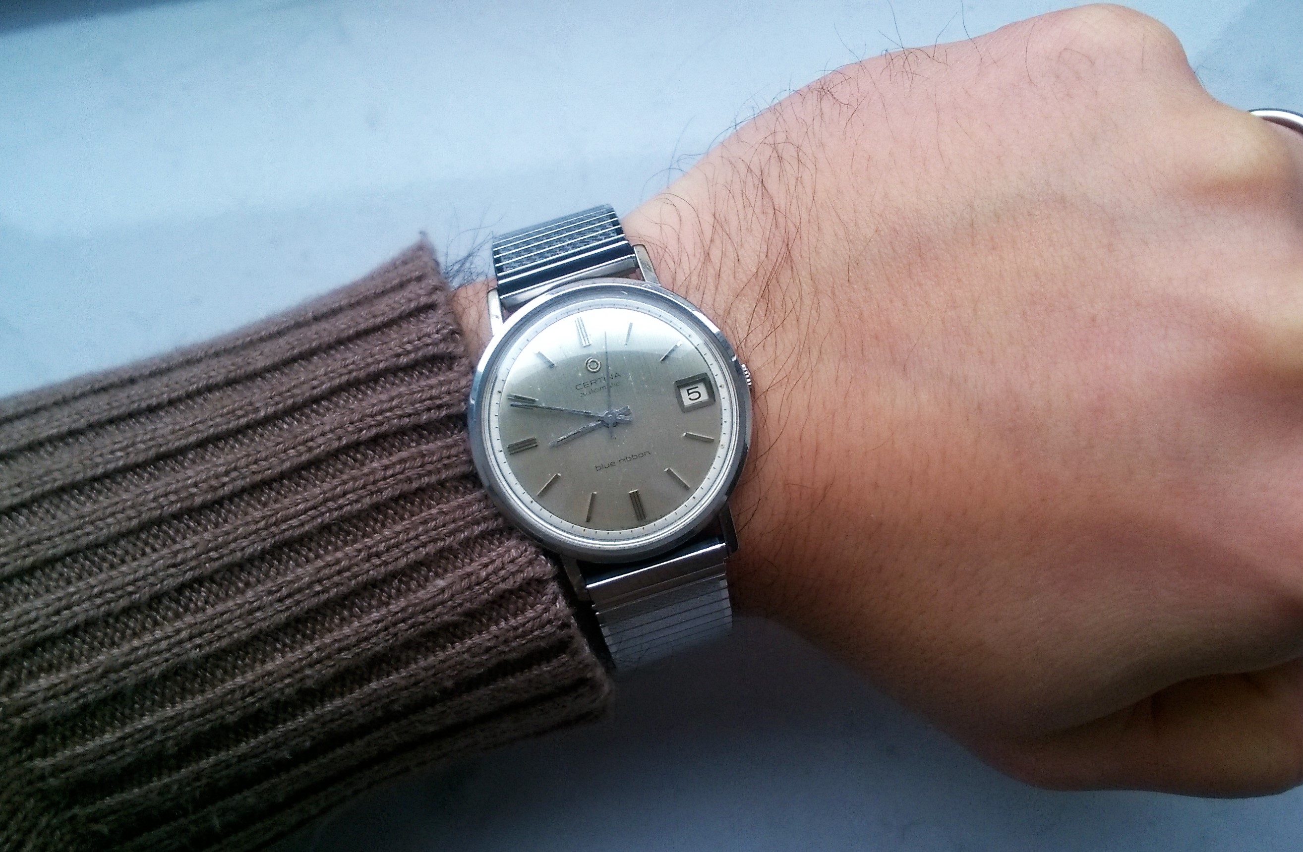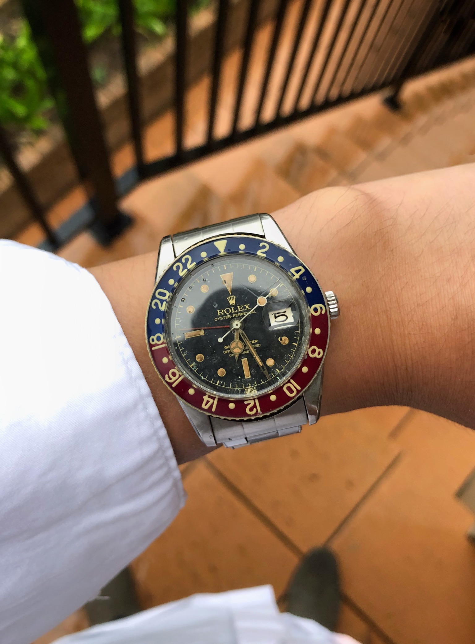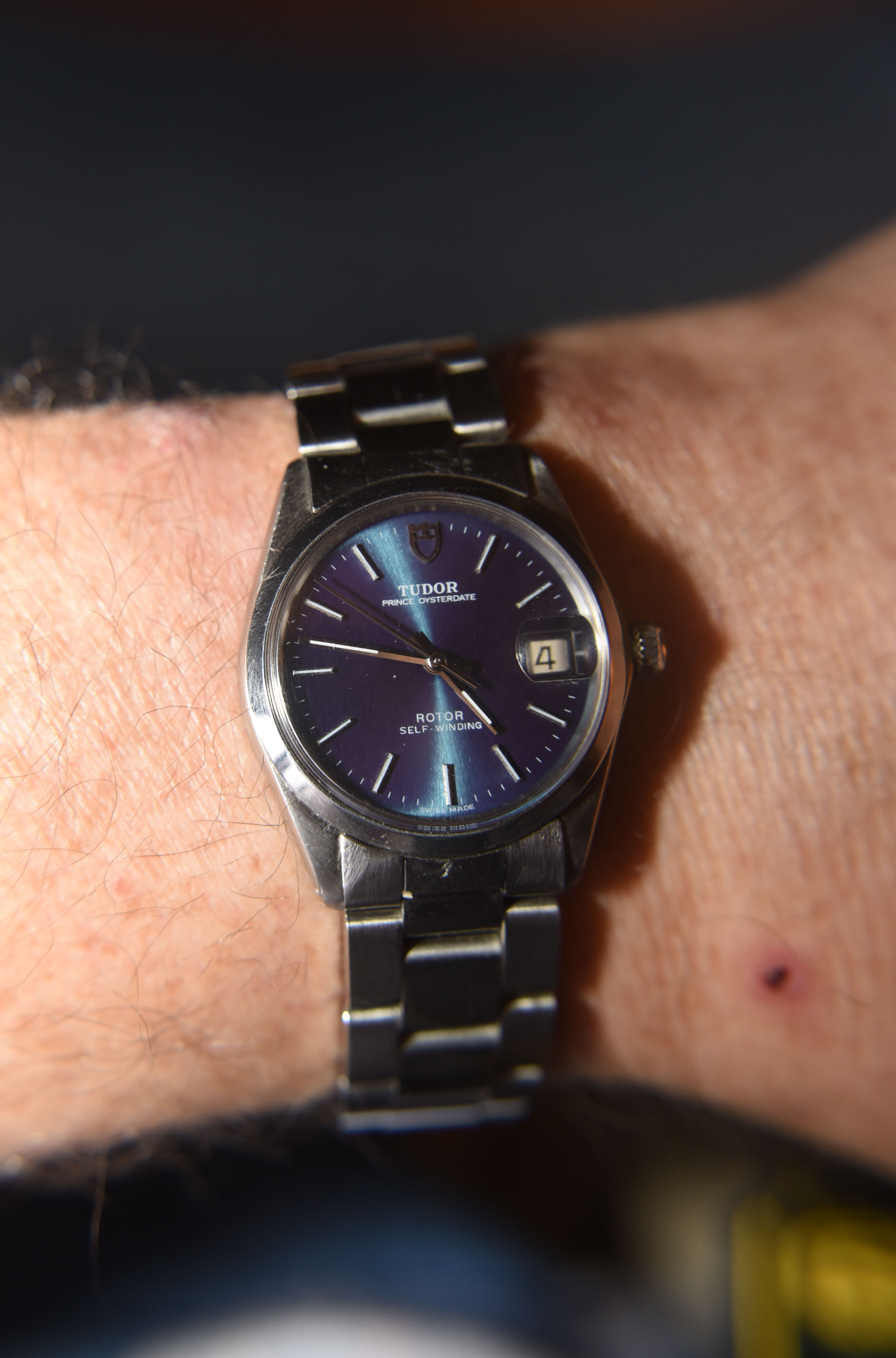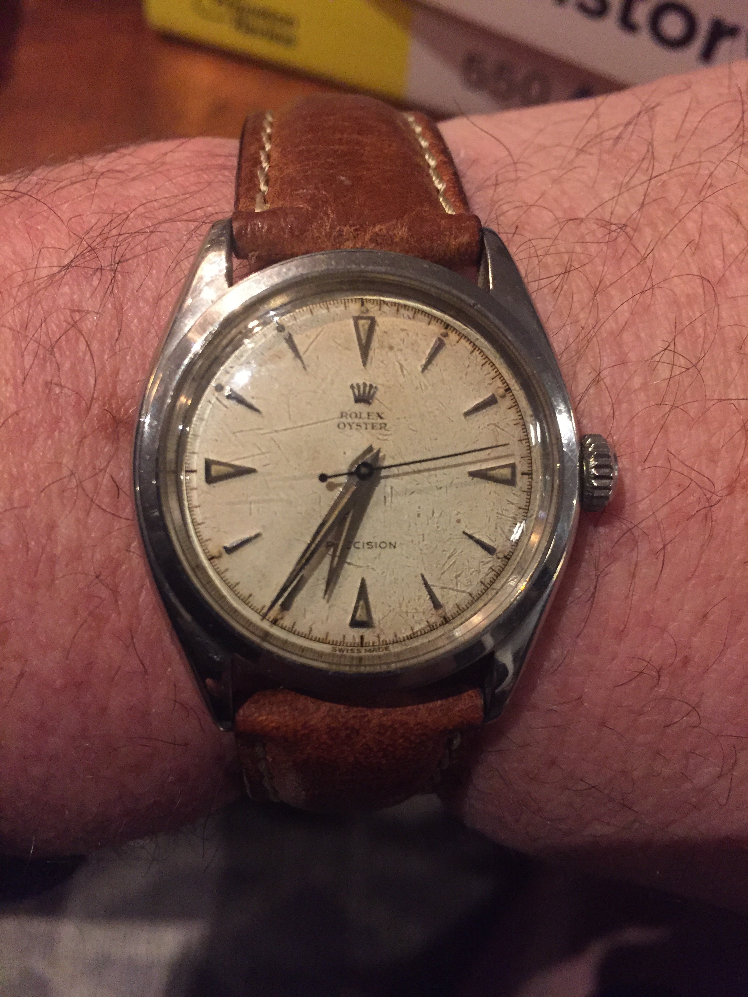 Had to get a proper bracelet for it my jeweler had a 19mm Rolex and extra links to fit my giant wrist, I all that to see if a 34 mm Rolex would be too small 36mm maybe or should I get new I like vintage but.... oh and excuse the little sore that doesn't go away I have psoriasis TMI I know but don't want y'all to think I have aids...... again!