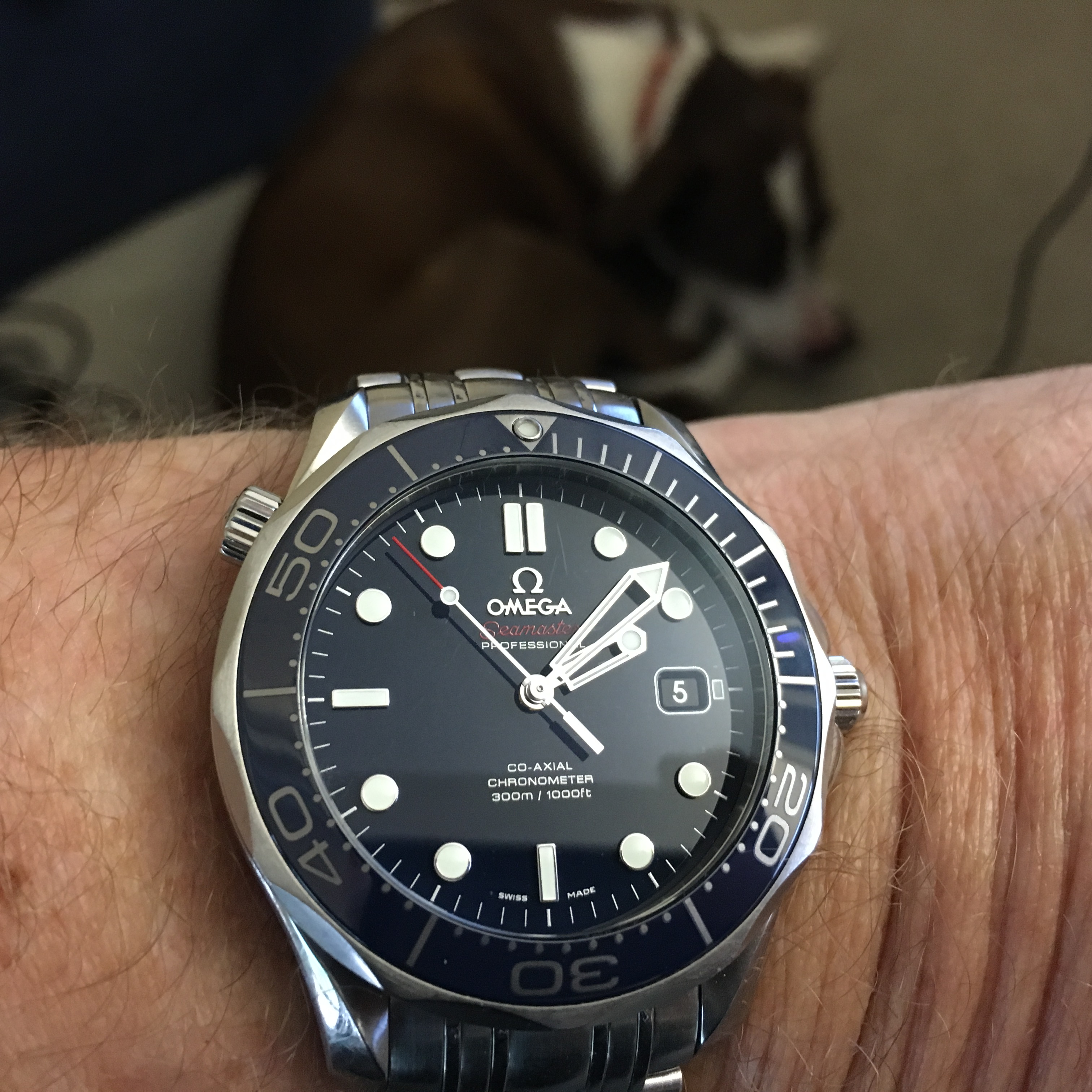 Posts 818 Likes 3,126 jetkins ·Mar 5, 2018 Back from service, the prodigal Seamaster got some wrist time today. Happy to report it's back within spec now, at +1.7spd. Dog #3 thinks all this watch stuff is a yawn. Edited: Mar 5, 2018